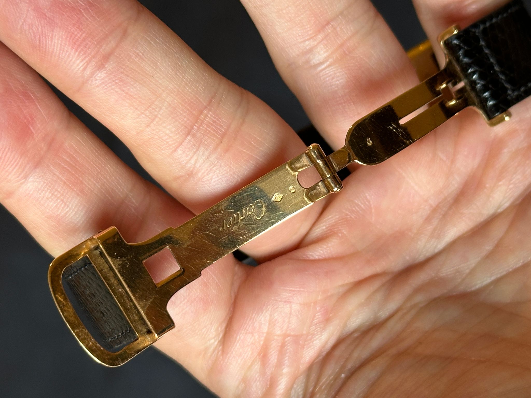 Classic and iconic 18 karat gold Tank Louis Cartier from the mid-1970s with gold hands, Paris dial, and correct deployant buckle.