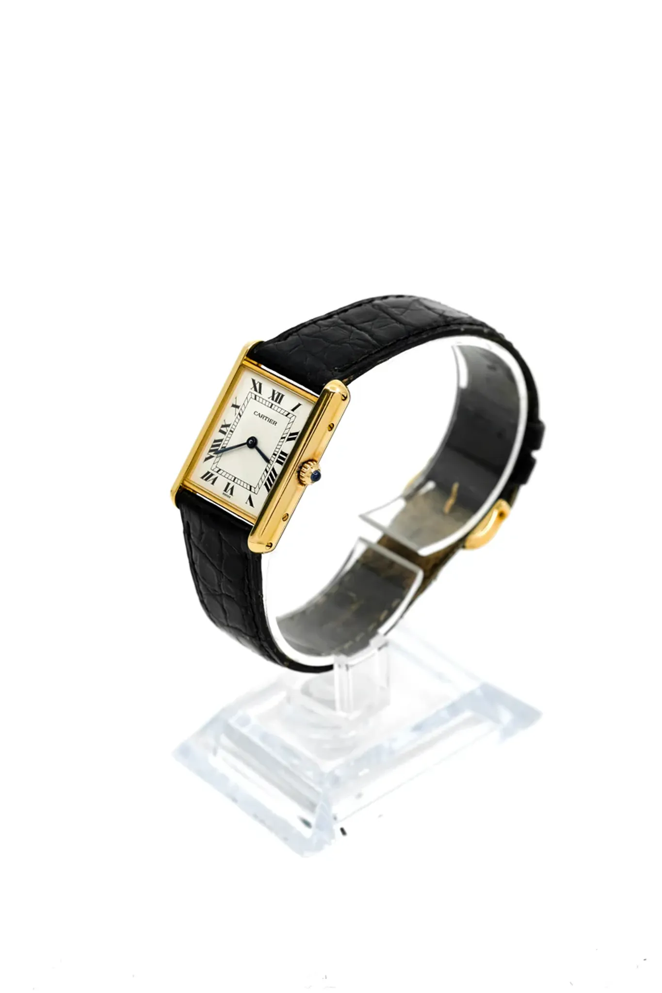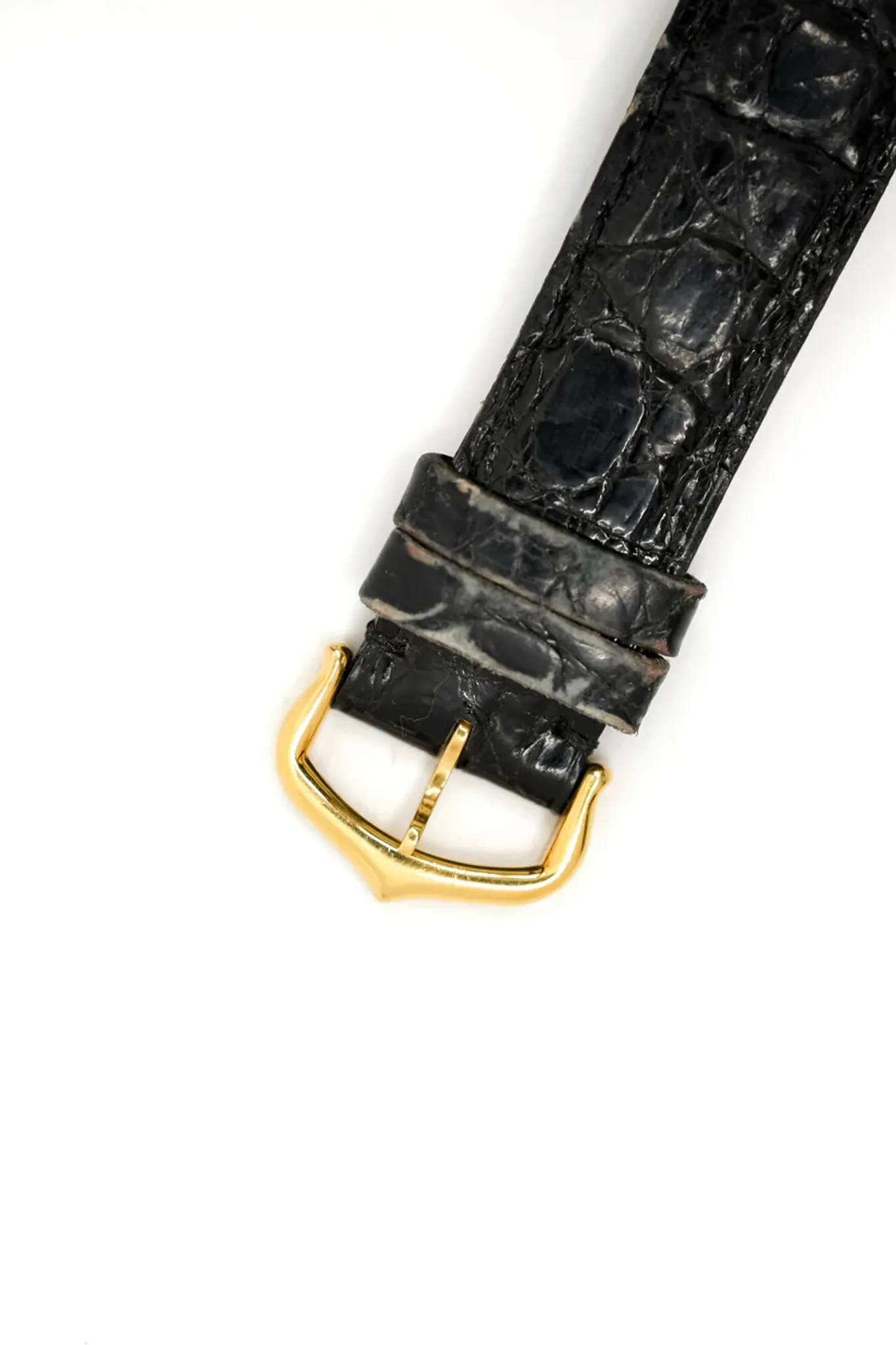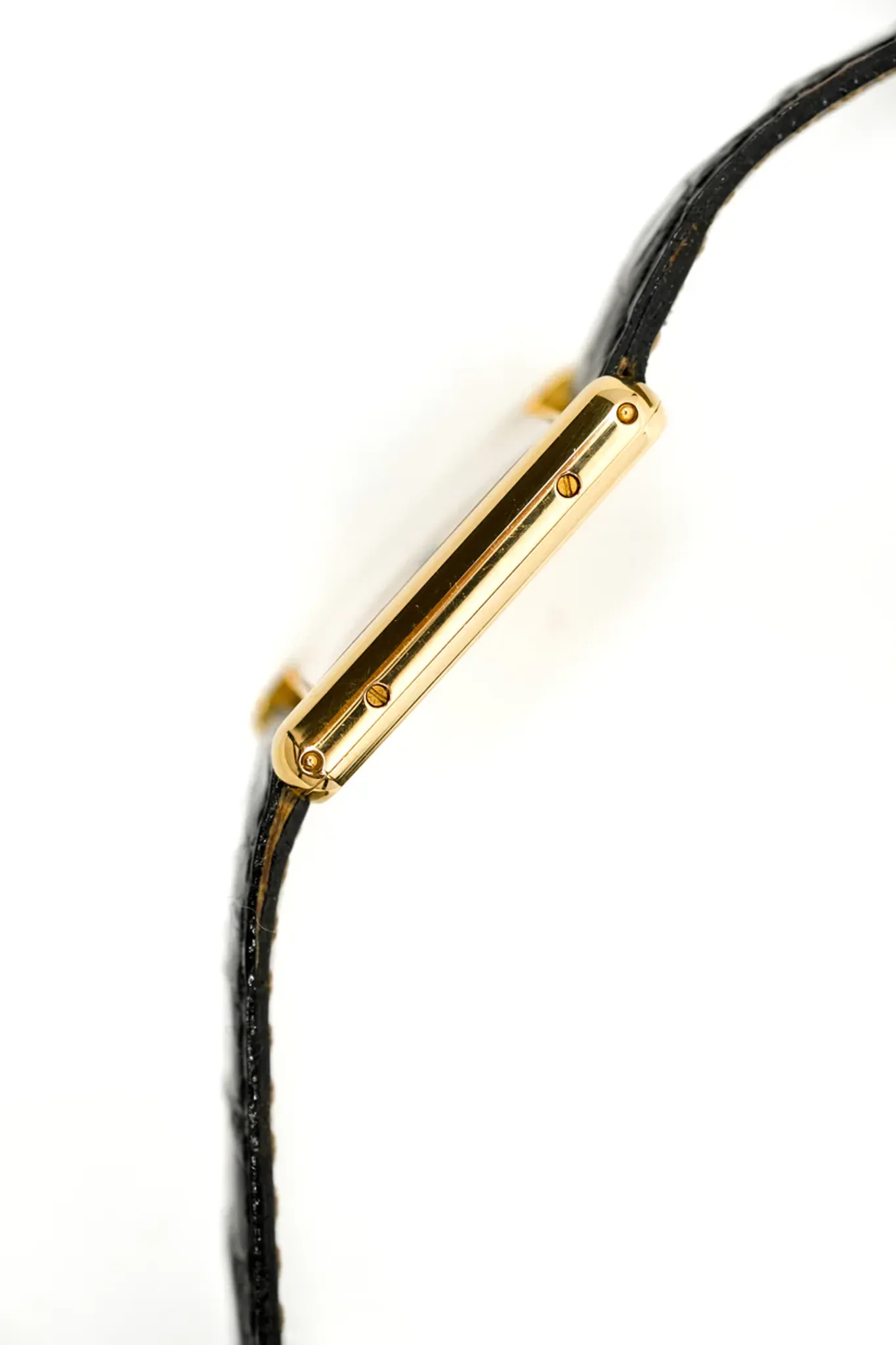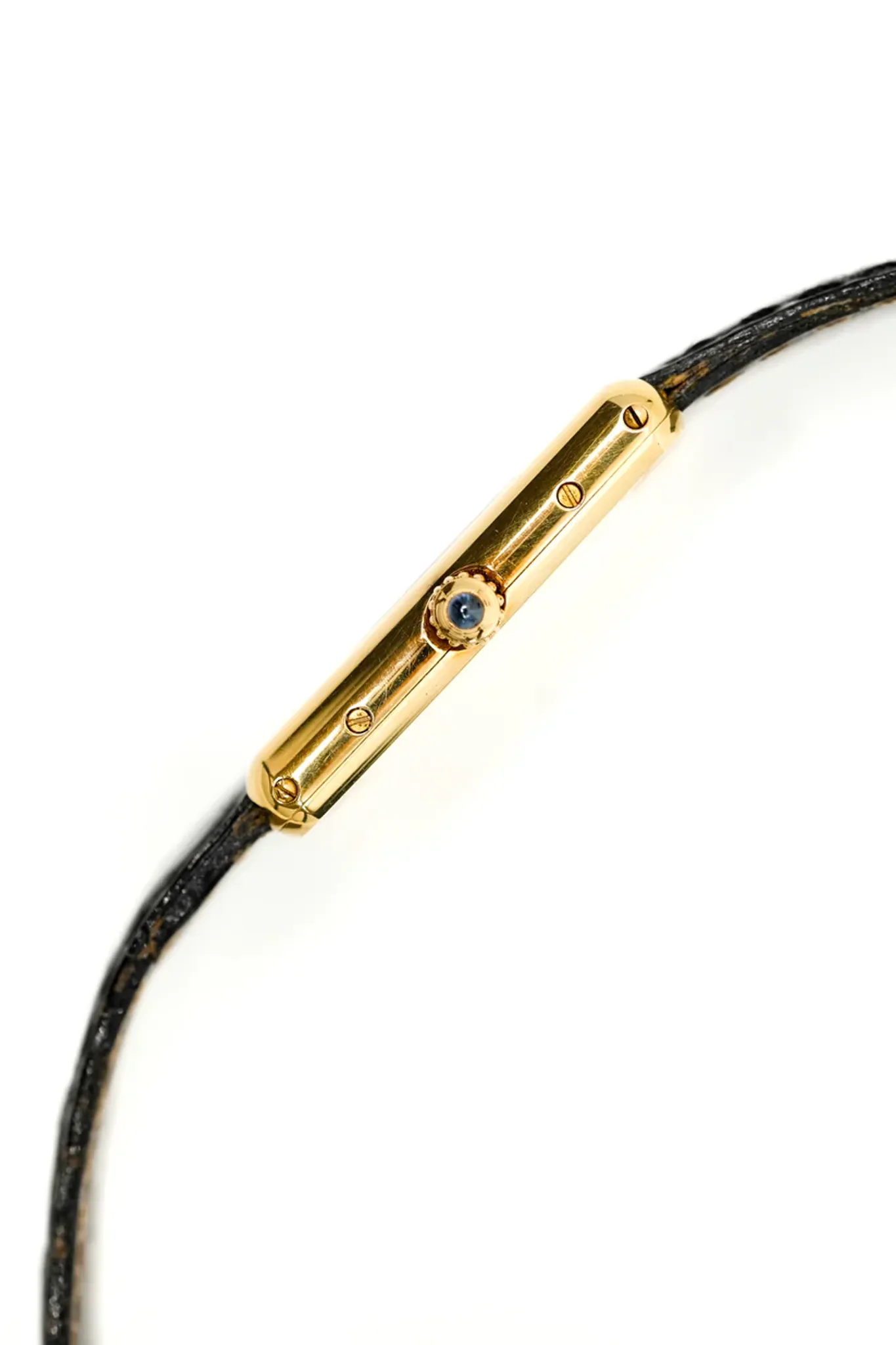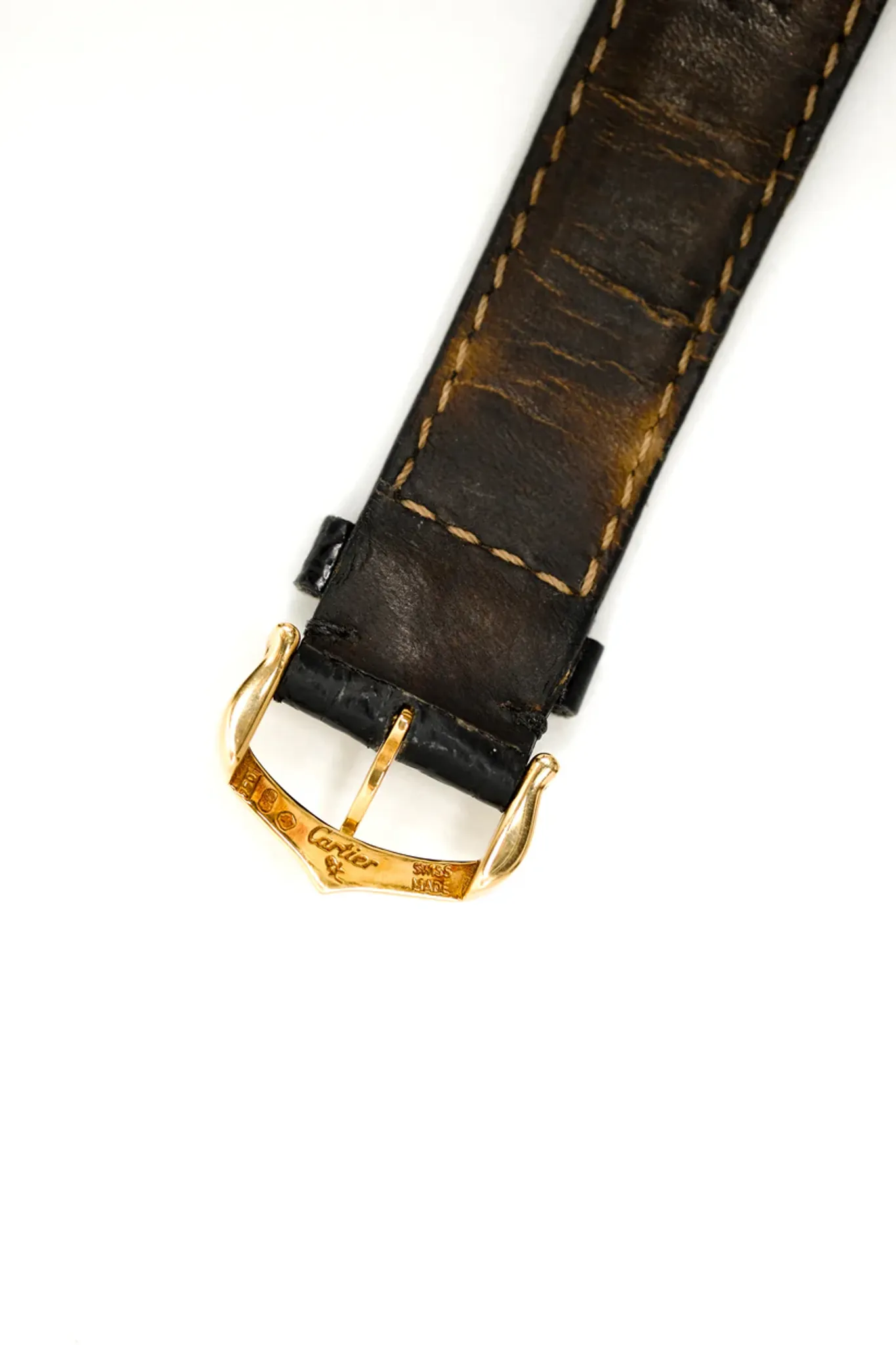 Cartier case and pin buckle in 18K yellow gold. Cartier strap in black alligator leather (worn). Quartz watch whose battery was changed before sale. Movement serviced and guaranteed for 1 year.