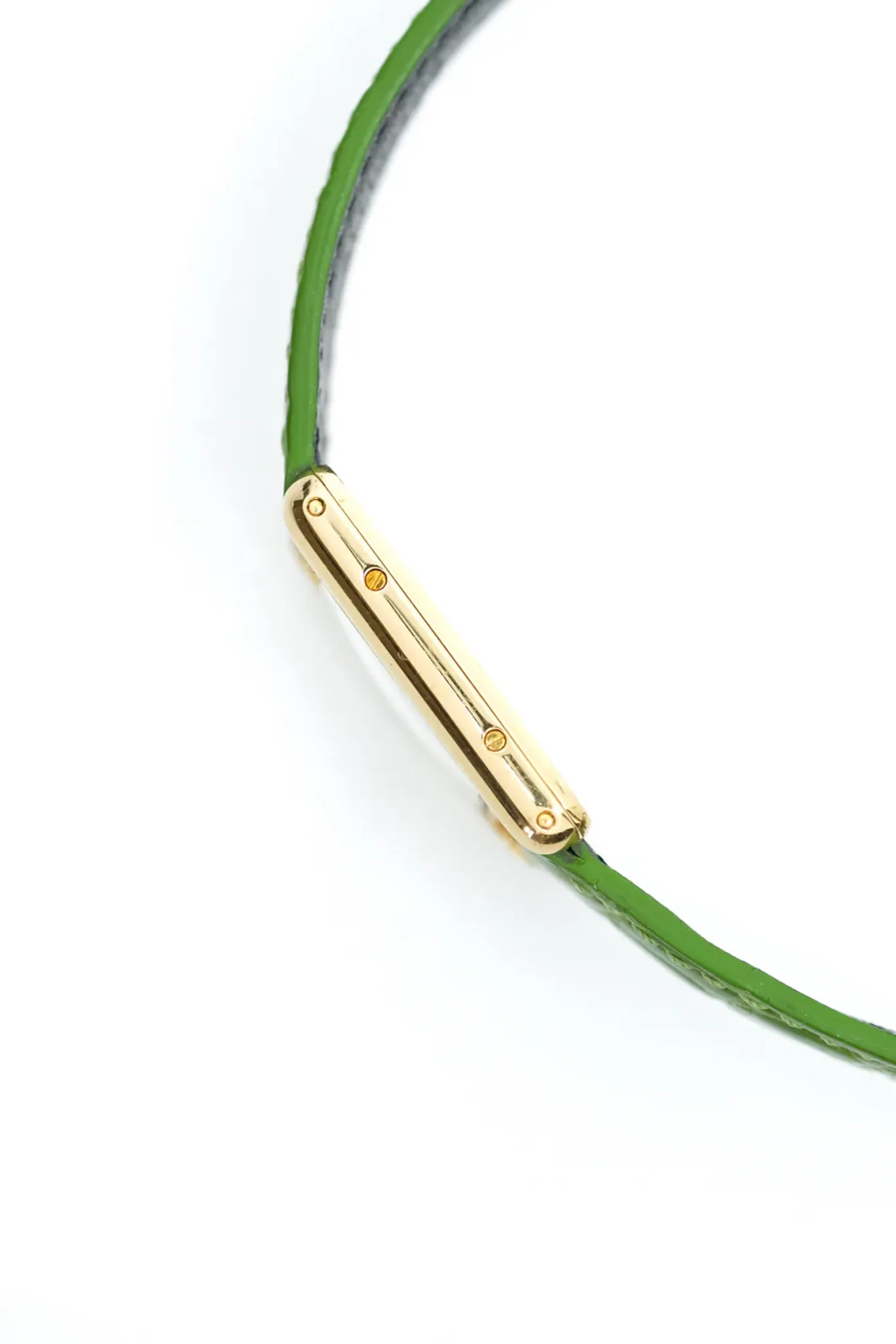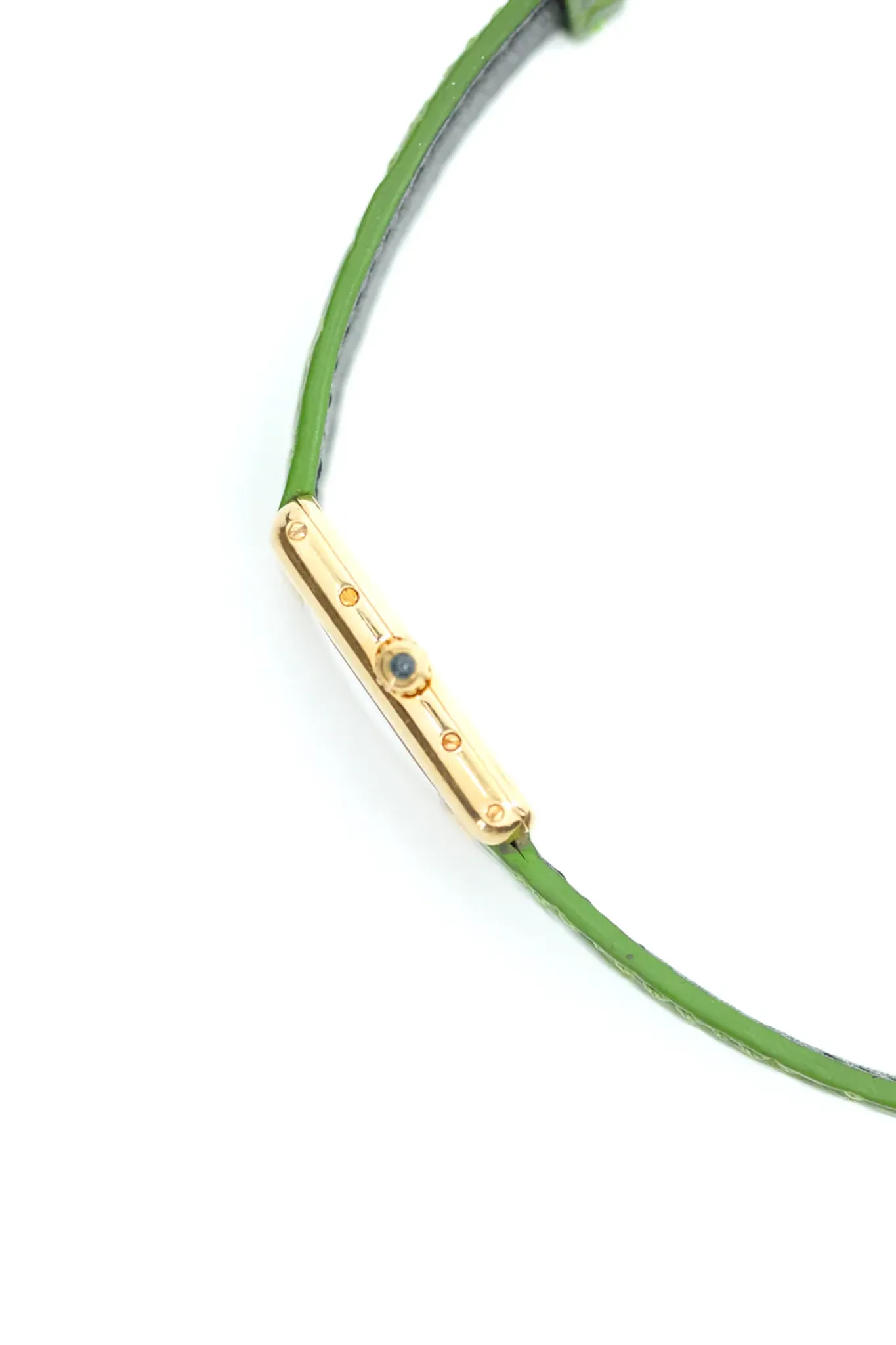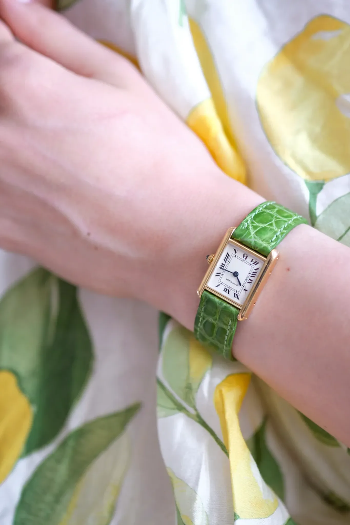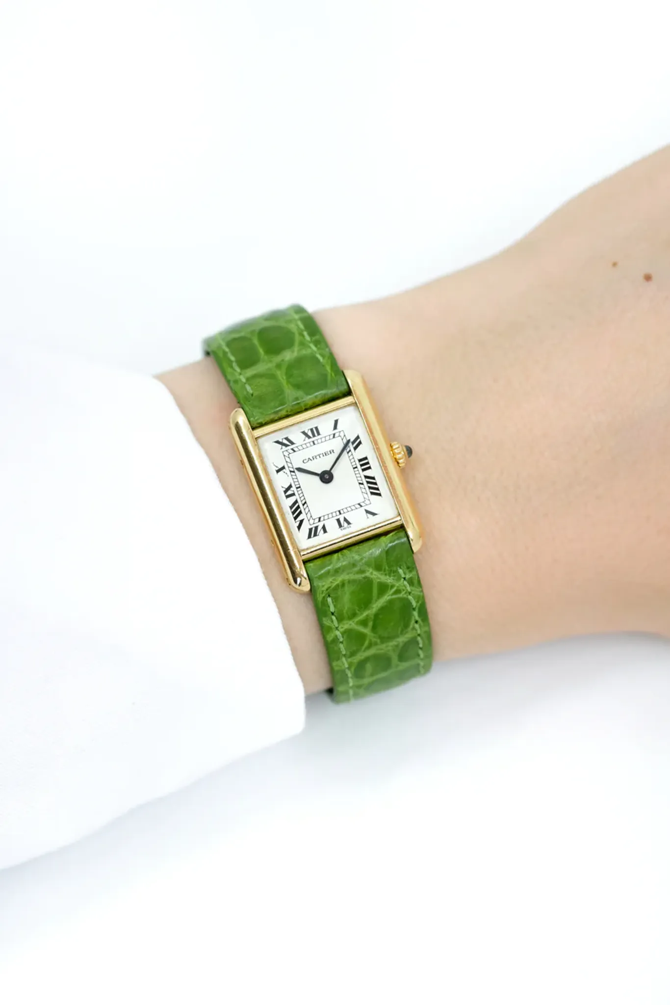 18-carat yellow gold case. Gold-plated Cartier pin buckle. Unsigned green alligator leather strap.