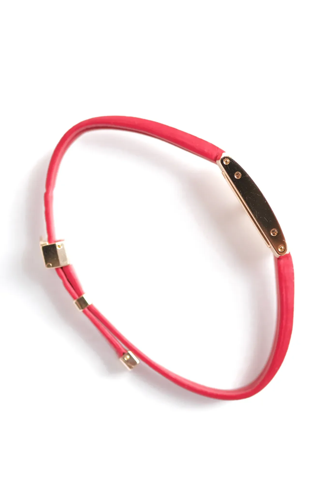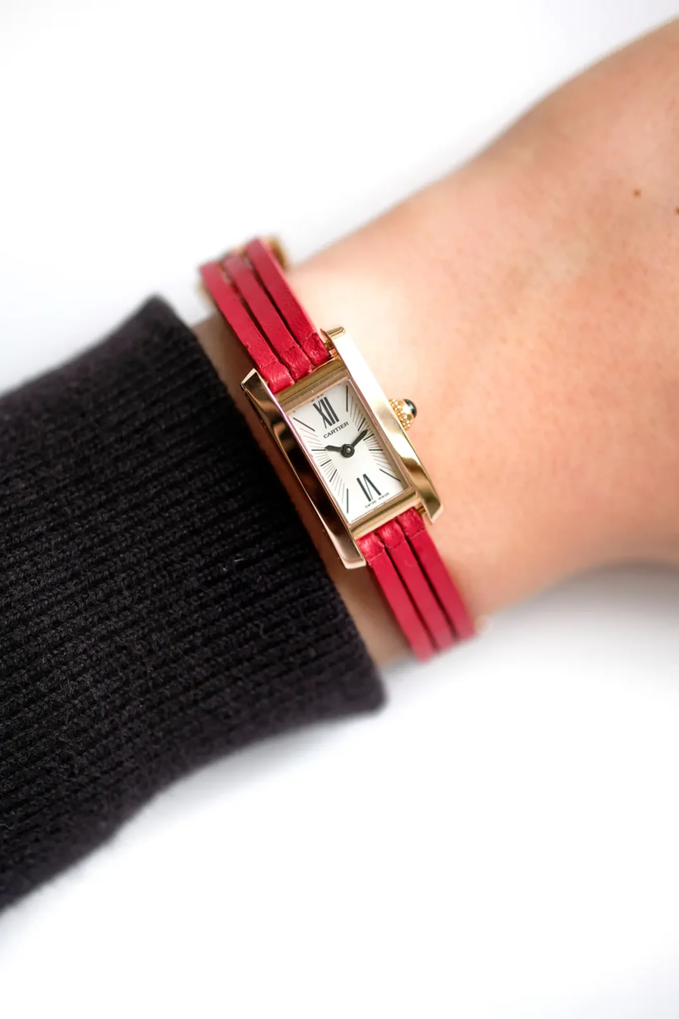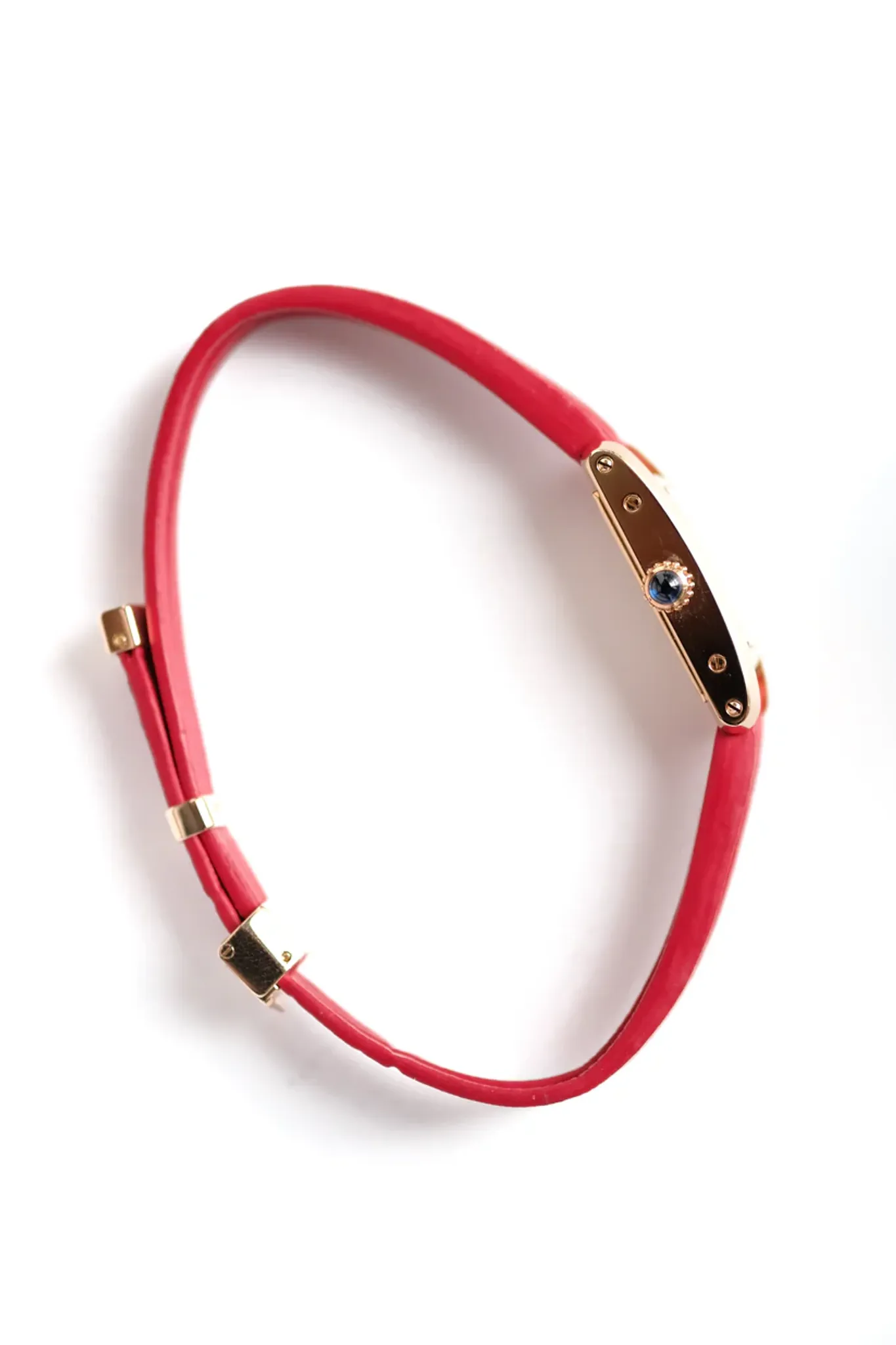 Finally, the strap of this watch is what makes it so charming. Three red leather straps delicately assembled by a Cartier clasp in rose gold.