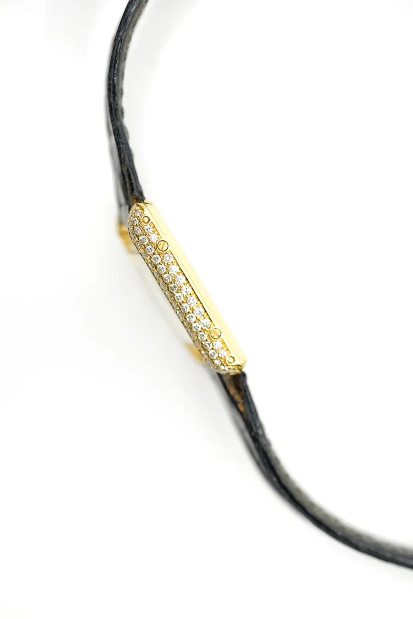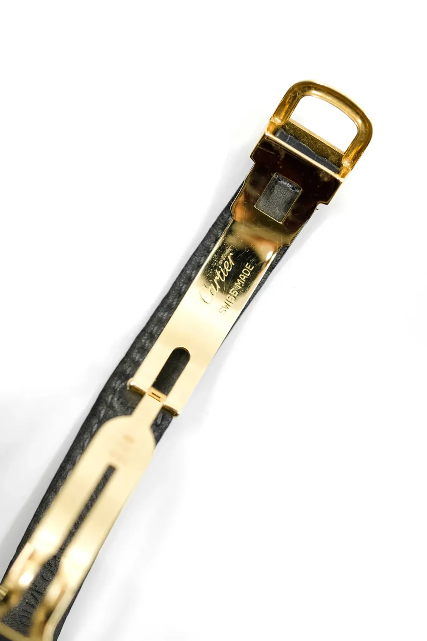 18K yellow gold and diamond case. Cartier 18K yellow gold folding clasp. Adjustable Cartier navy blue alligator leather strap. With papers.