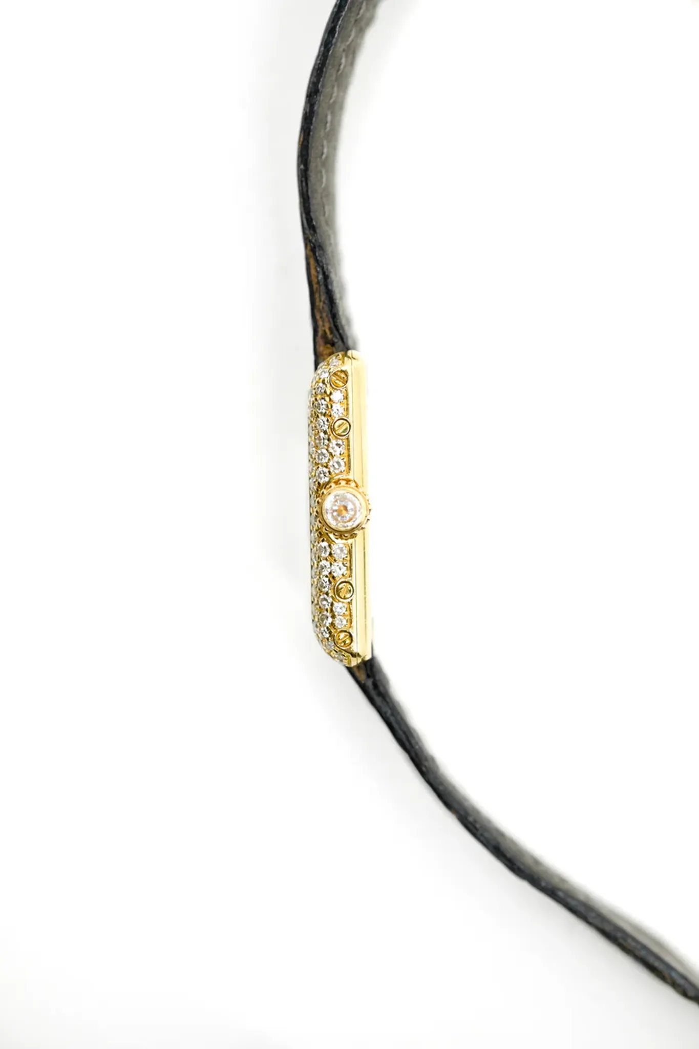 This is the case of this superb Tank Mini in white gold and diamonds. A cocktail watch par excellence due to its size, finesse and materials. Even the cabochon is set with an inverted diamond. The original leather strap, adjustable, is on a white gold folding clasp: comfort and aesthetics are essential!