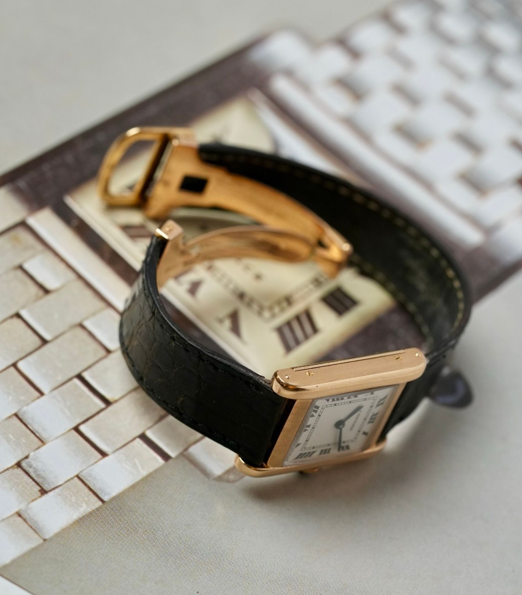 The watch is cased in solid 18k yellow gold. While previously polished, the case retains strong definition, with thick brancards and sharp geometry throughout. It’s paired with its original 18k yellow gold deployant clasp (16mm).