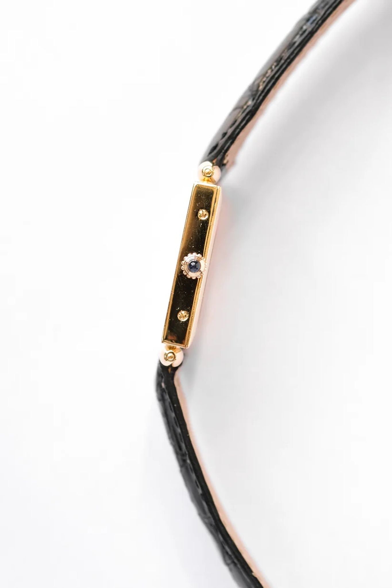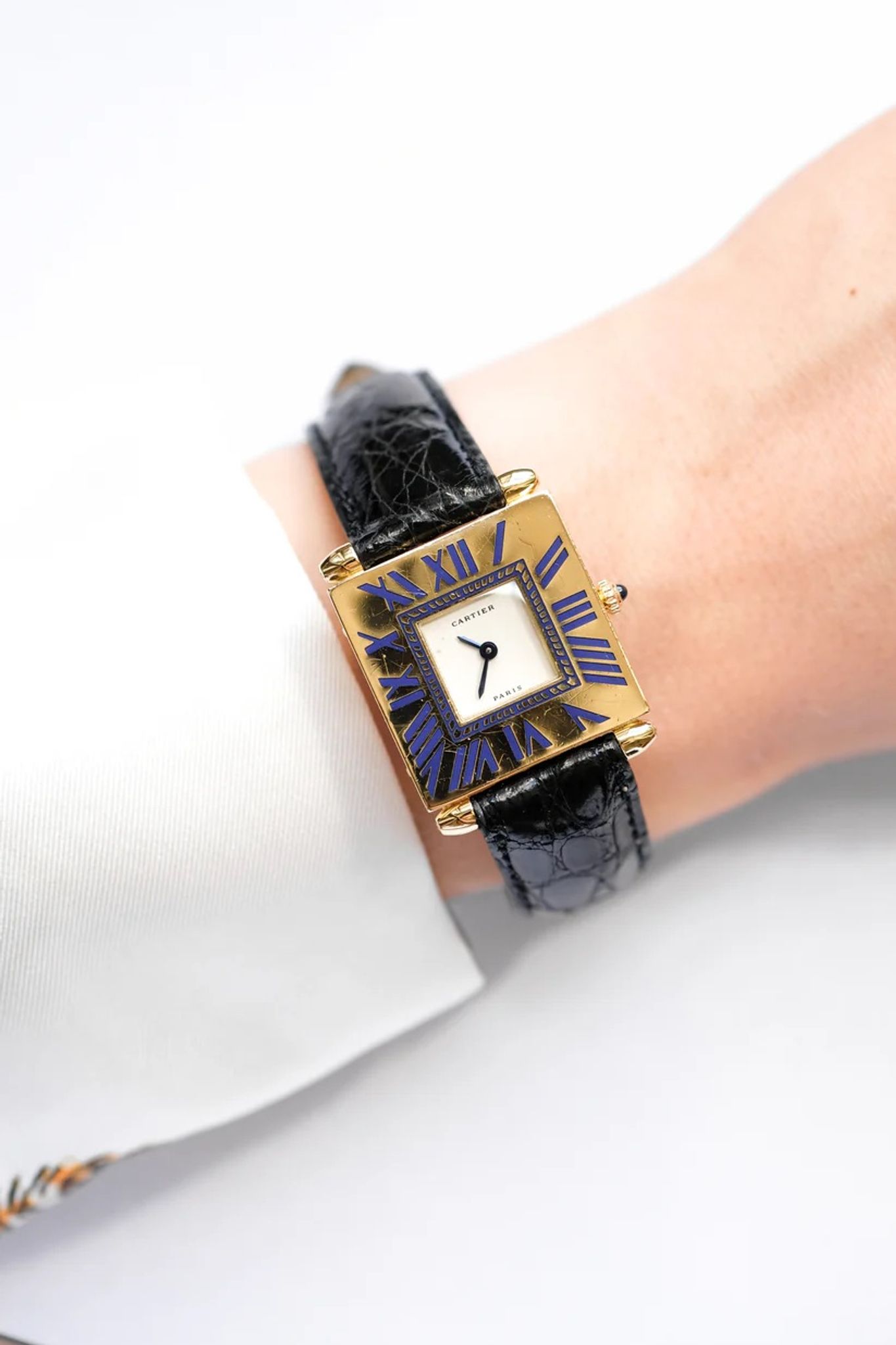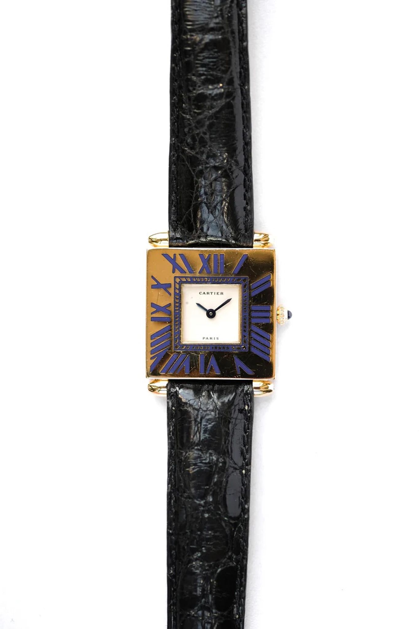 18K yellow gold and blue lacquer case. Gold-plated Cartier pin buckle. Leather strap.