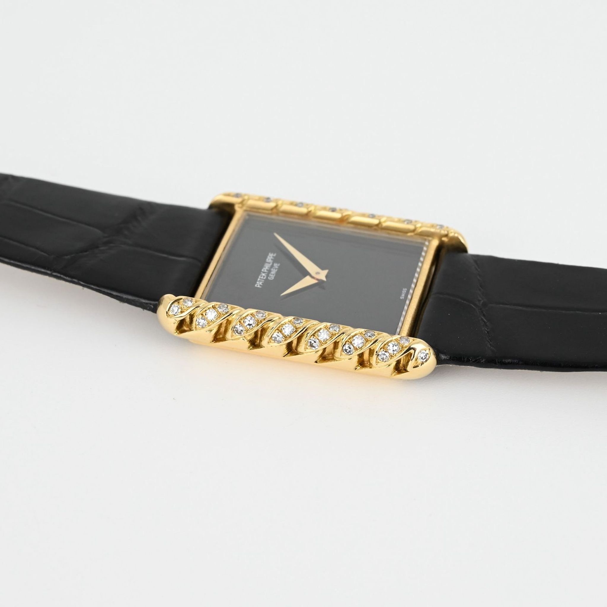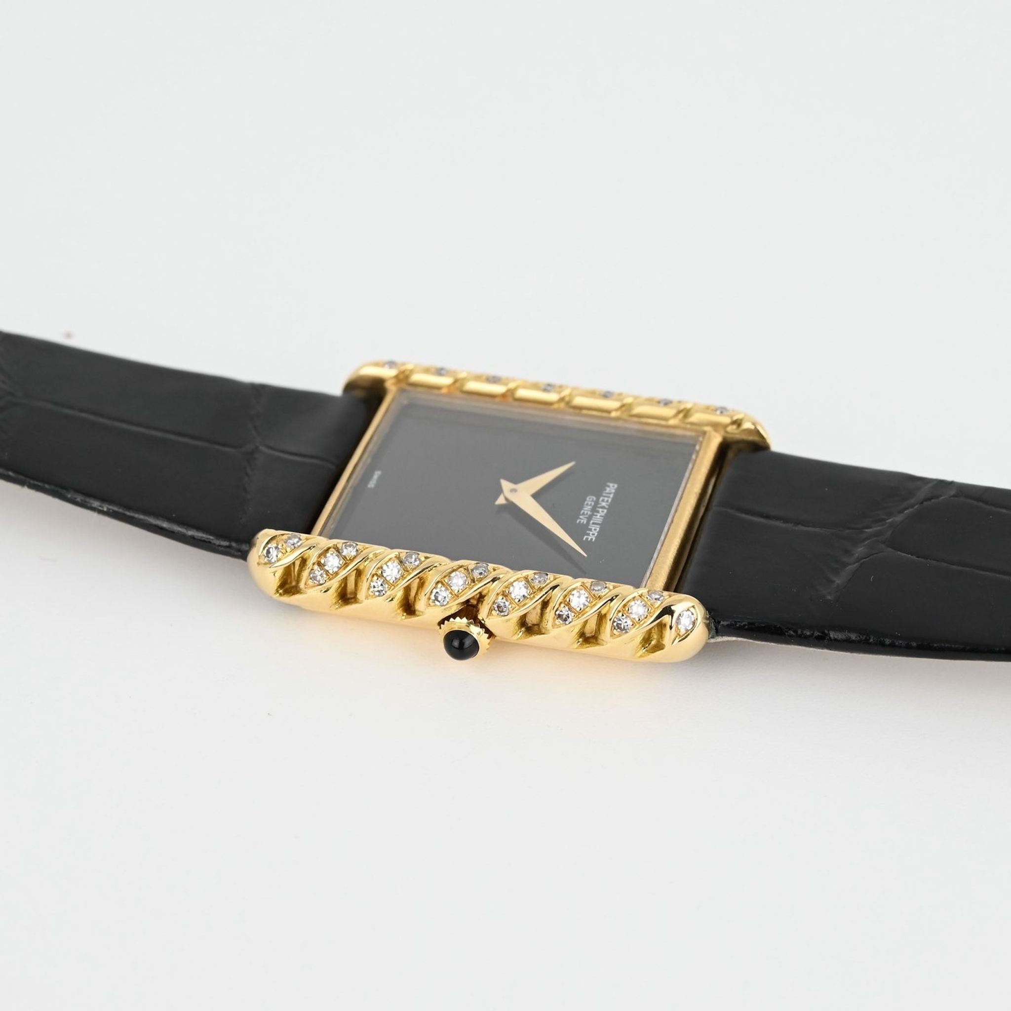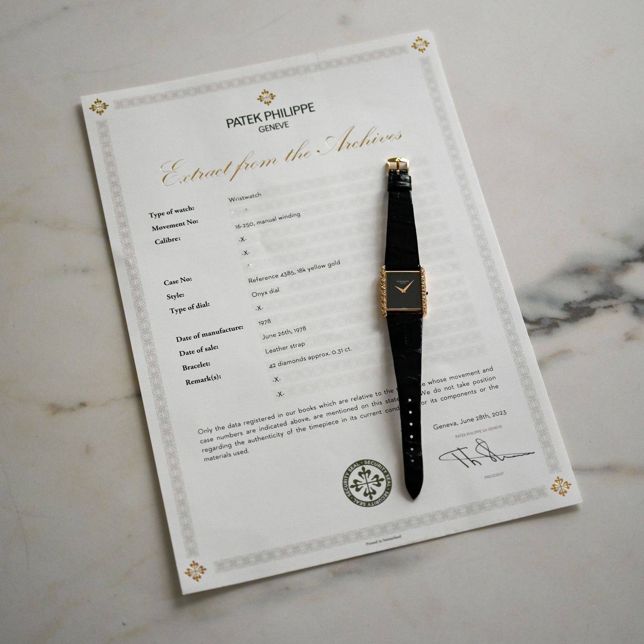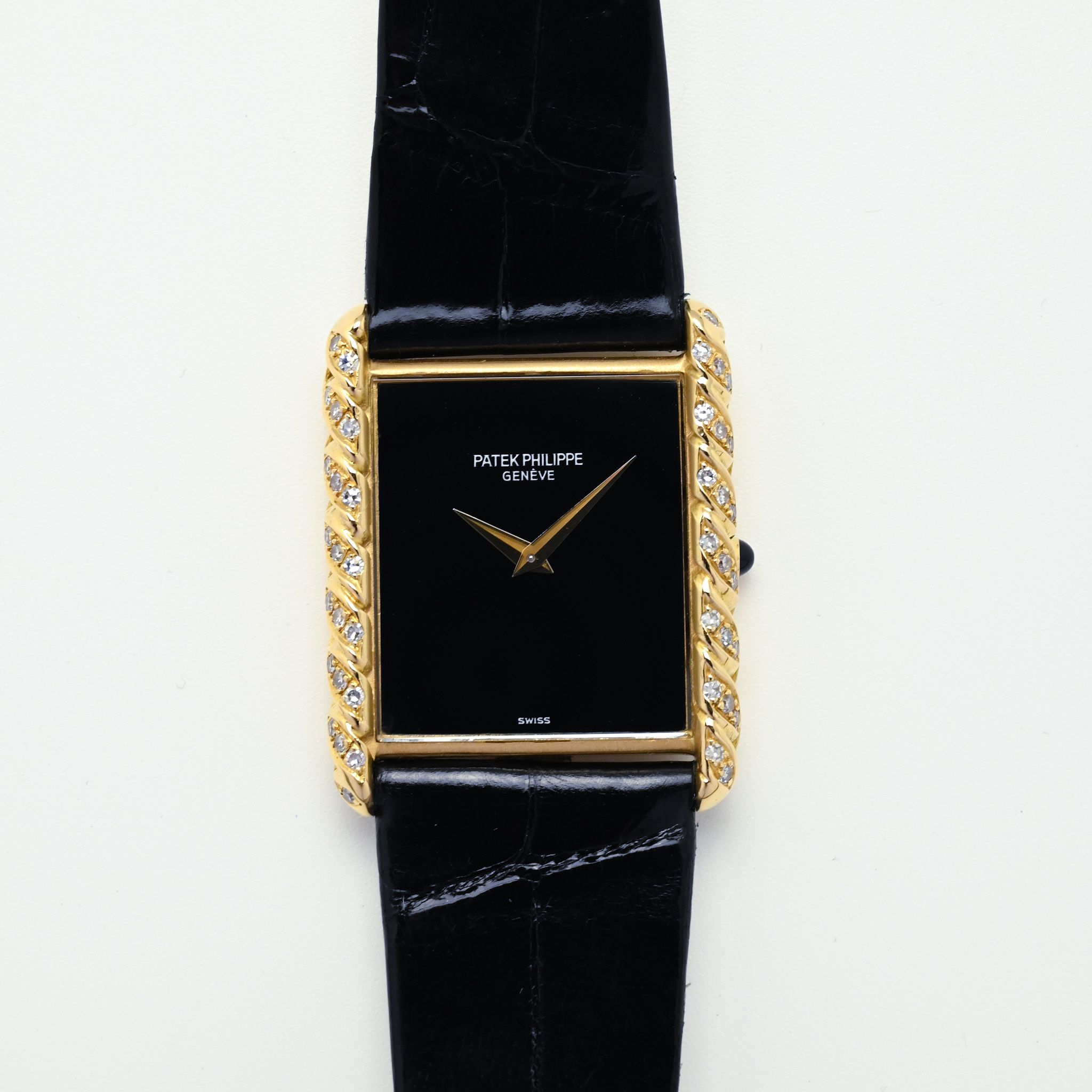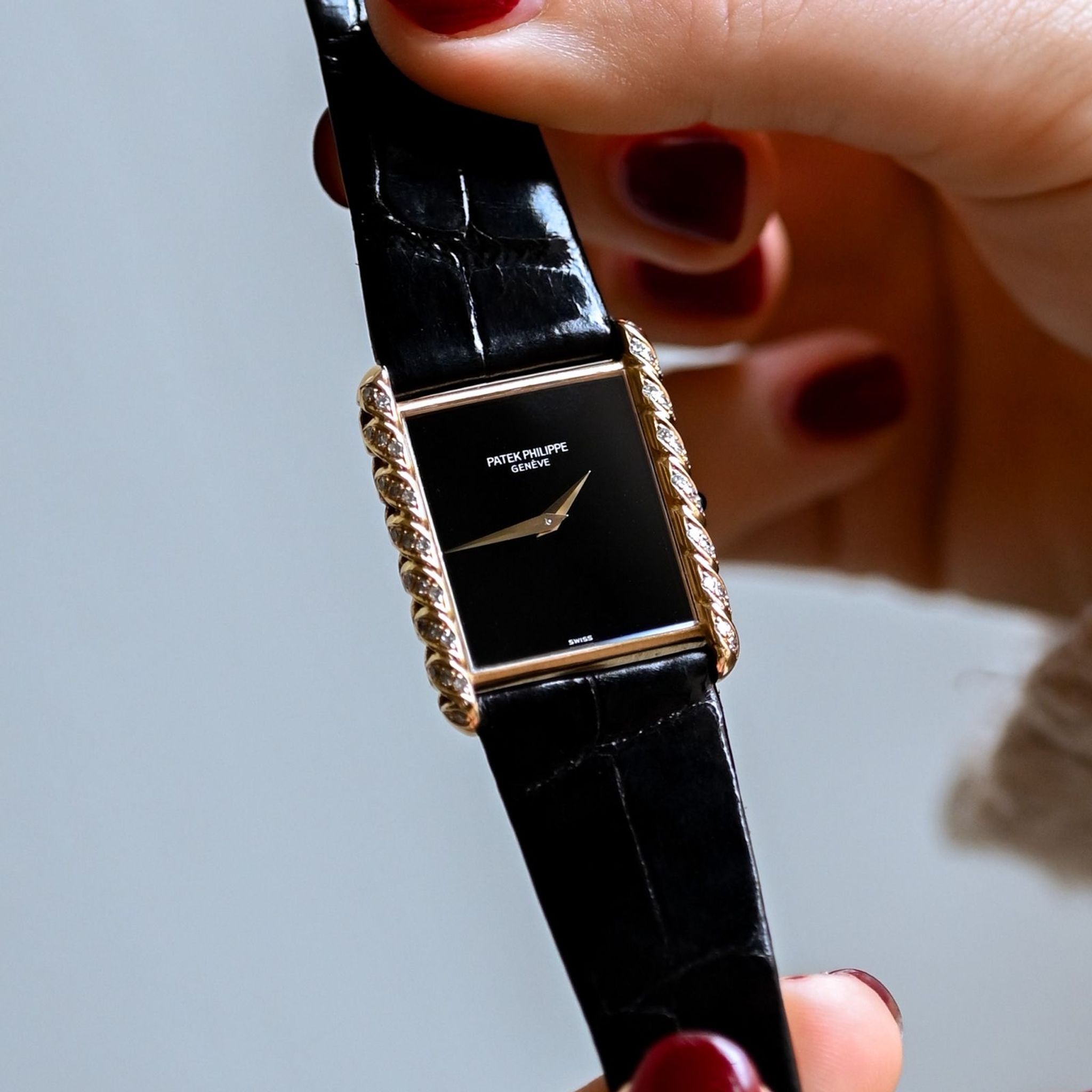 The ref. 4385 featured here has a rectangular case inspired by the Cartier Tank model, but with the sides set with 42 diamonds in a braided pattern. This simple yet atypical design showcases Patek Philippe's expertise with this goldsmith's work on the case. The dial in onyx, a naturally minimalist stone, contrasts with the work on the case, and the black color contrasts with the yellow gold of the case and allows the dauphine hands to stand out for perfect time reading.