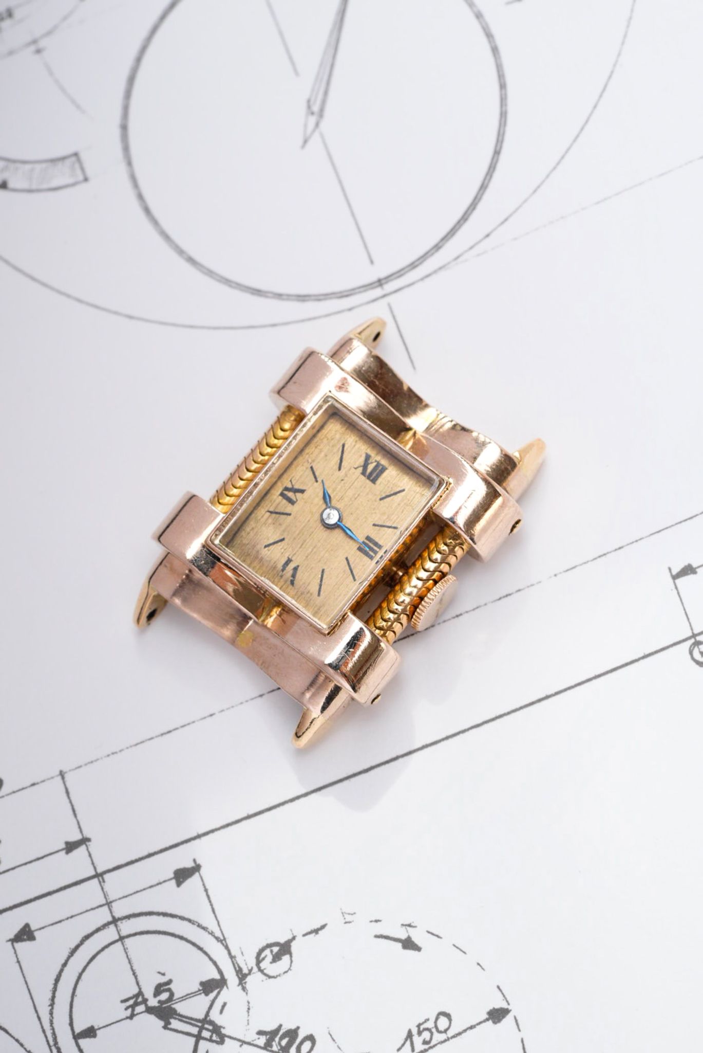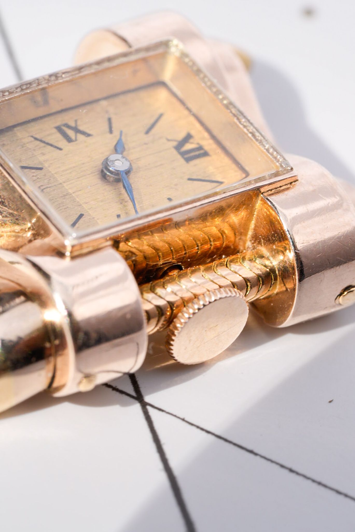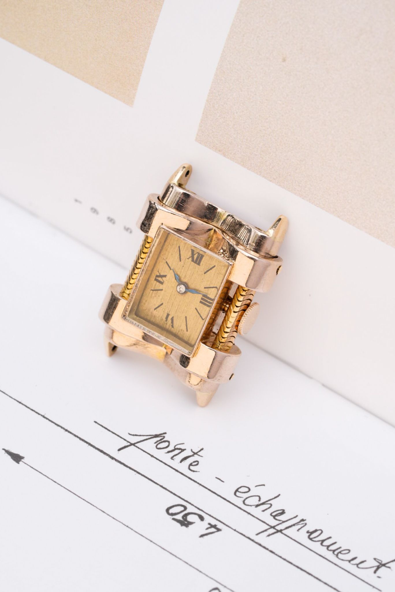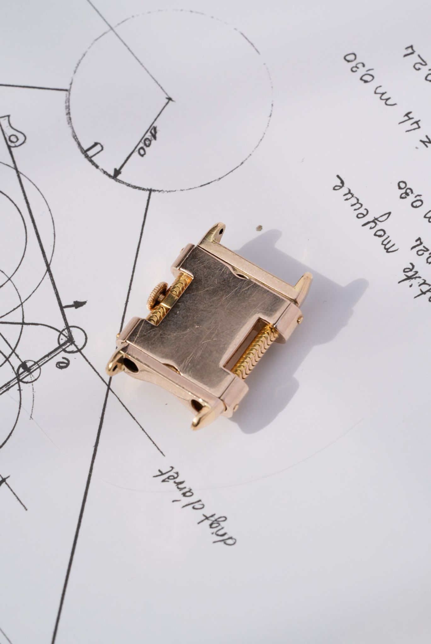 Wristwatch made in France during the Art Deco period from an anonymous manufacturer, which was common practice at the time. Solid rose gold rectangular case measuring 34 × 25 mm, with braided flanks and a beveled lip-shaped design. Fixed lugs integrated into the case.