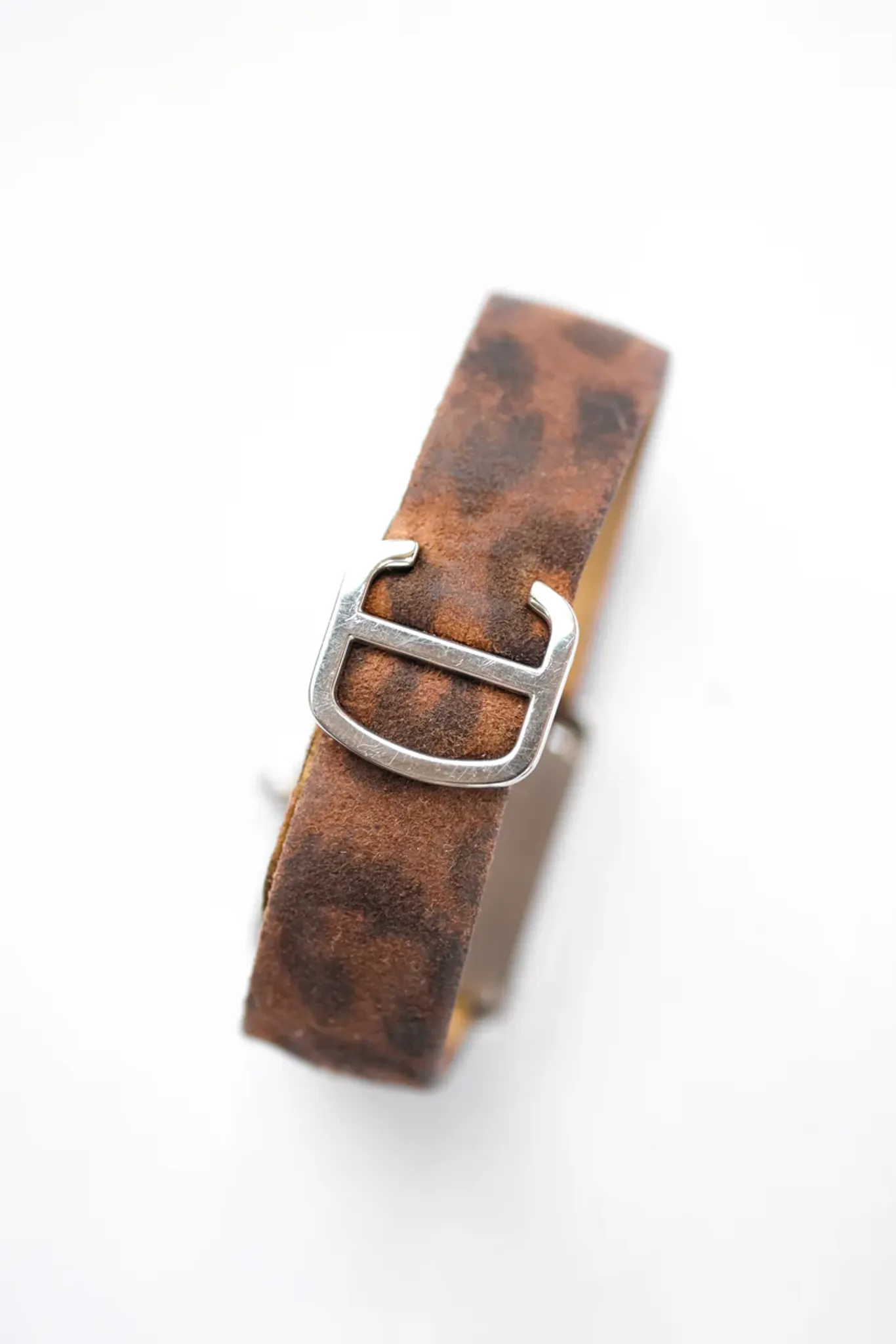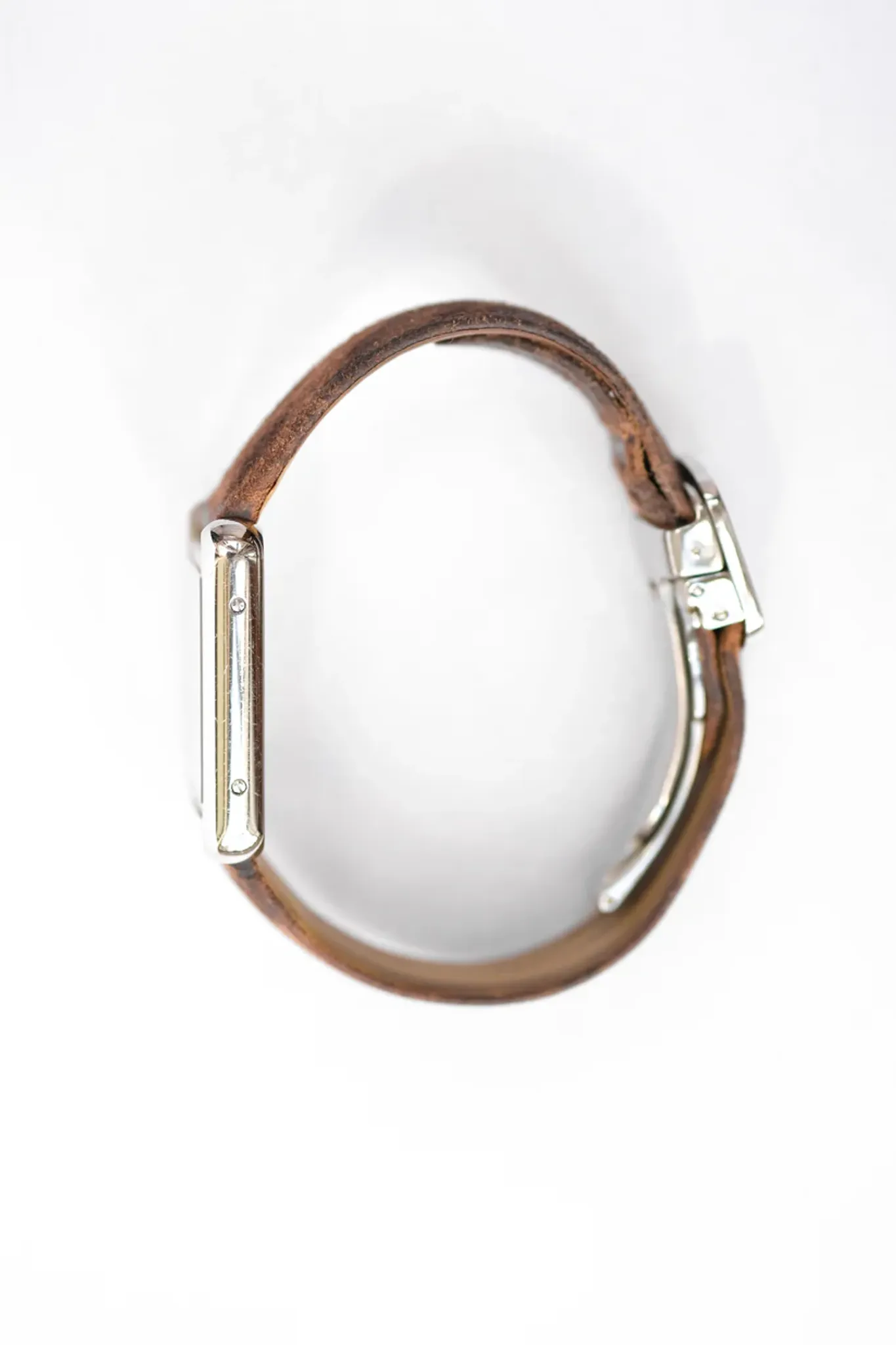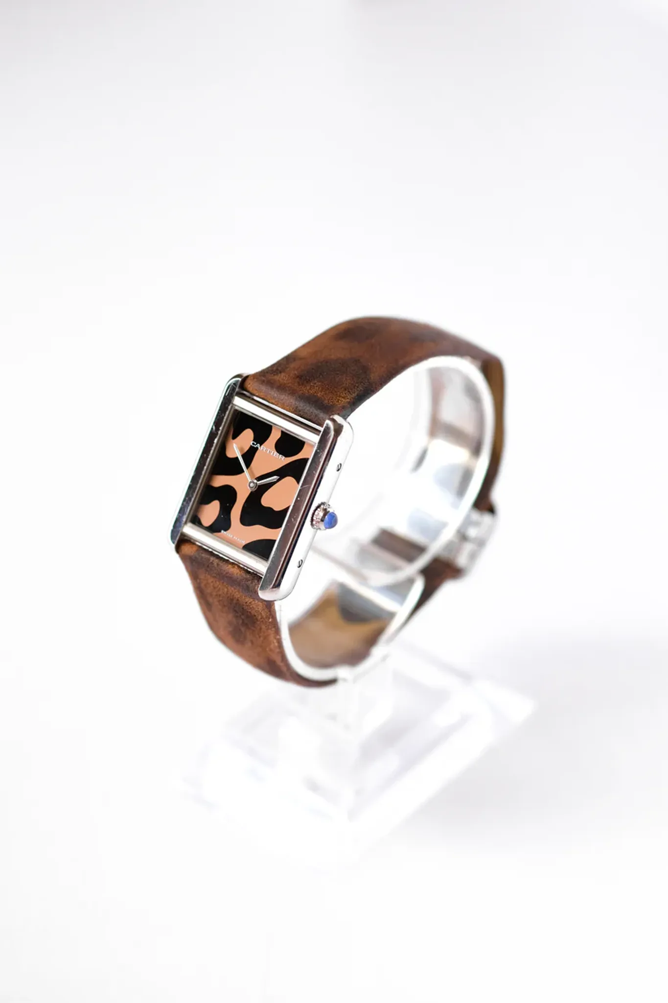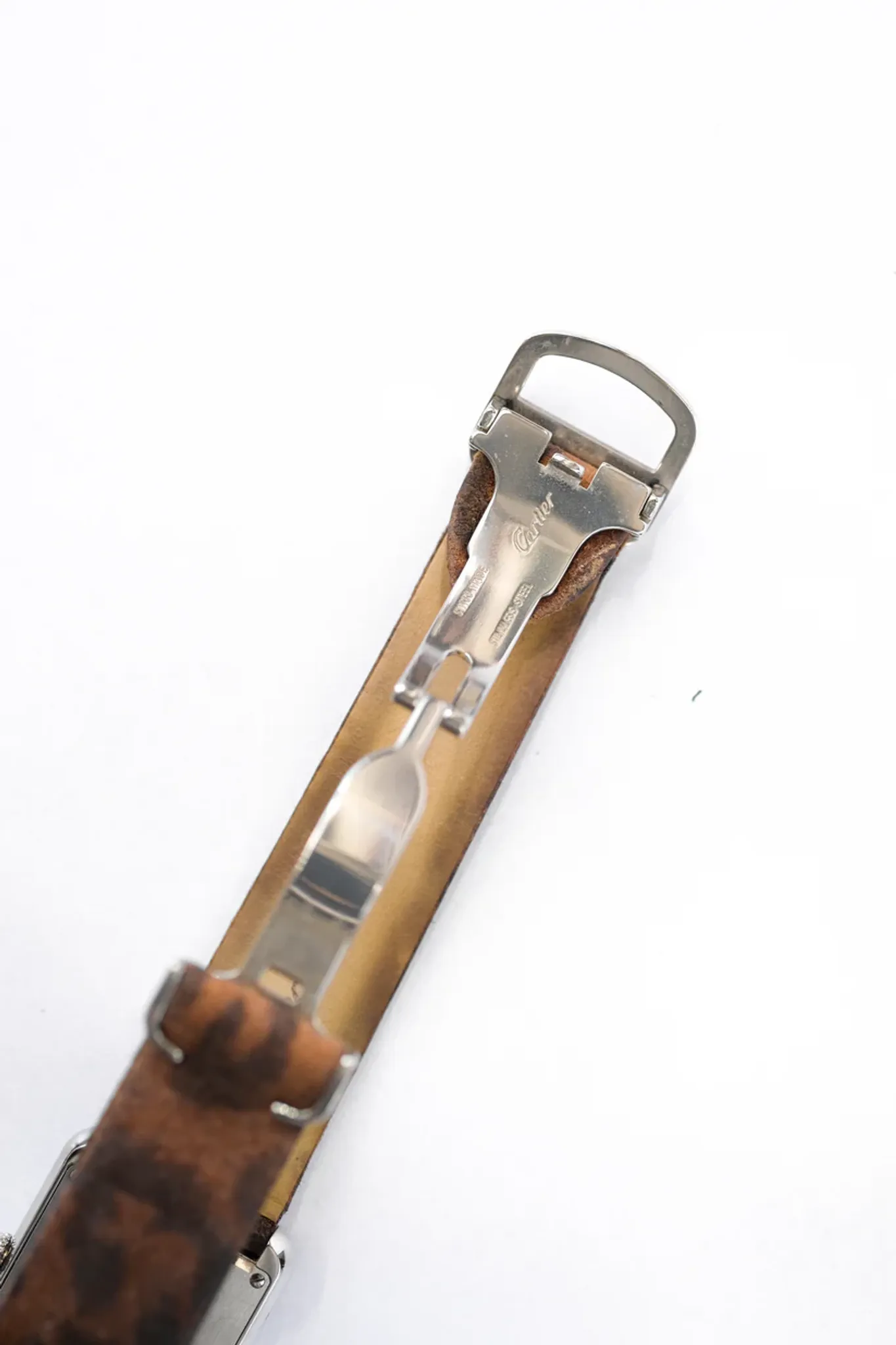 Cartier steel case and folding clasp. Cartier leather strap with panther print.