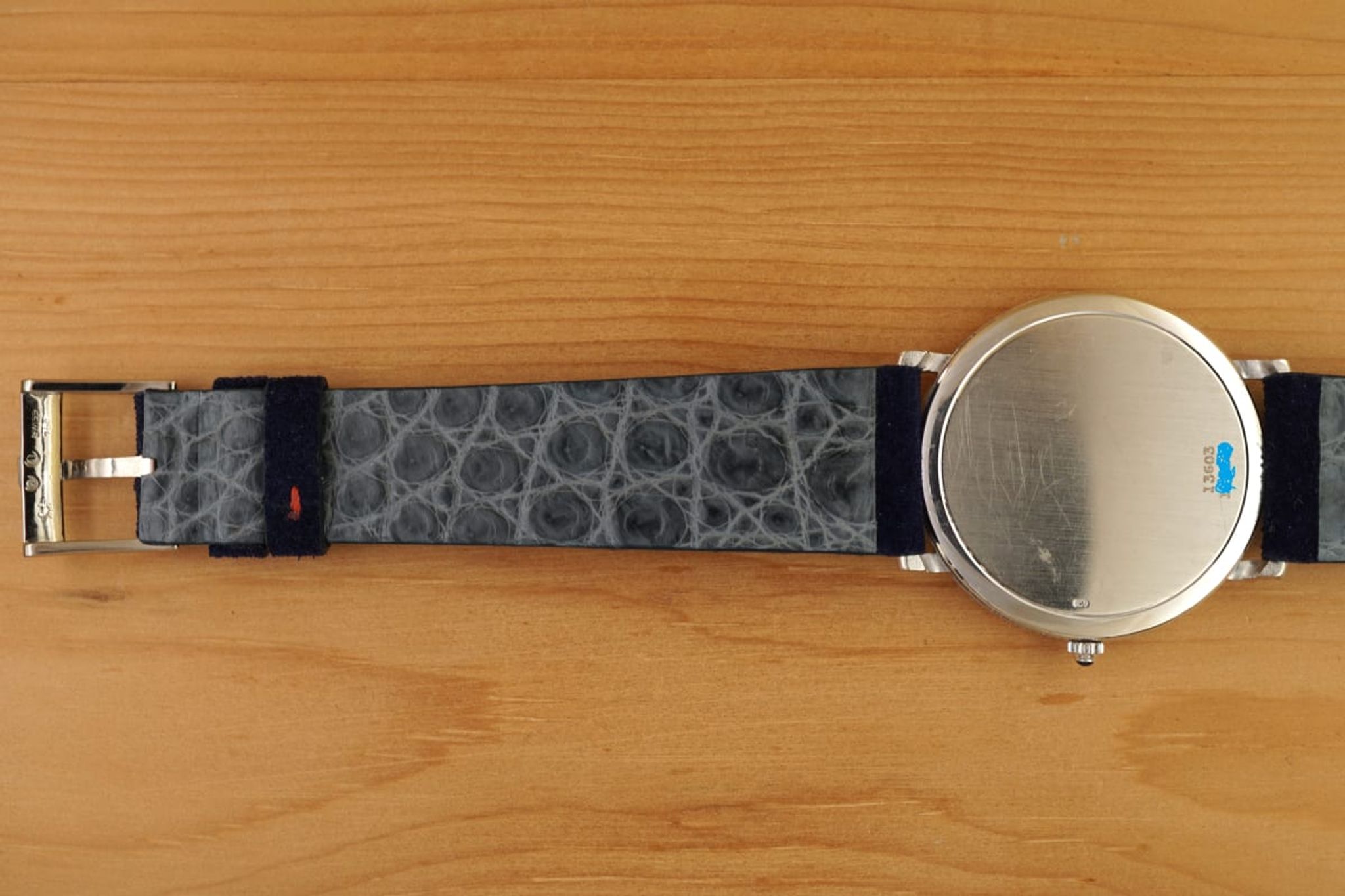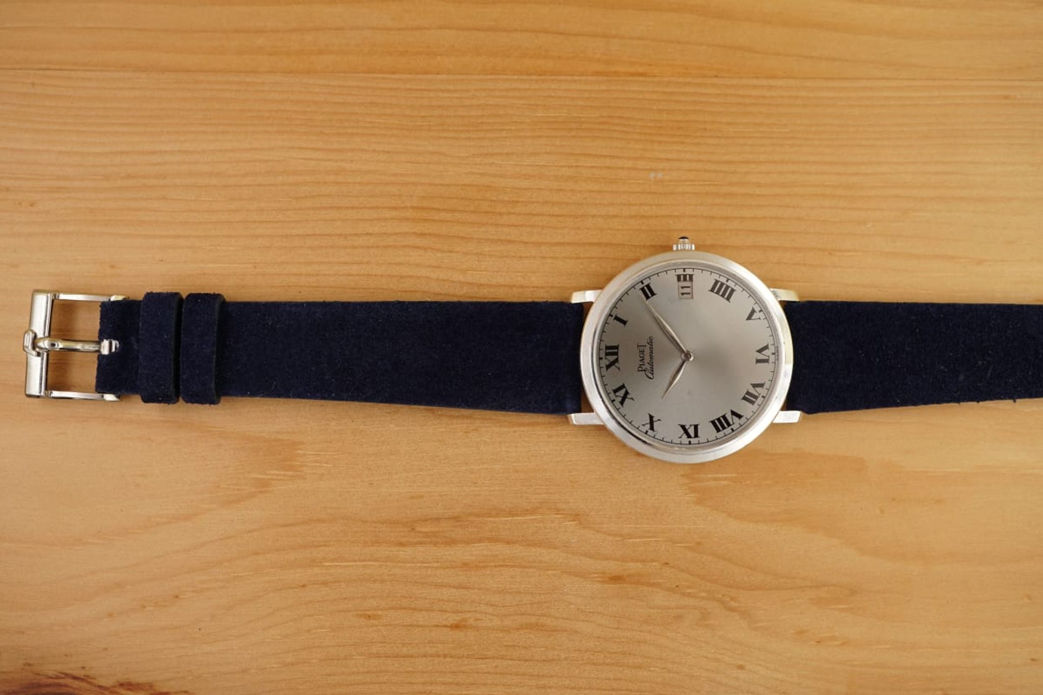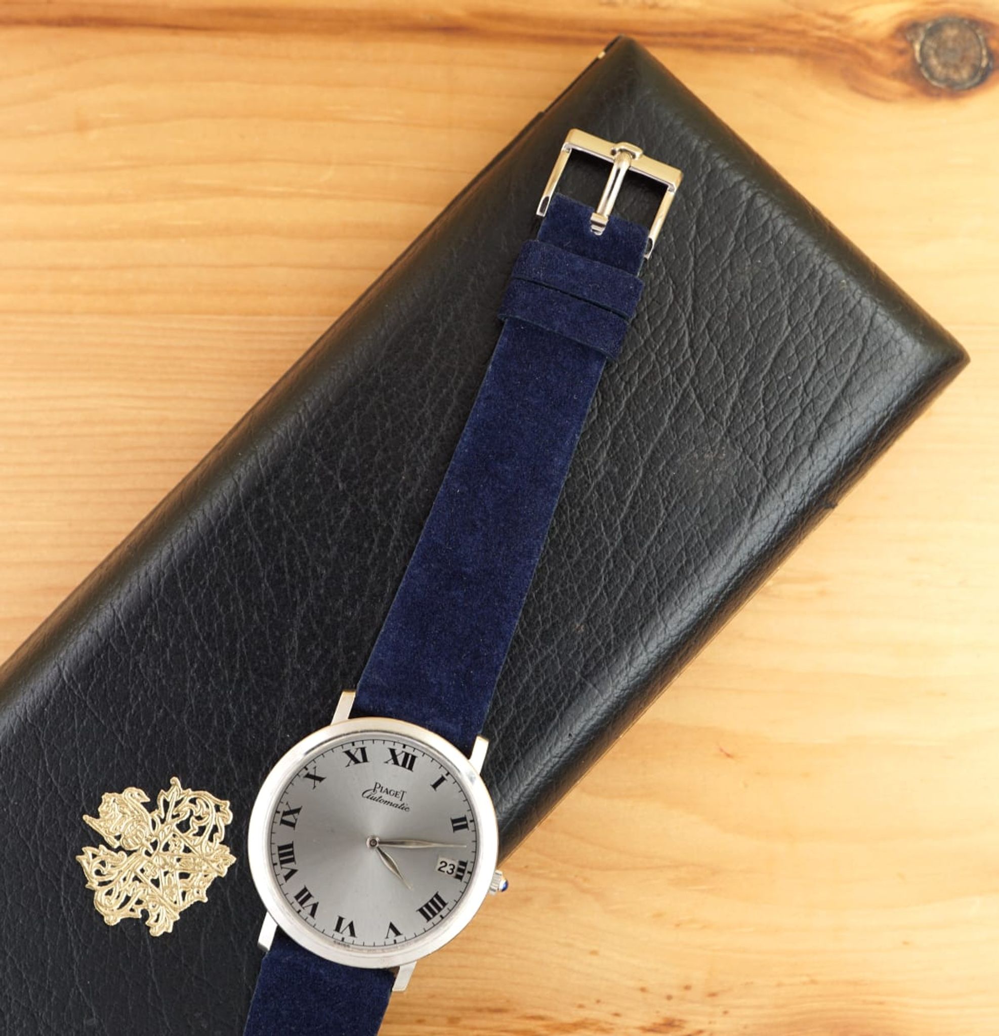 We put a dark-blue suede strap between the (probably unpolished) case and the original 18K-Piaget-buckle. But the watch is quite versatile and would go with different colors, too.