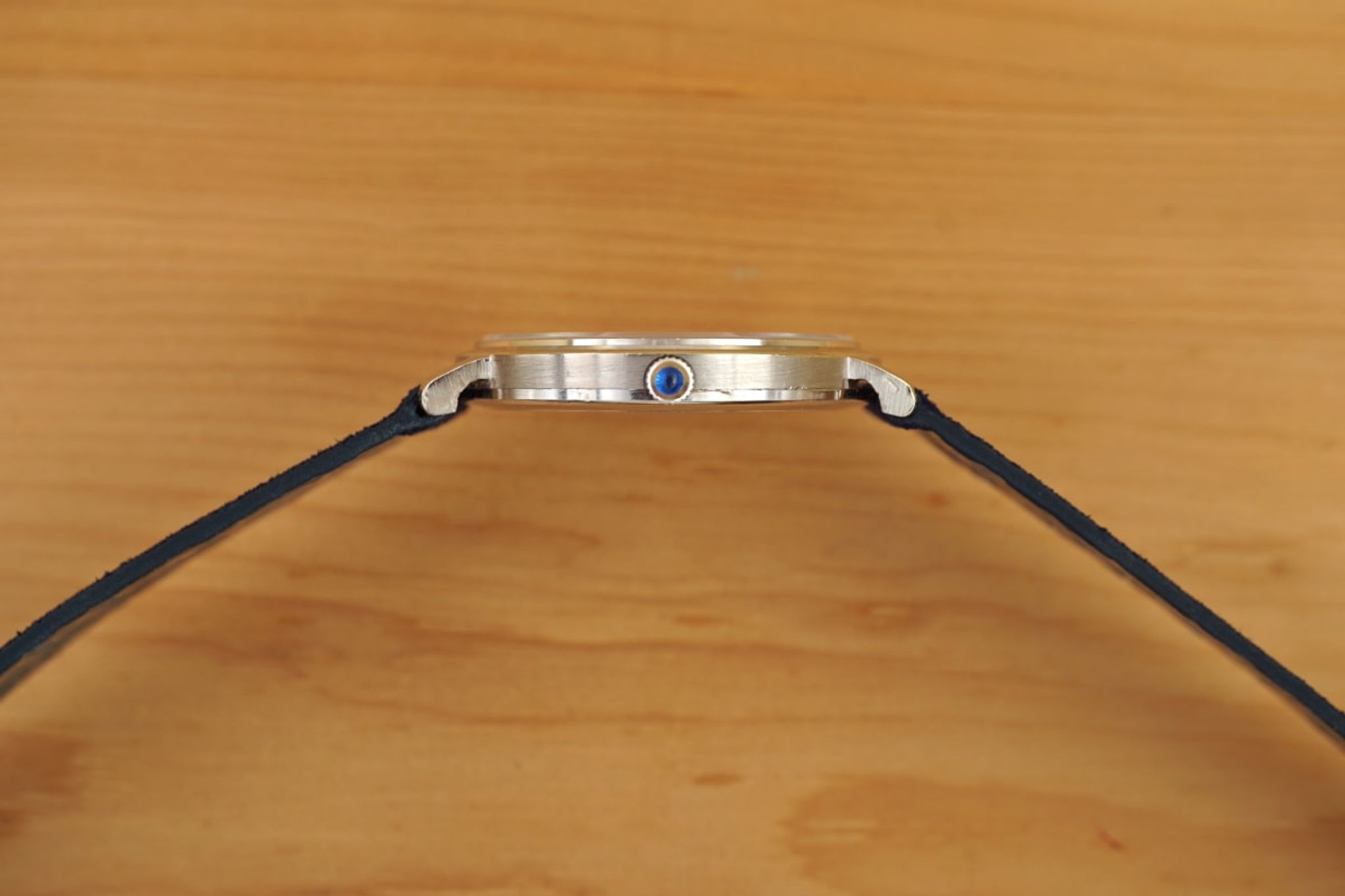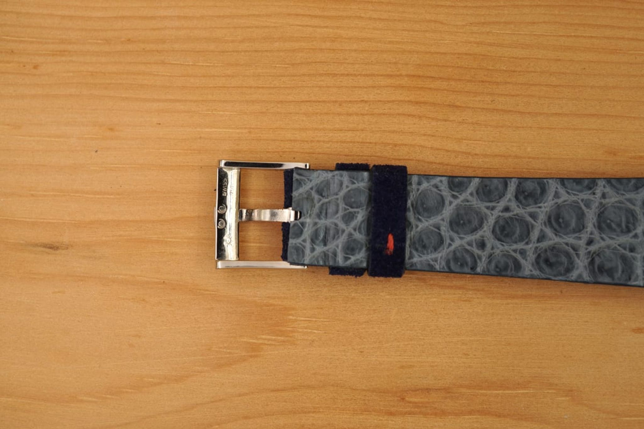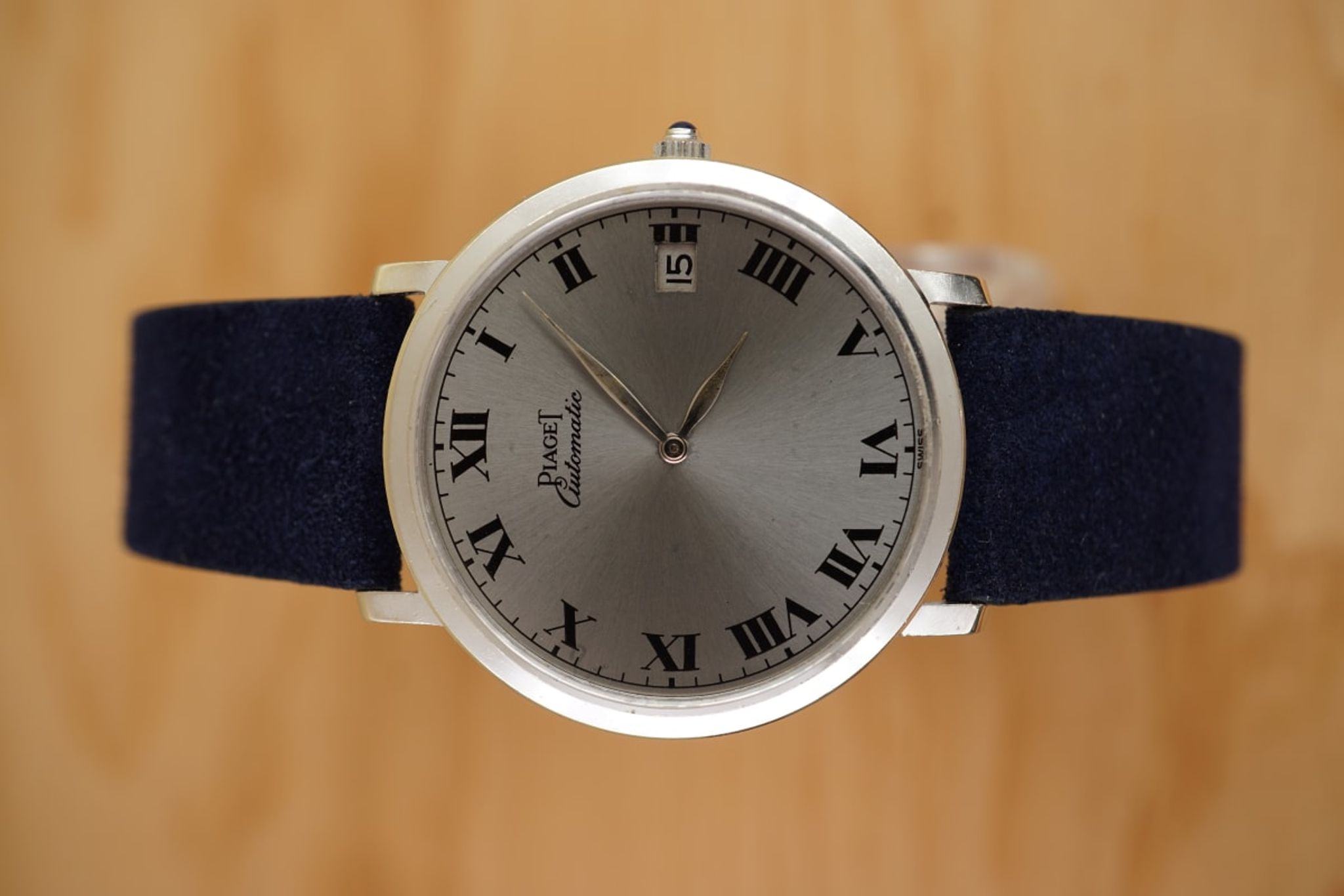 We put a dark-blue suede strap between the (probably unpolished) case and the original 18K-Piaget-buckle. But the watch is quite versatile and would go with different colors, too.