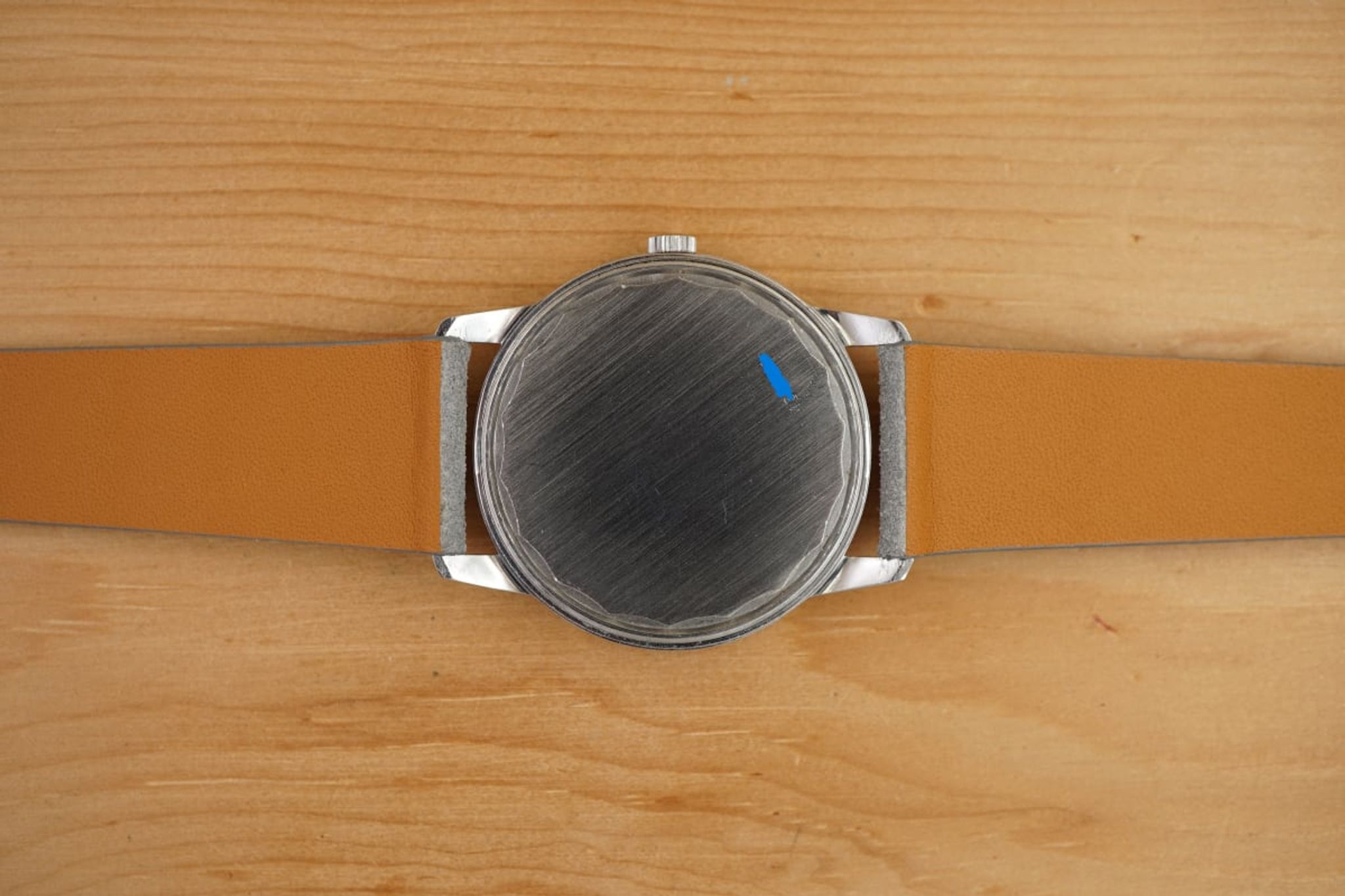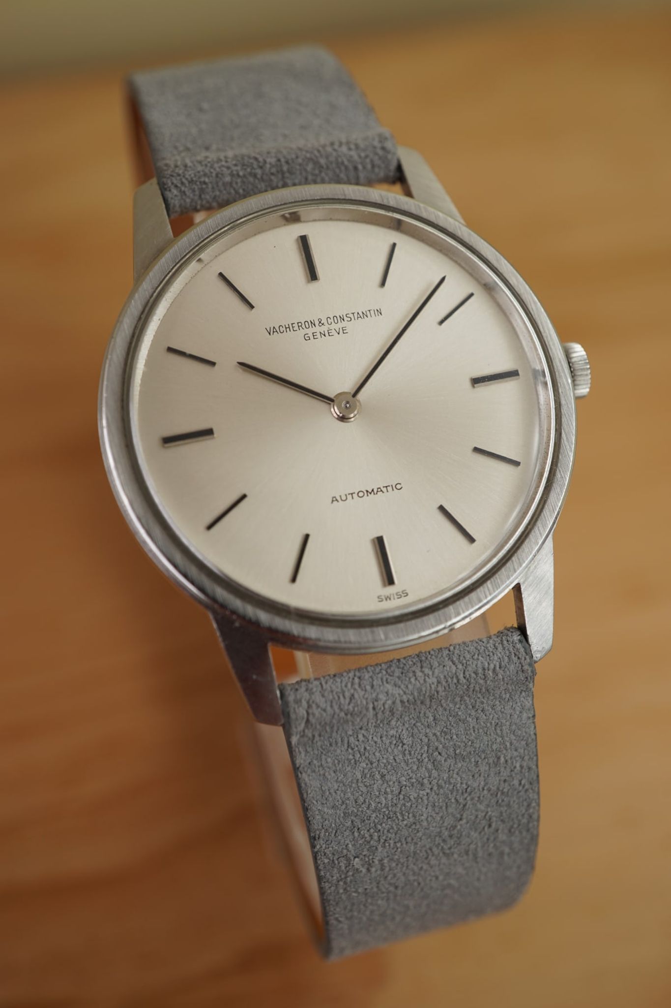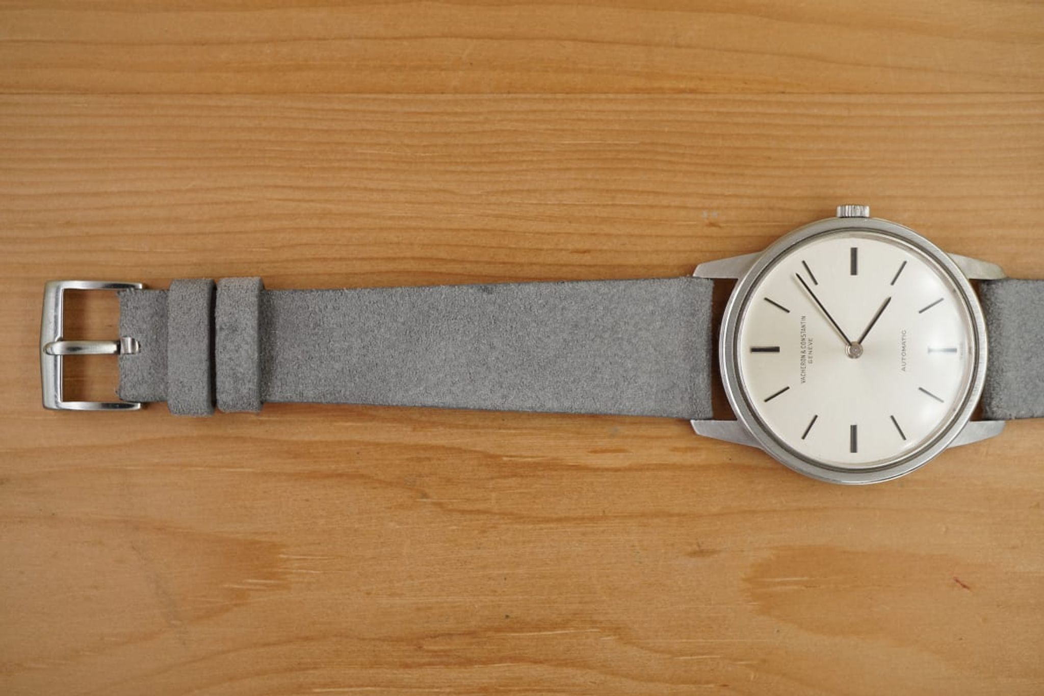 This example is in very good condition, serviced and presented with its original box, a custom-made monochrome suede-strap and original Vacheron-AW-buckle.