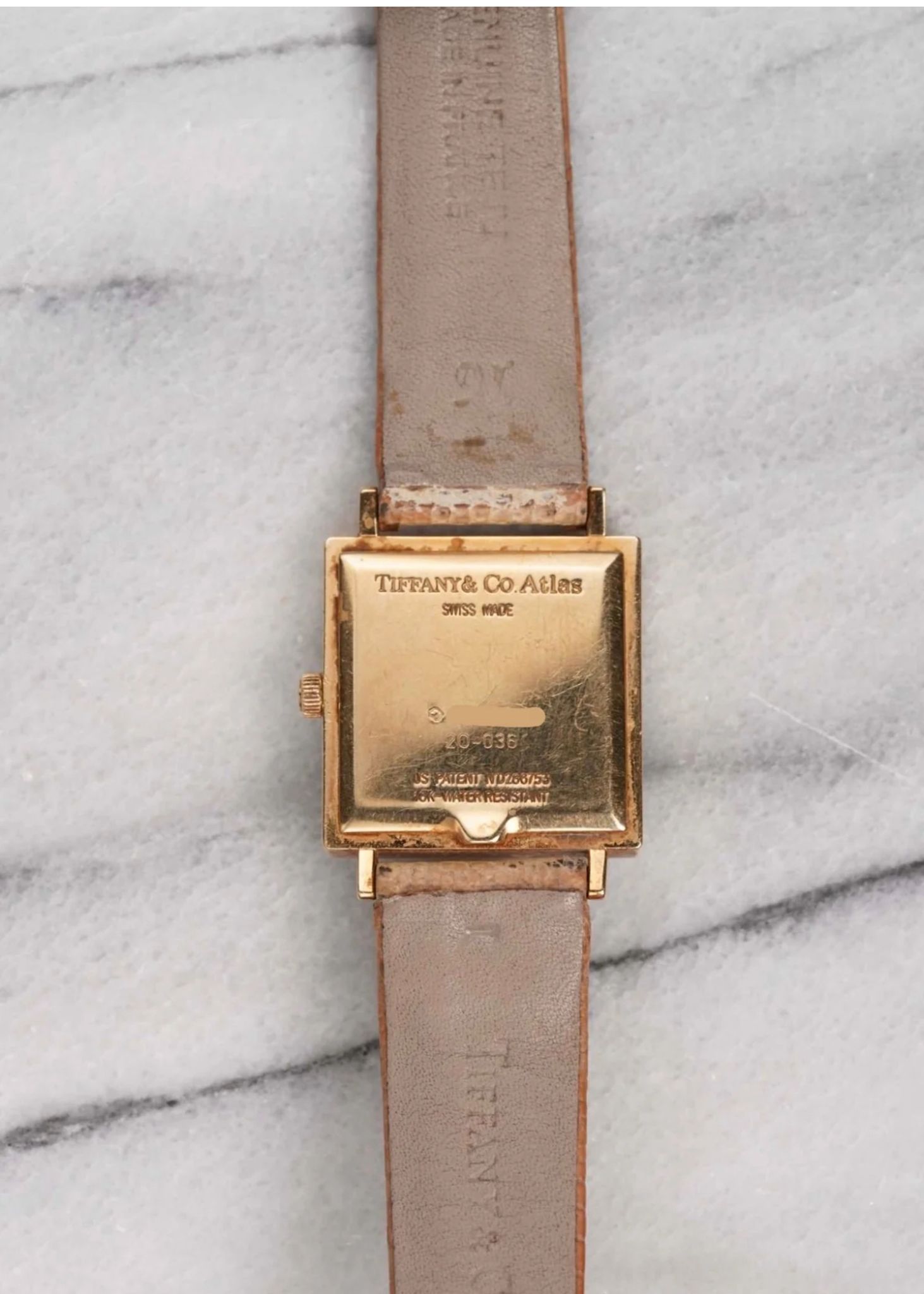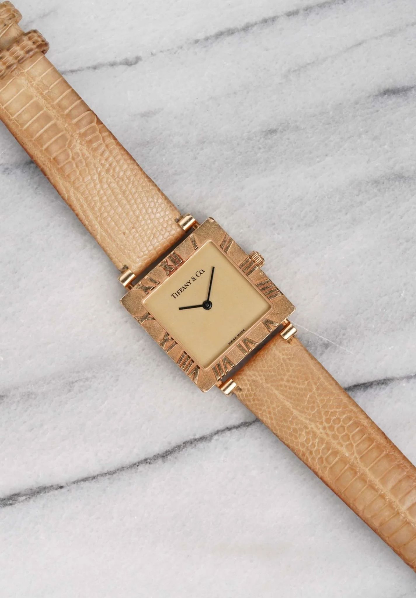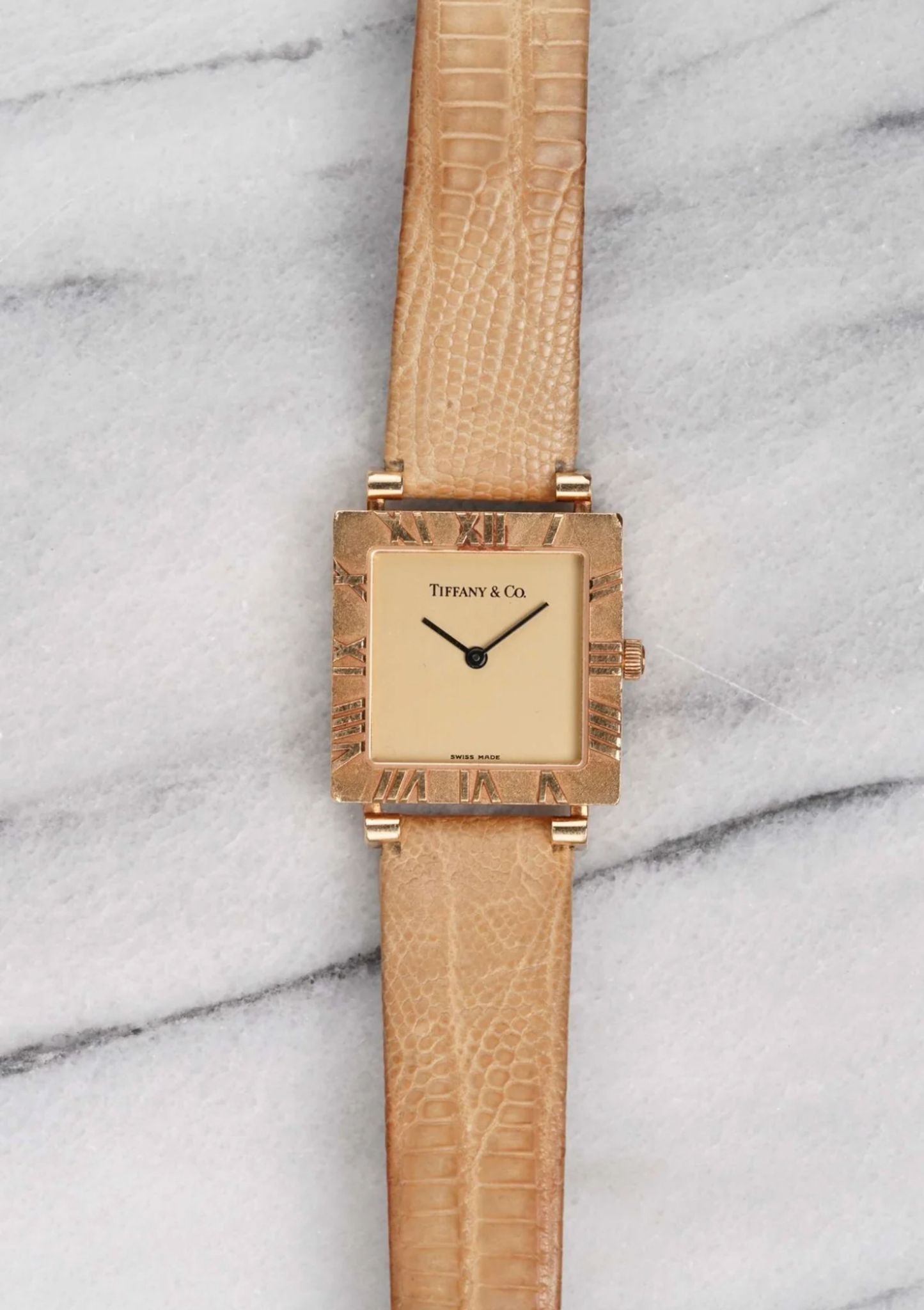 Here's a vintage Tiffany & Co in 18K yellow gold with a champagne dial quartz from the 1980s. Keeps great time and is fully functional. Measurements include a 33mm square case and 18mm lug width. On its original brown leather strap and signed buckle. Time only. 18K yellow gold case. Roman numerals on the bezel. Gold case and caseback. Matching black Roman numerals and thin hands. Both the dial and crystal are free from any scratches or marks. All parts are original including the signed Rolex crown, dial, movement, and caseback. Both the dial and case are in great cosmetic, untouched condition.