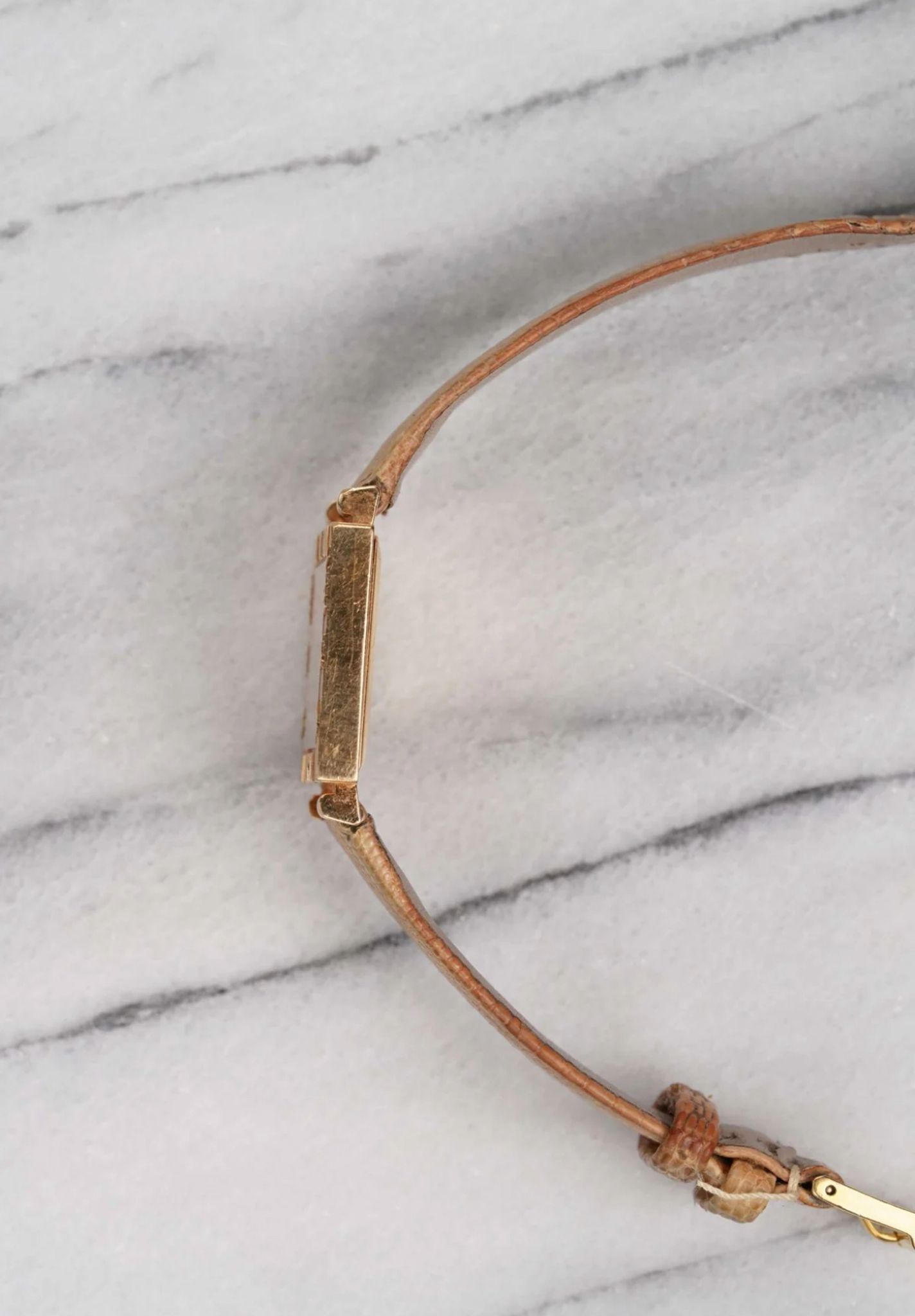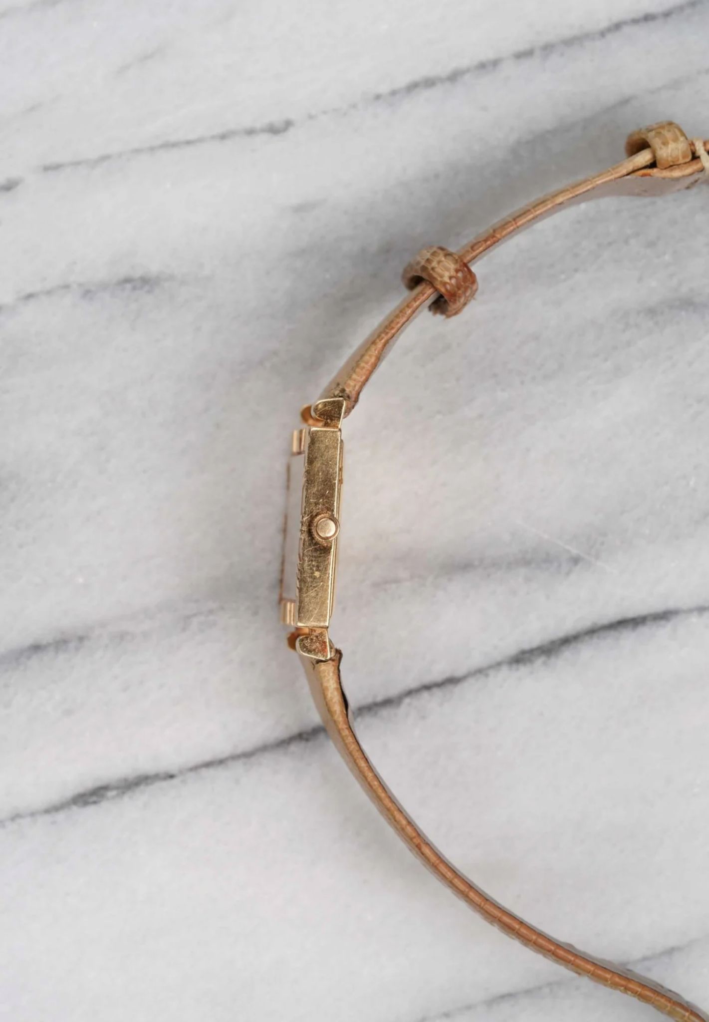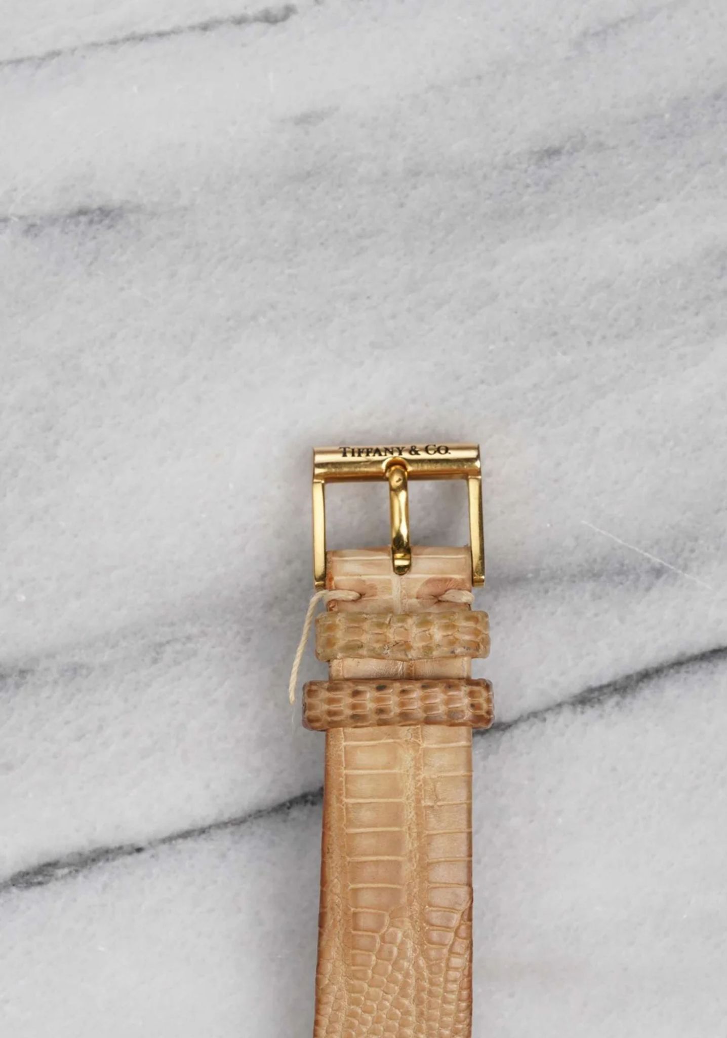 Here's a vintage Tiffany & Co in 18K yellow gold with a champagne dial quartz from the 1980s. Keeps great time and is fully functional. Measurements include a 33mm square case and 18mm lug width. On its original brown leather strap and signed buckle. Time only. 18K yellow gold case. Roman numerals on the bezel. Gold case and caseback. Matching black Roman numerals and thin hands. Both the dial and crystal are free from any scratches or marks. All parts are original including the signed Rolex crown, dial, movement, and caseback. Both the dial and case are in great cosmetic, untouched condition.
