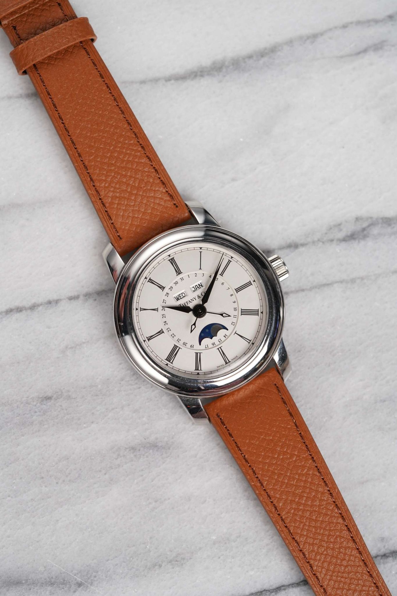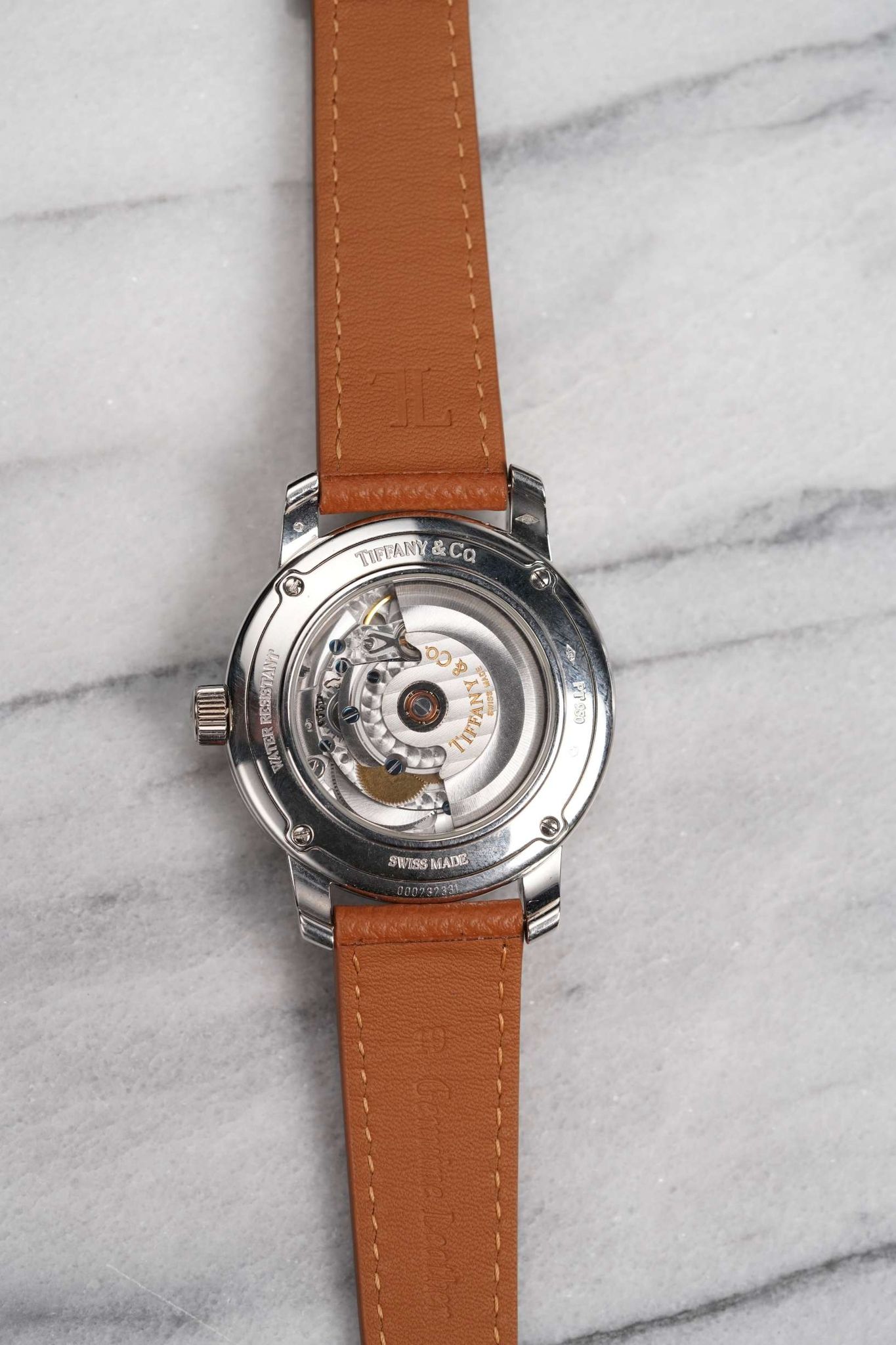 Here's a neo-vintage Tiffany & Co triple calendar moon phase in platinum automatic from the 2000s. Keeps great time and is fully functional. ETA movement. Measurements include a 39mm case size and 20mm lug width. On an aftermarket brown pebble textured leather strap. with its signed gold buckle. White dial. Gold stick hands and Roman numerals. The month indicator is at 12 a clock, the day is at 9 a clock and the date is at 3 a clock.120 grams. Exhibition caseback. Moon phase indicator at 6 a clock. Platinum case and caseback. Hard to find these examples. All other parts are original including the signed caseback, dial, and movement. Both the dial and case are in great cosmetic, untouched condition.