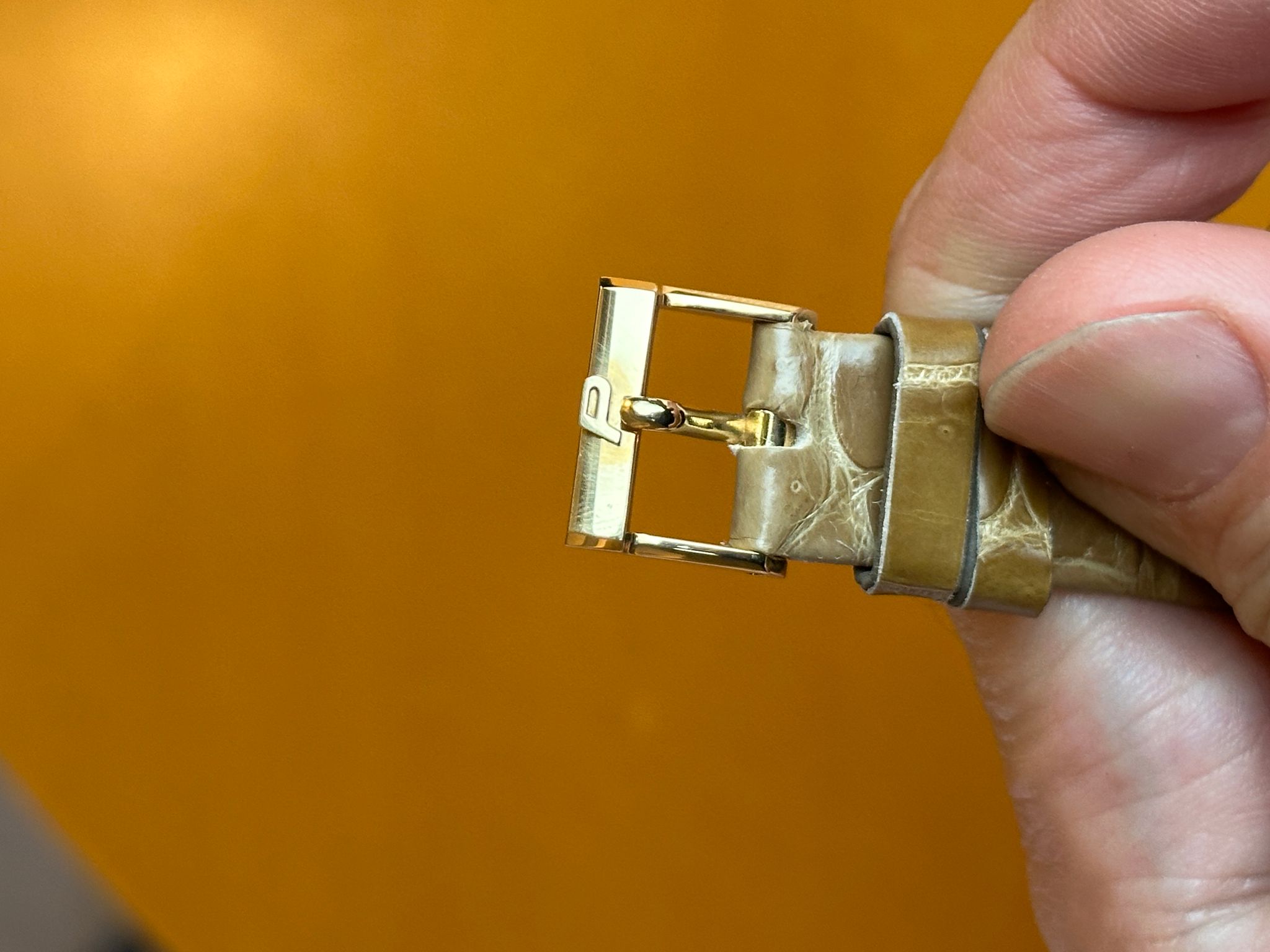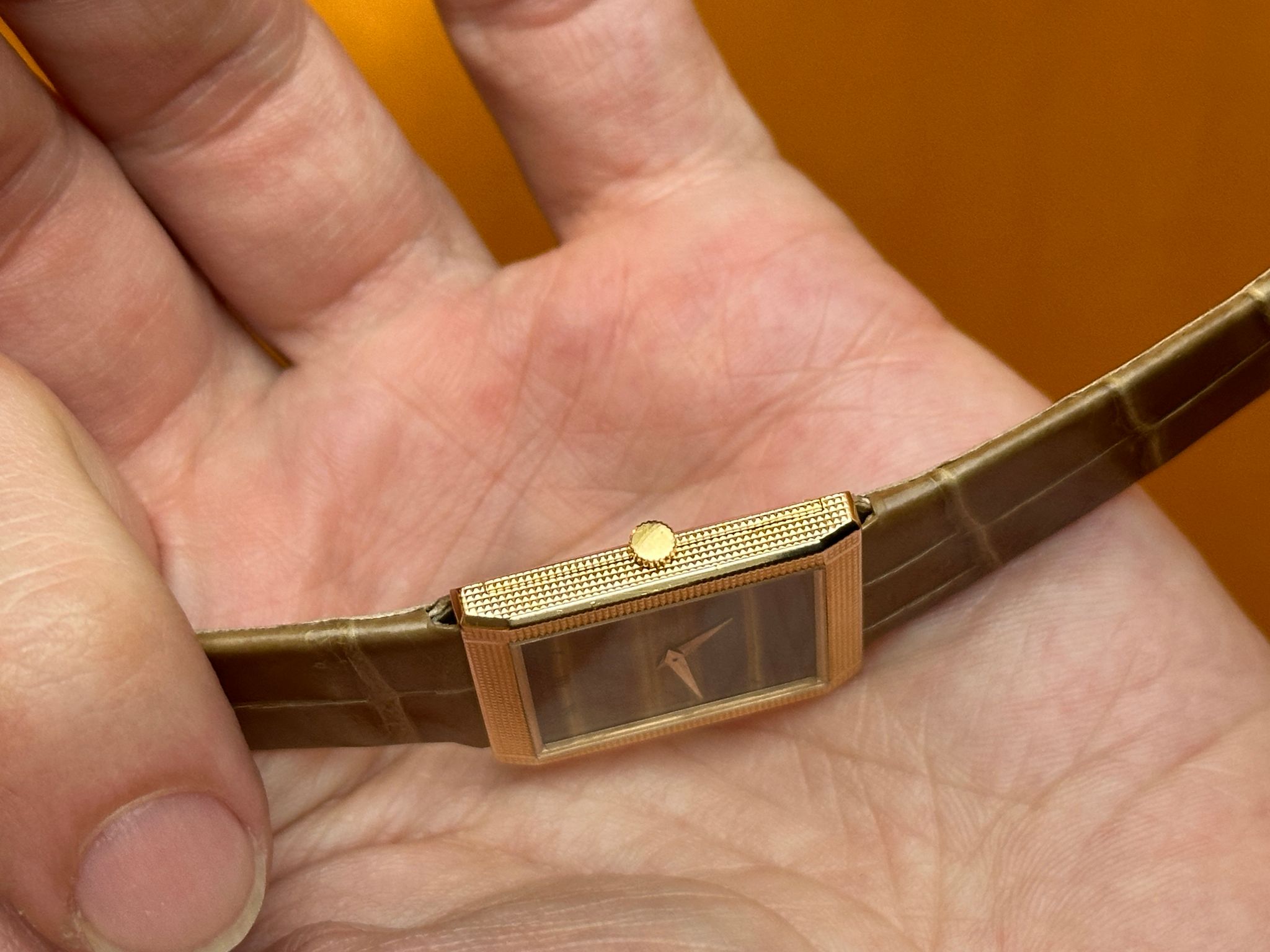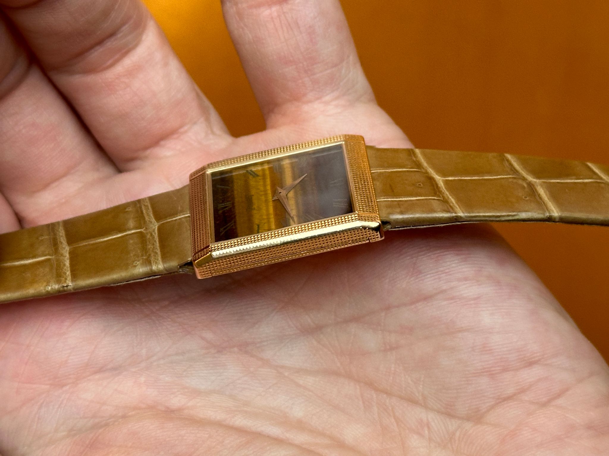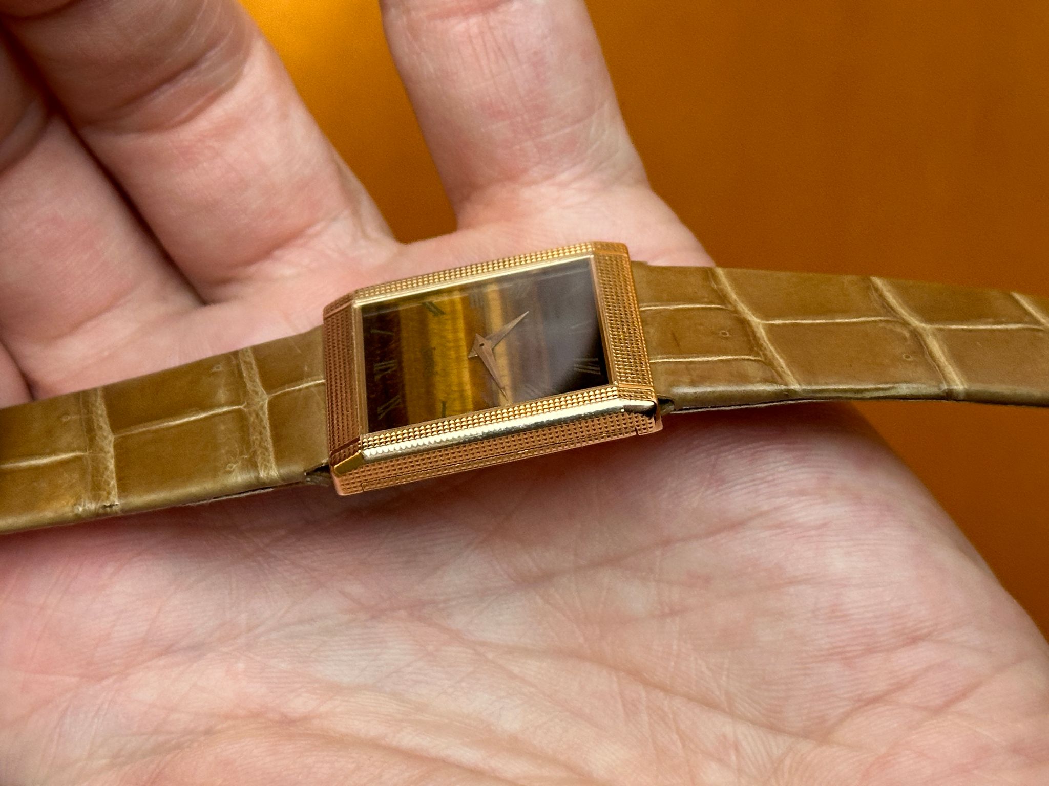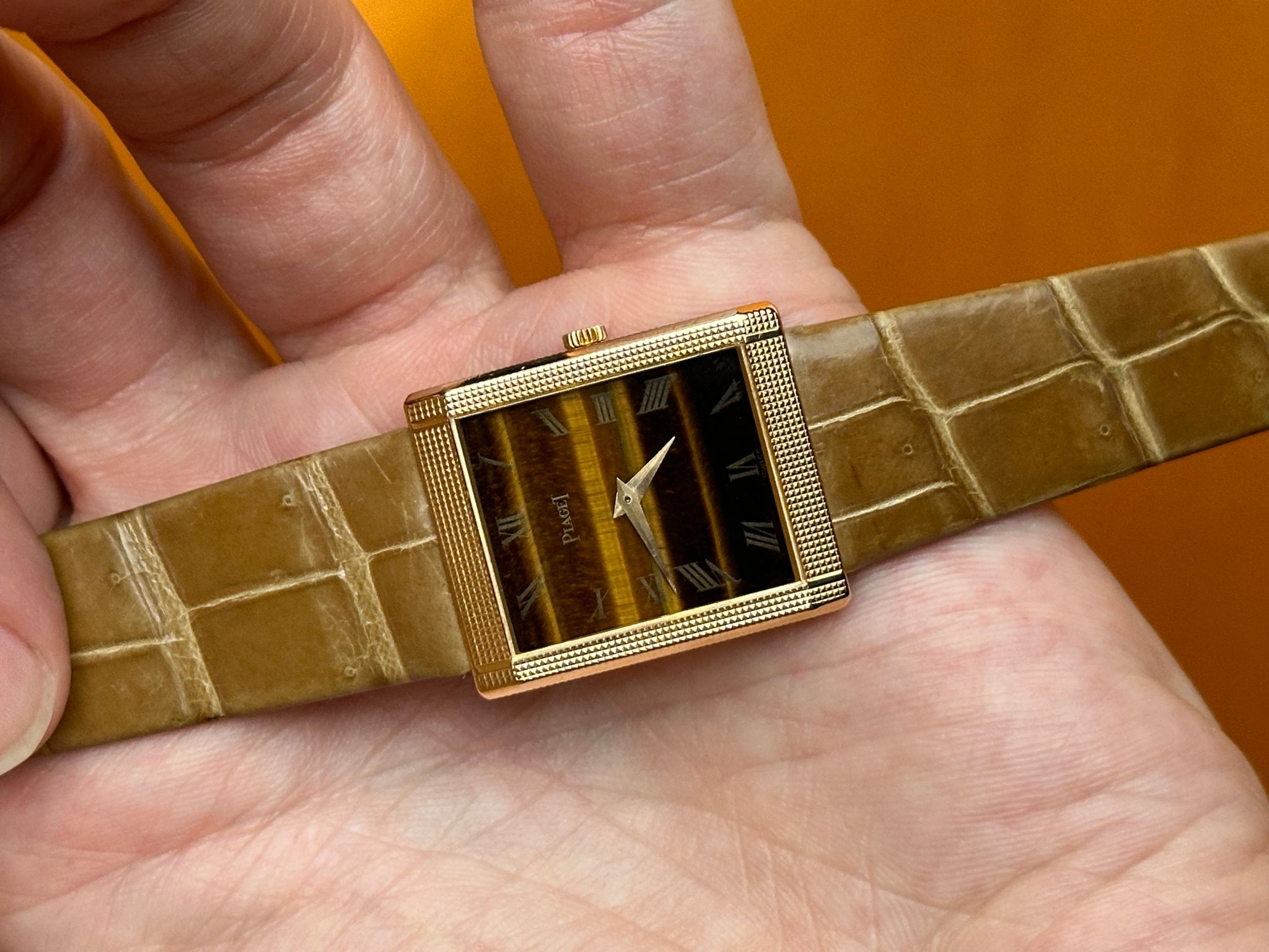 Flawless tiger-eye dial hobnail “tank” with Piaget buckle.