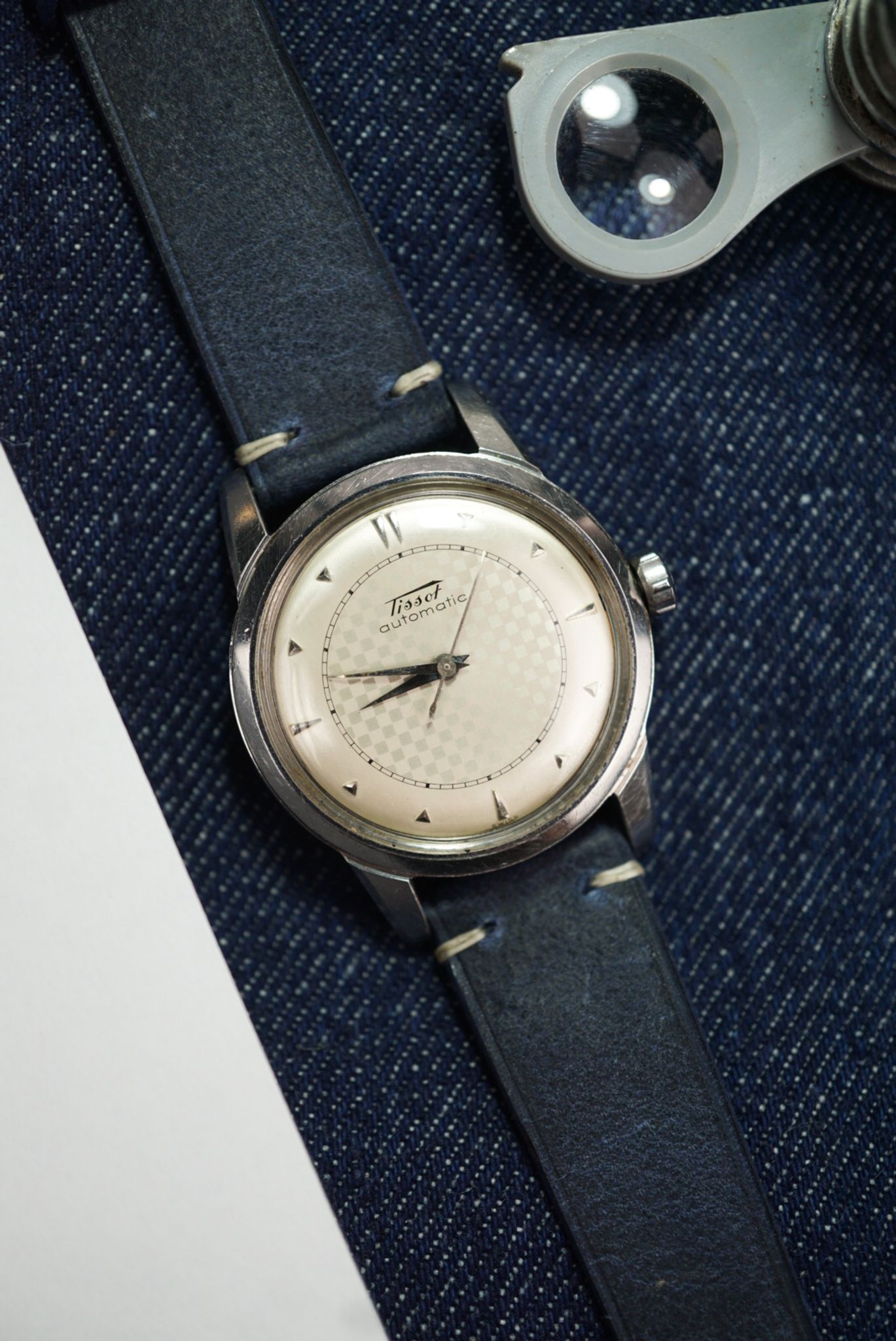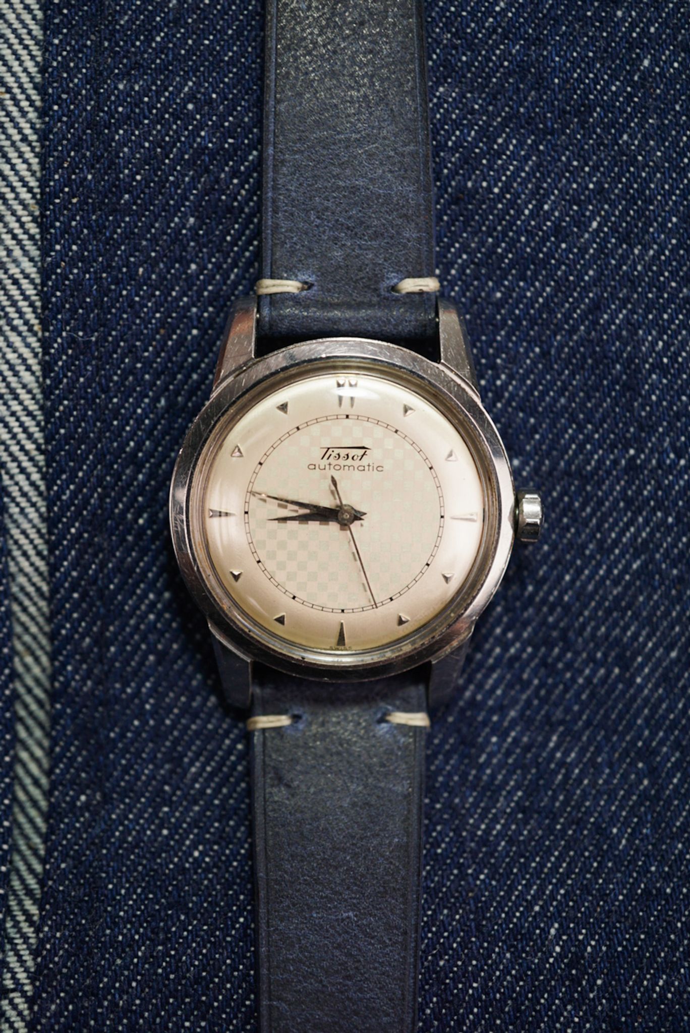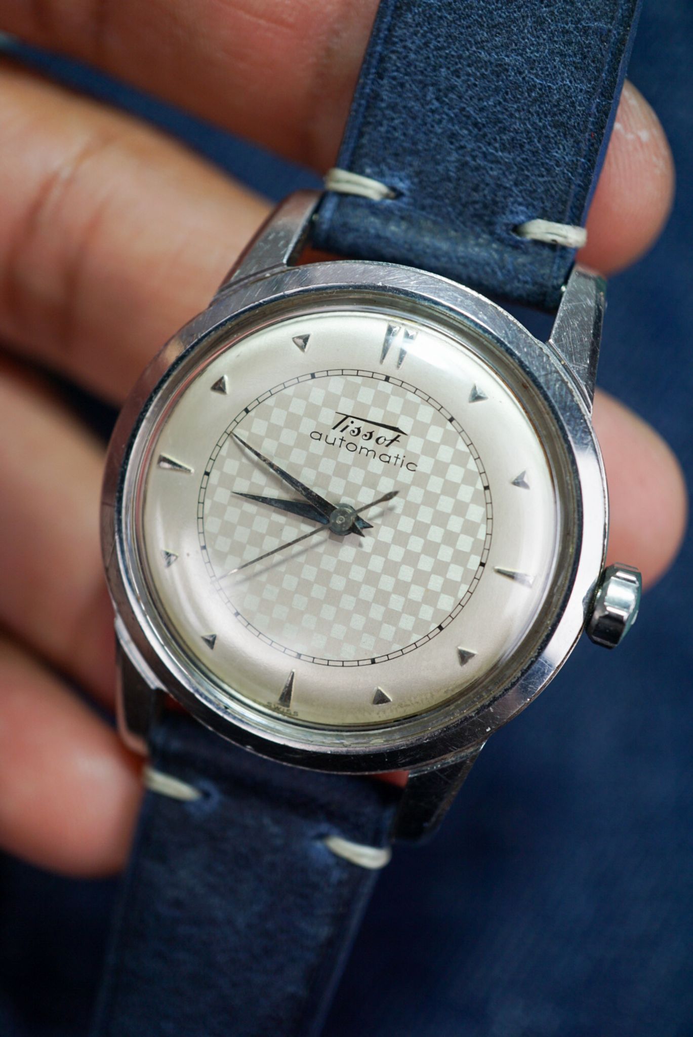 Super sharp, thick-lugged Tissot with a beautiful chessboard dial. This piece shares the same DNA as early Omega Seamasters—featuring the same case and movement, but with a unique dial. Now available!