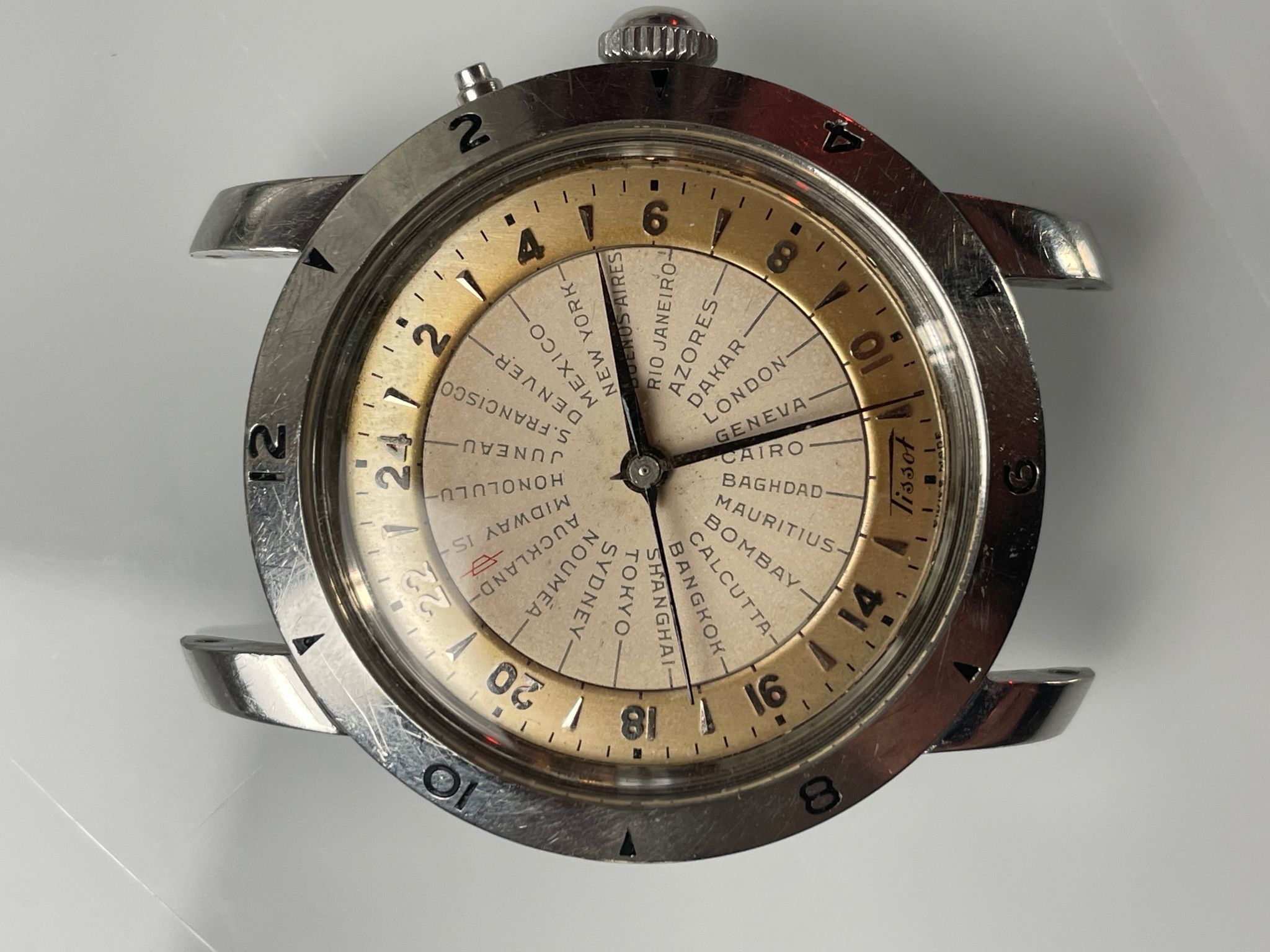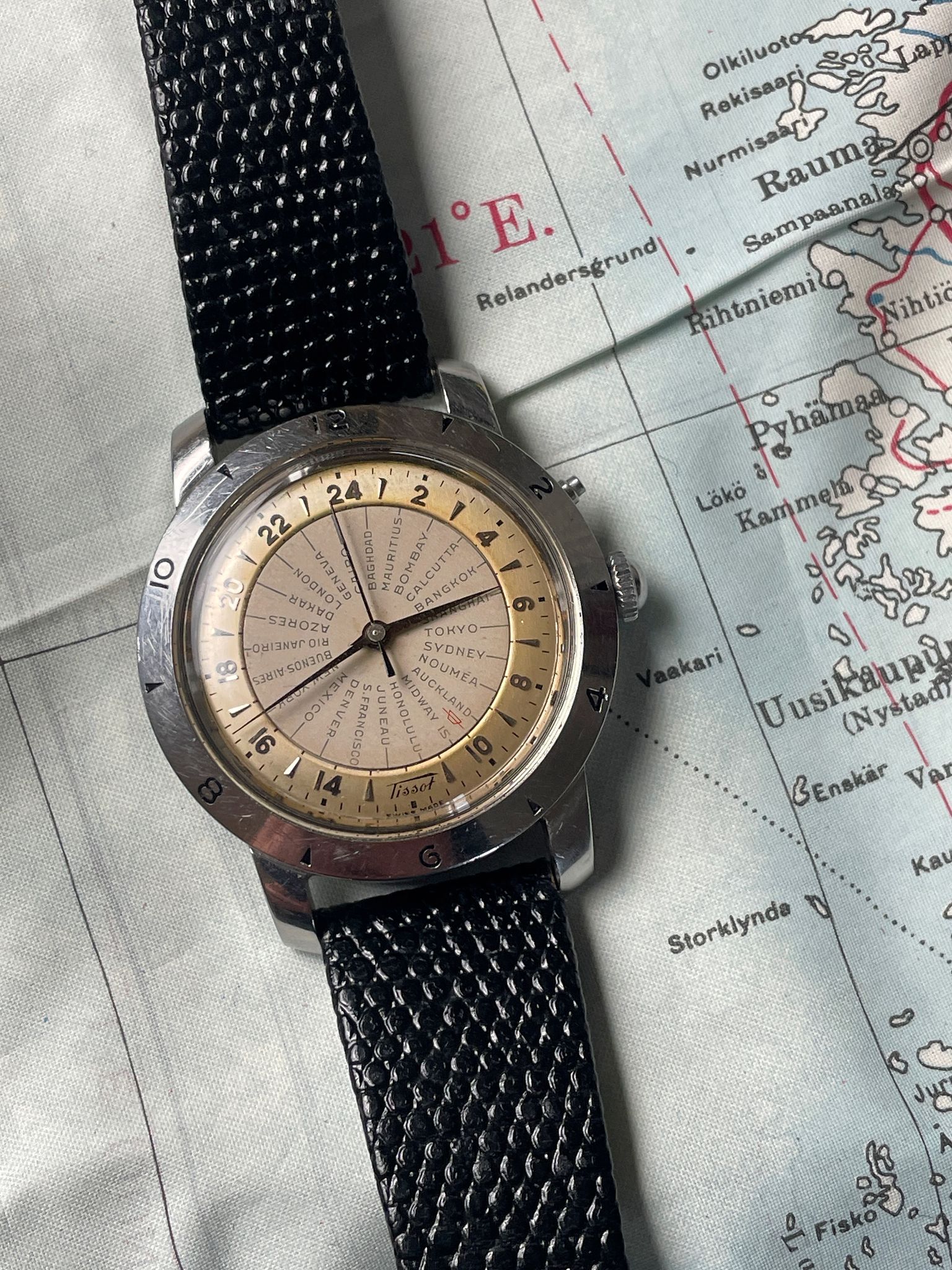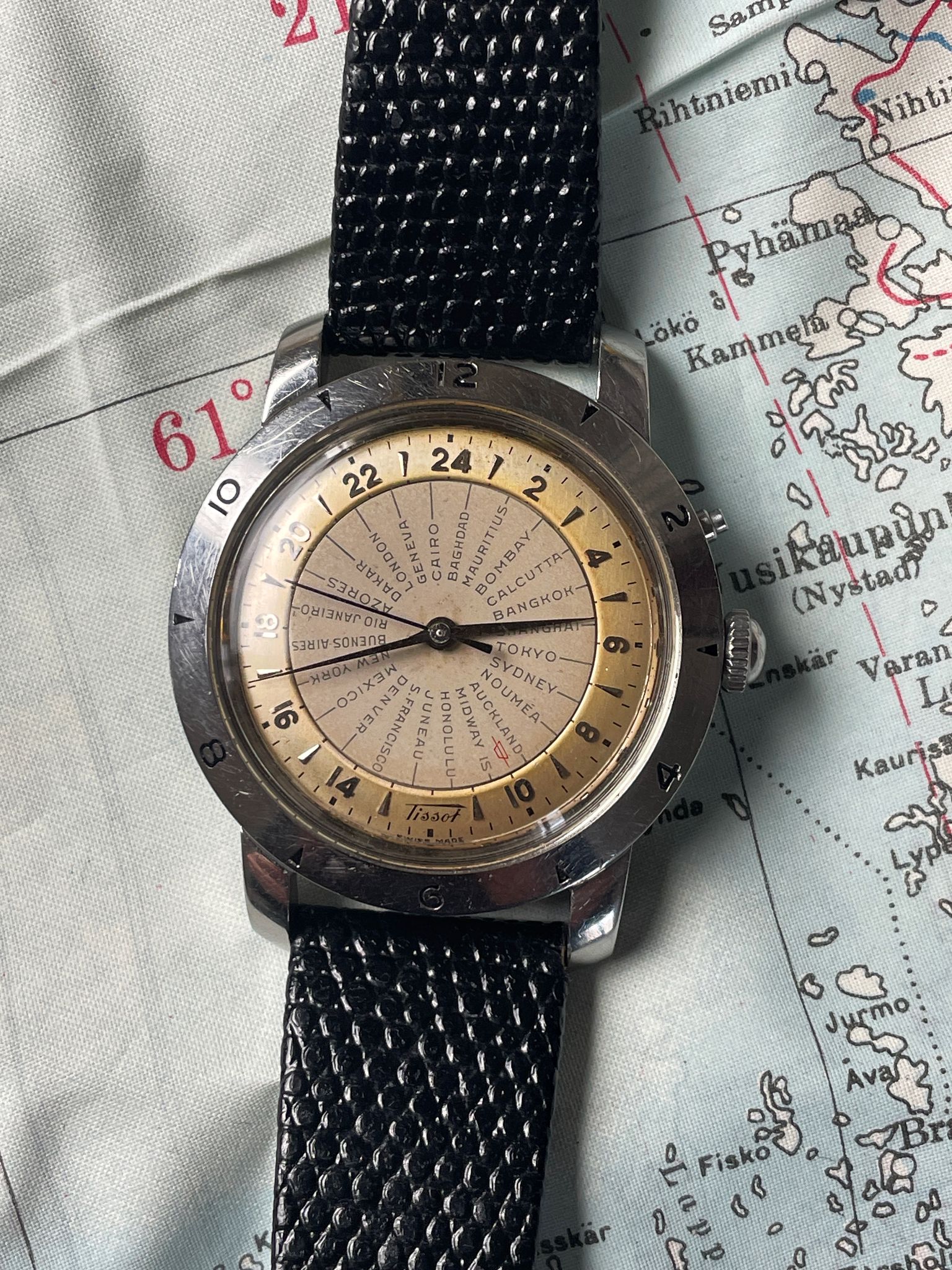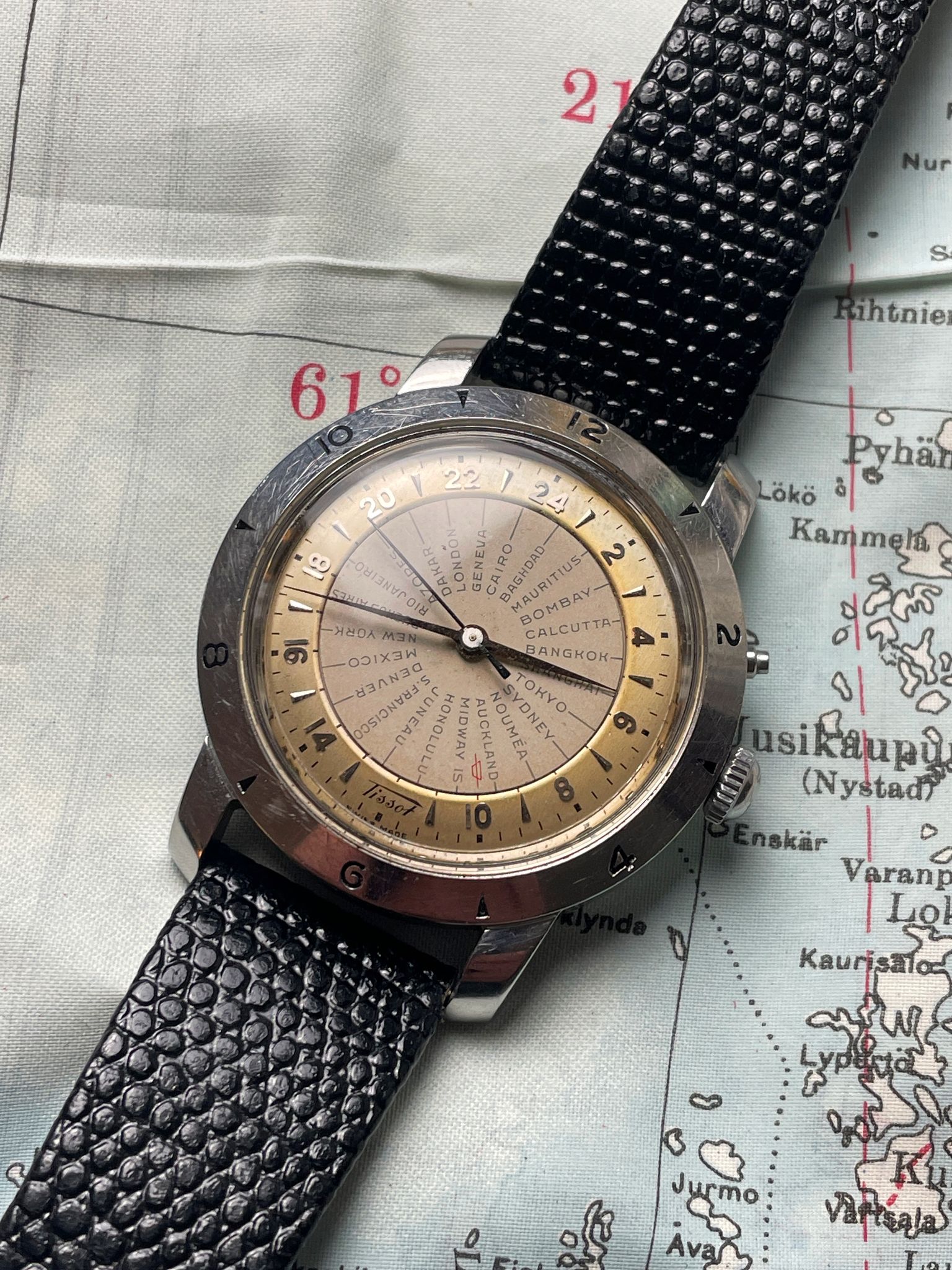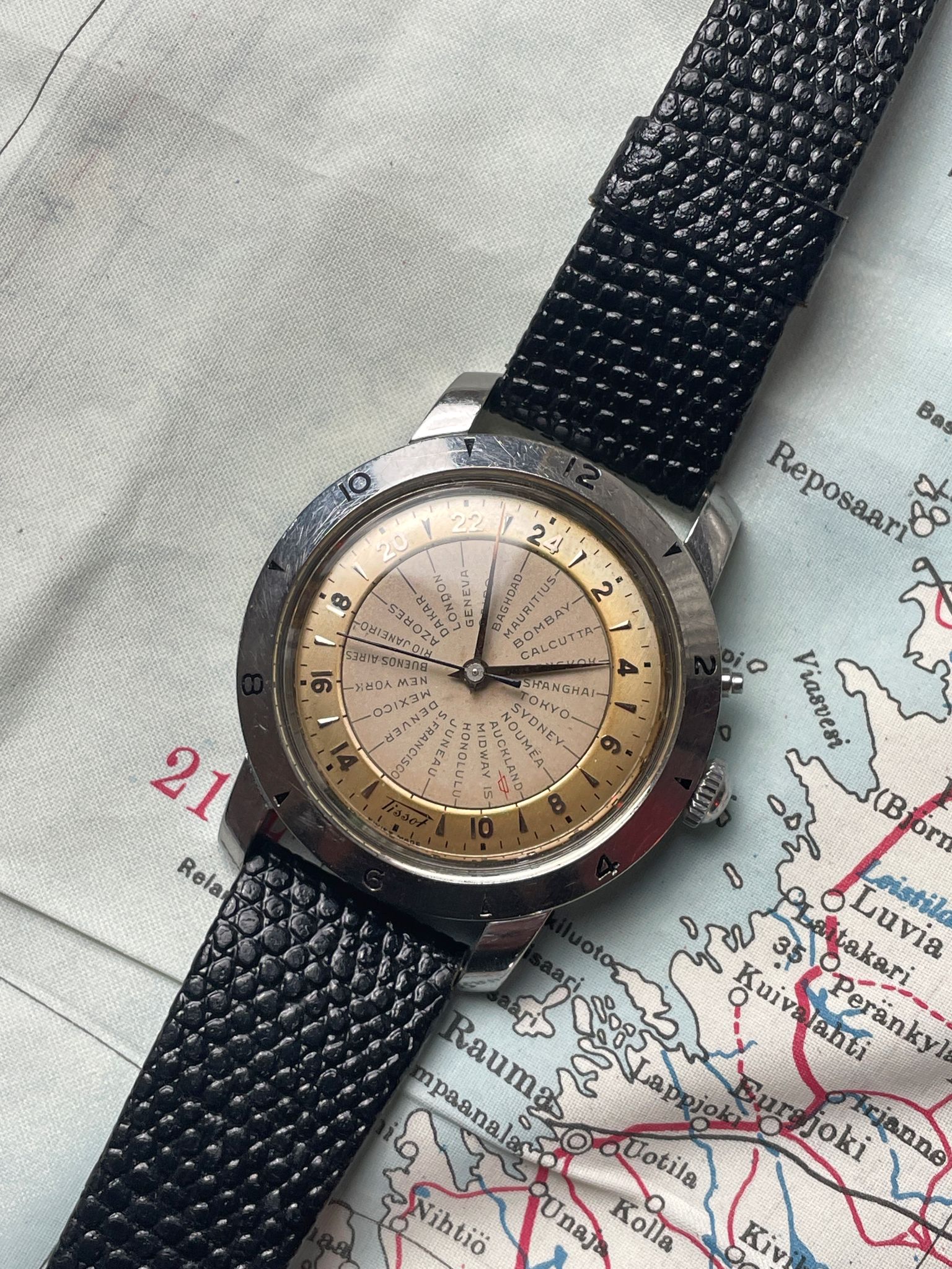 Tissot Navigator 4002-1 from 1952. Yes, we are talking about a watch of 70 years old. A time when traveling was still an adventure and crossing timezones was easier with an appropriate tool. This Tissot Navigator appears in 1953 and was the first mass-produced wristwatch to feature 24 time zones, a watch dedicated to serious travelers.