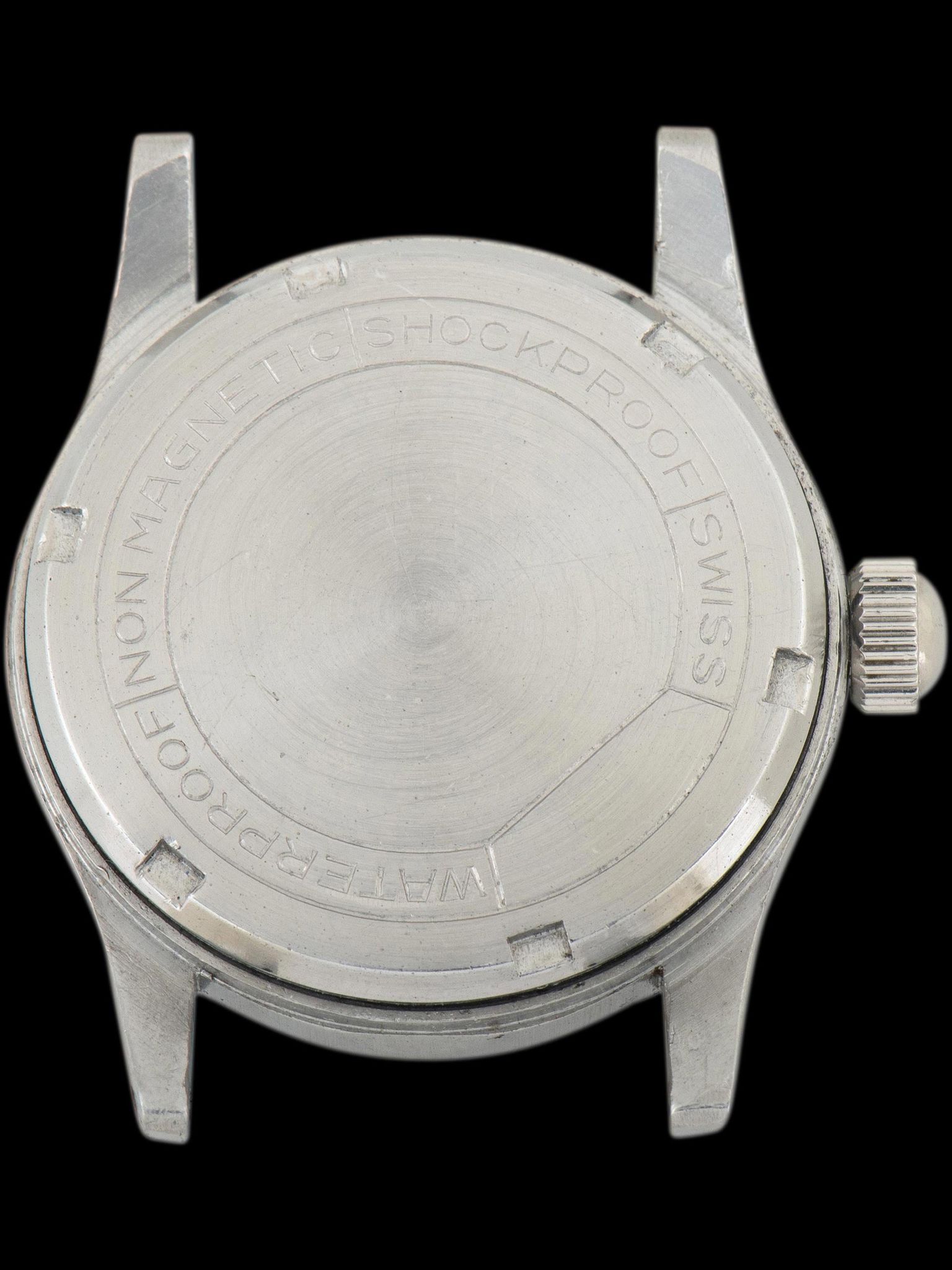 The excellent case features broad, straight lugs that retain original facets and details with light evidence of being previously polished and honest signs of use. The crown is believed to be an early replacement. The case back retains all of its original factory markings in deep and crisp condition. The watch comes supplied on a 2pc black canvas strap.
