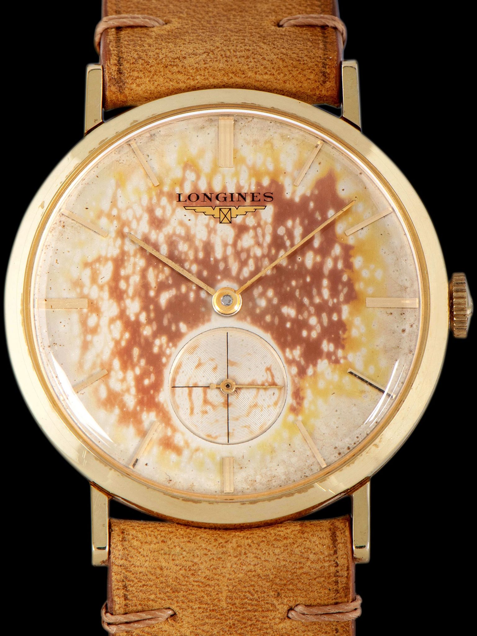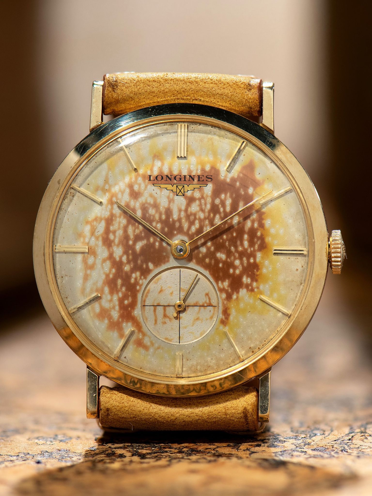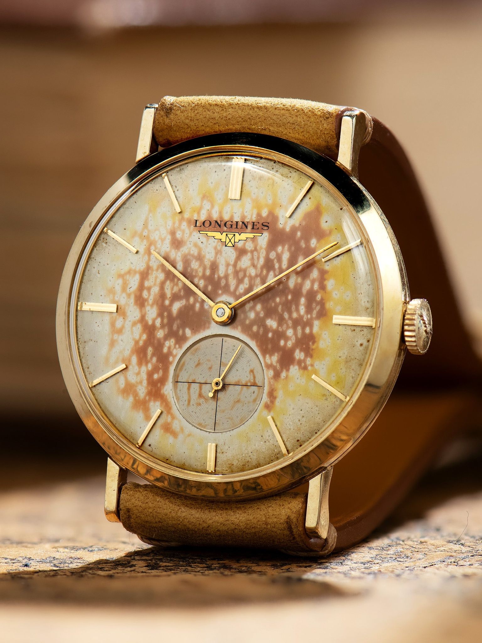 This ref. 1010 from 1955 falls into the latter category, a beautiful model that features a lithe 33.5mm case and a gorgeous silver tropical dial with rich browns and golds growing out of the center. It's a beautiful, timeless piece that's quintessentially Longines and would look great on quite literally anyone.