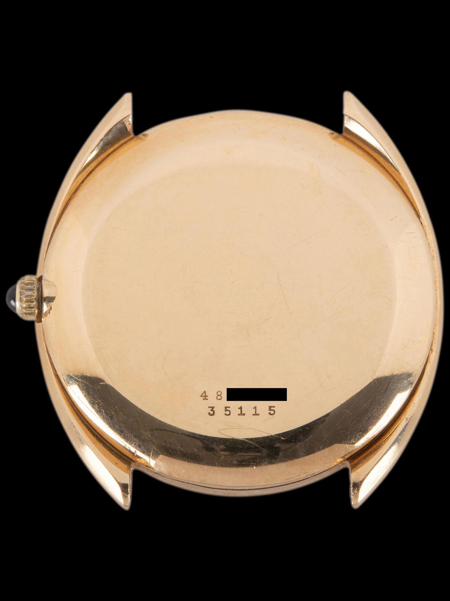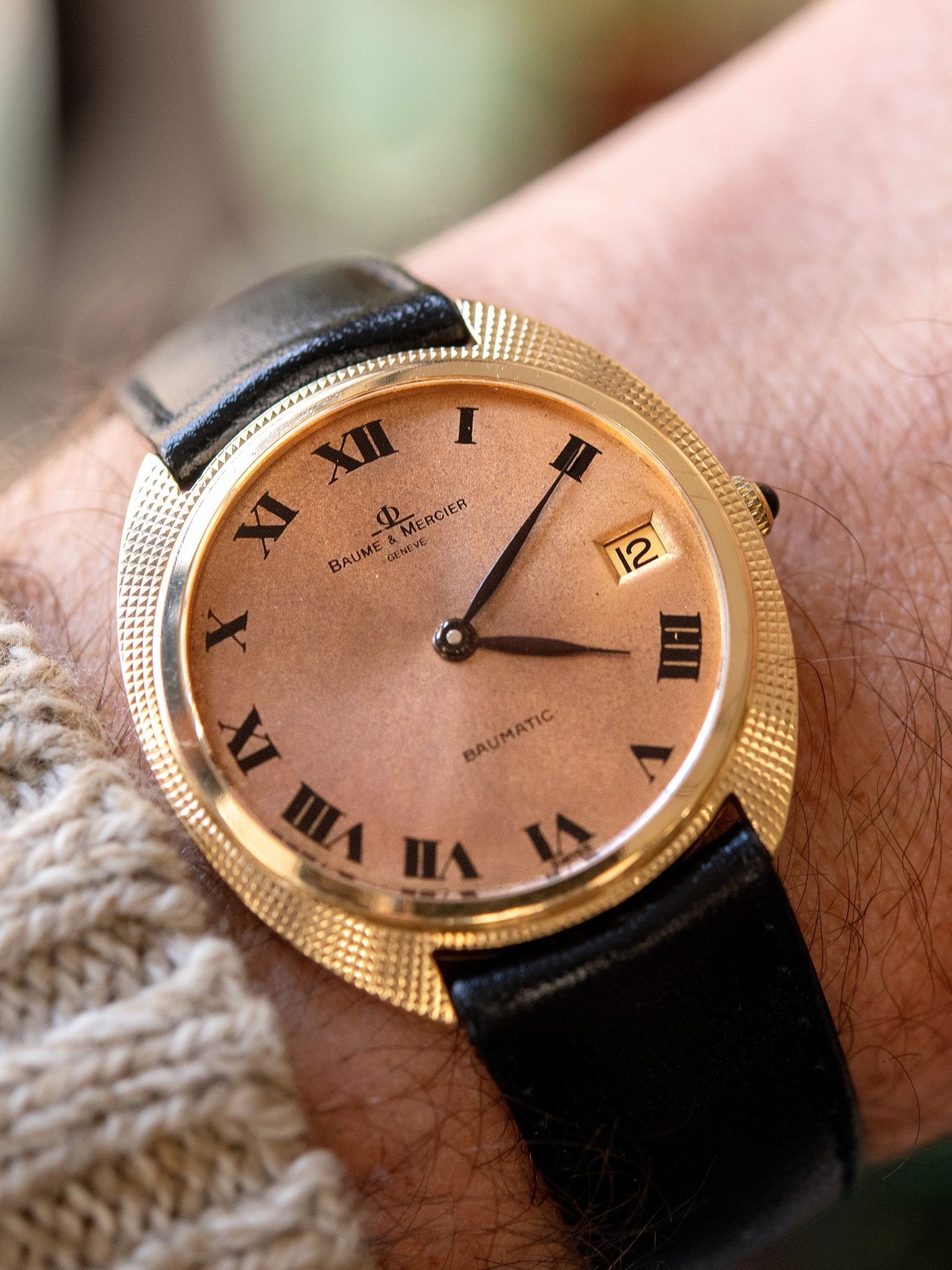 The interesting and devilishly handsome Baumatic ref. 35115 presented here is the perfect amalgamation of an Omega Constellation, Cartier Elipse, and a Patek Philippe Calatrava. The striking Clous de Paris, or hobnail, 18K yellow gold case is elegant, yet understated, and is the perfect backdrop for the perfectly aged "tropical" dial.