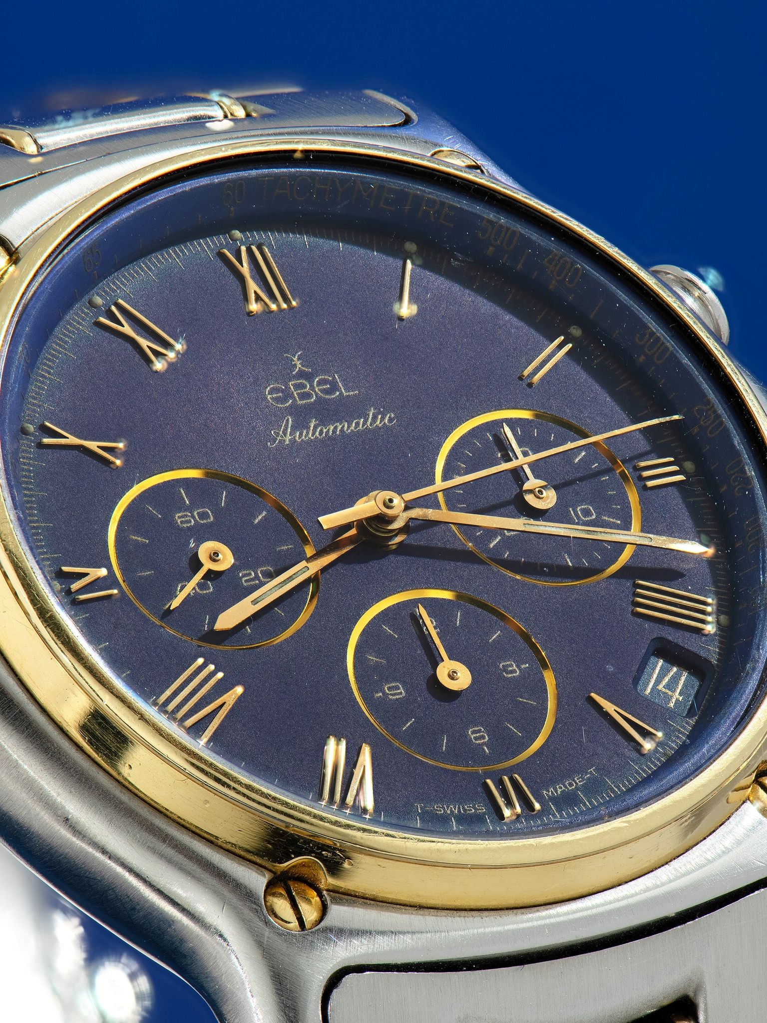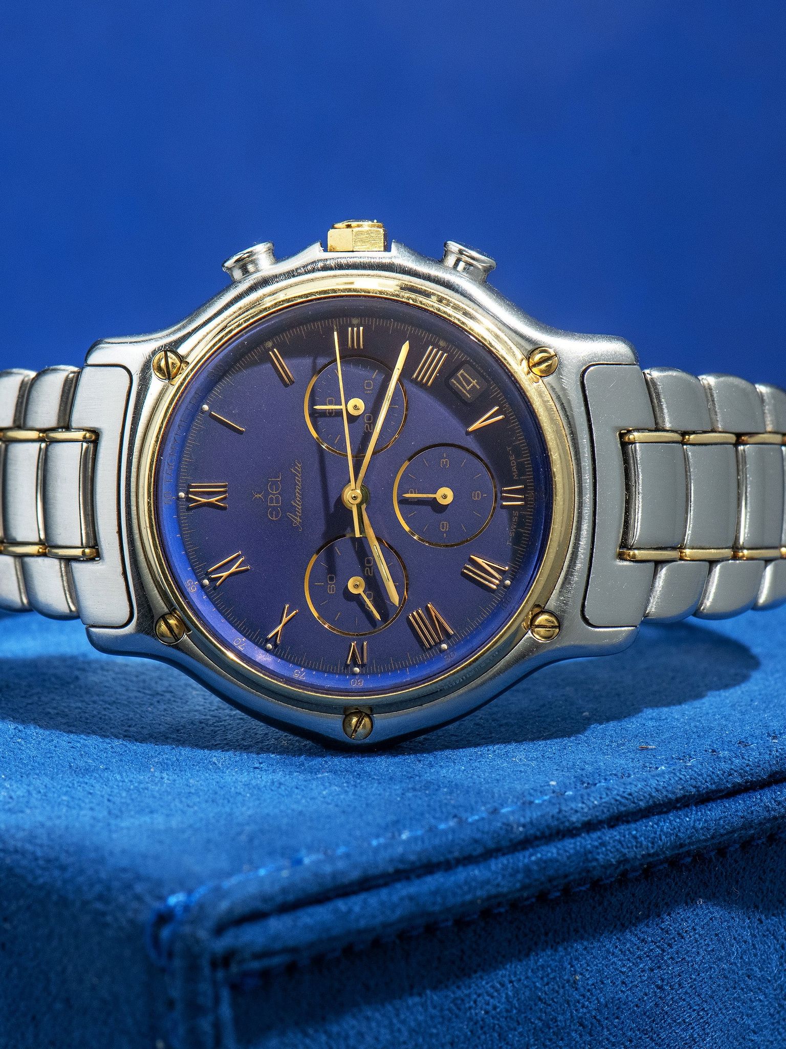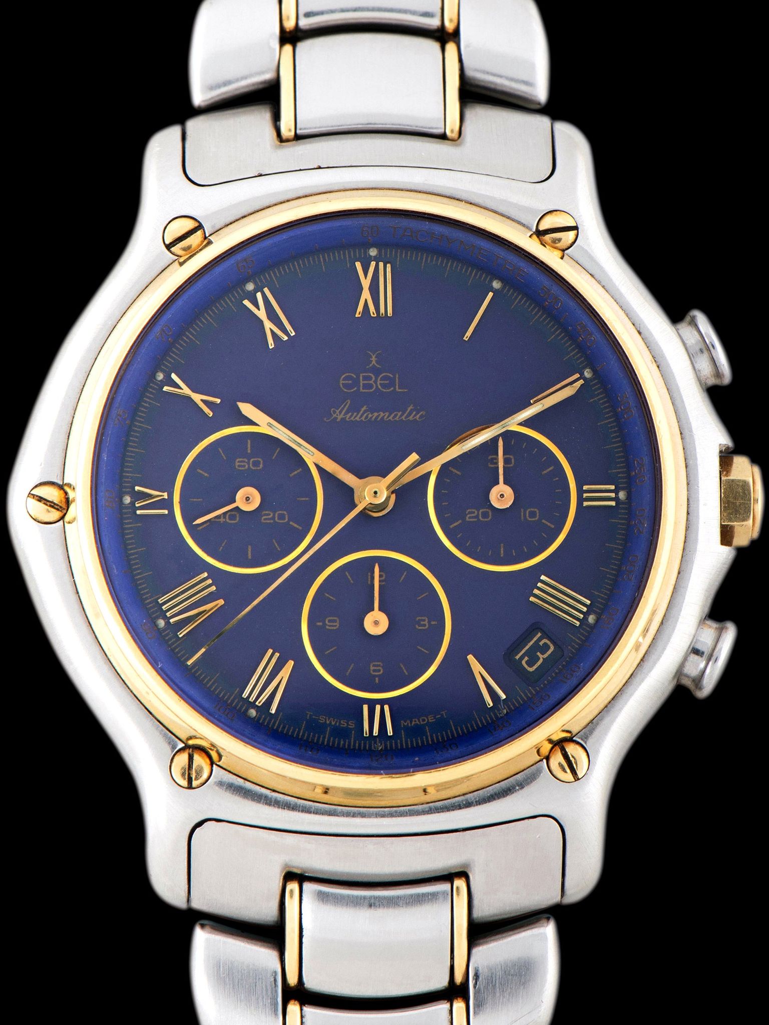 The two-tone stainless steel case, 18k gold bezel, and case screws are all very well preserved, showing minimal signs of previous use and no elements of over-polishing present. The case retains its original gold-capped hexagonal crown. The watch comes supplied on its original two-tone Ebel-signed bracelet, which retains 18 links that show almost no stretch and will fit up to a 6 3/4-inch wrist. The bracelet also comes with two additional links as well.