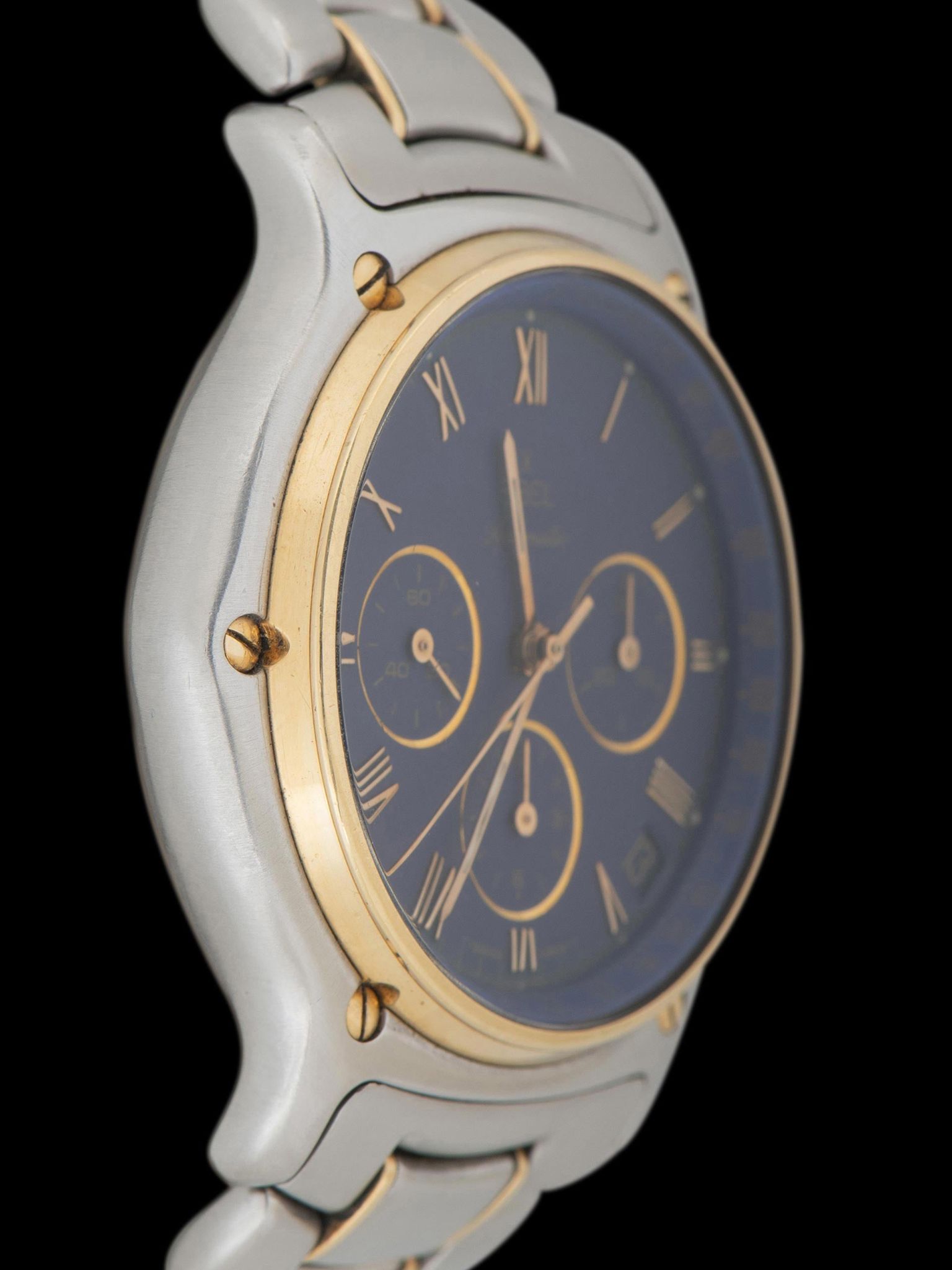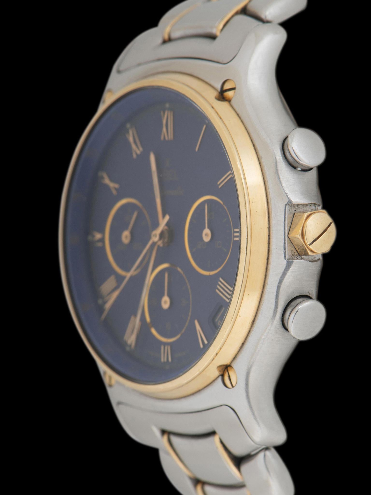 Today, vintage Ebel watches remain extremely undervalued despite being one of the most experimental and interesting watchmakers to come out of the 20th century, including this incredible automatic that seems to have taken a few design cues from the Royal Oak with its exposed case screws and hexagonal crown. The two-tone stainless steel/18k yellow gold case and bracelet, matched with the rich purple dial make the watch look almost regal while also keeping both feet firmly entrenched in a '90s design aesthetic.