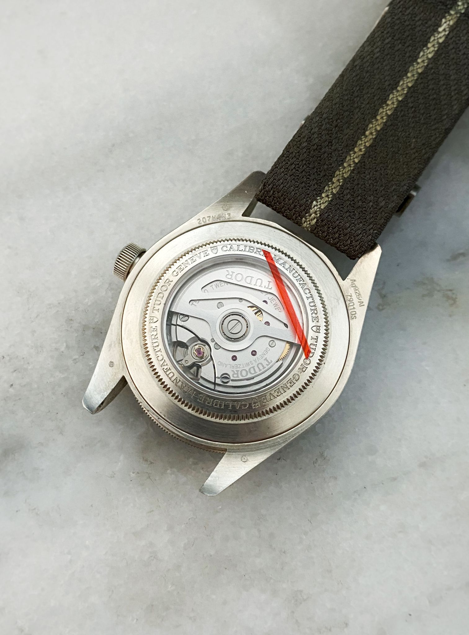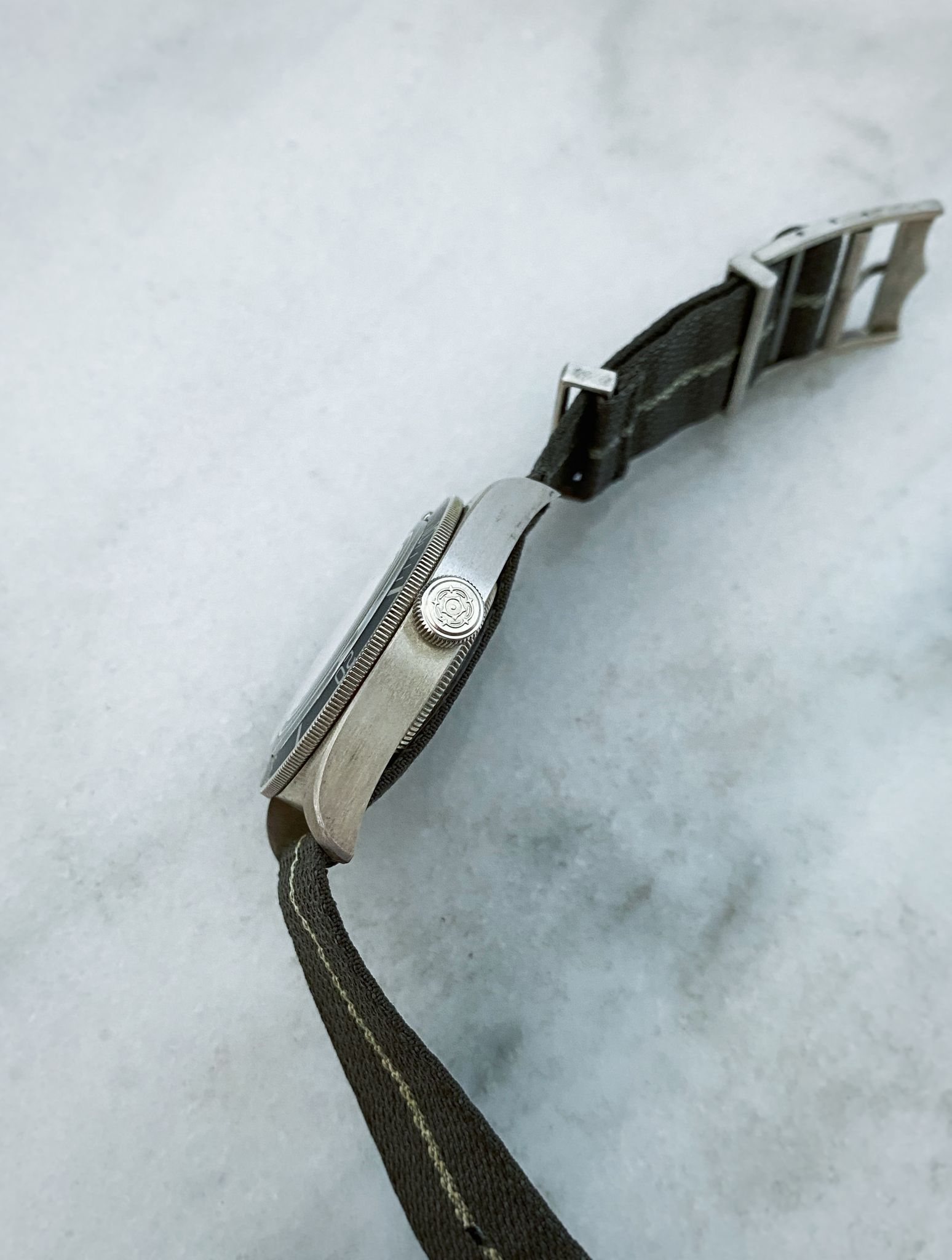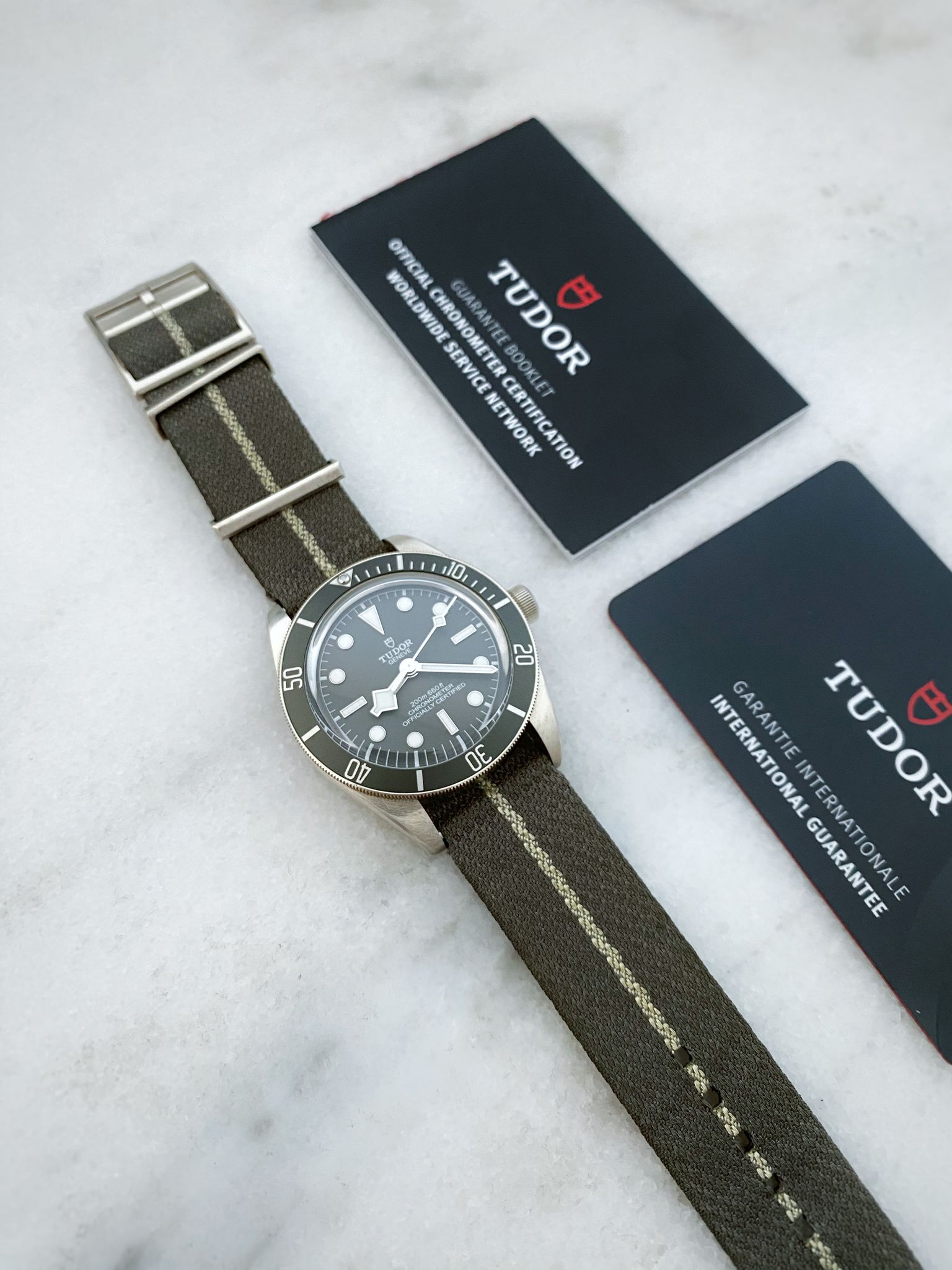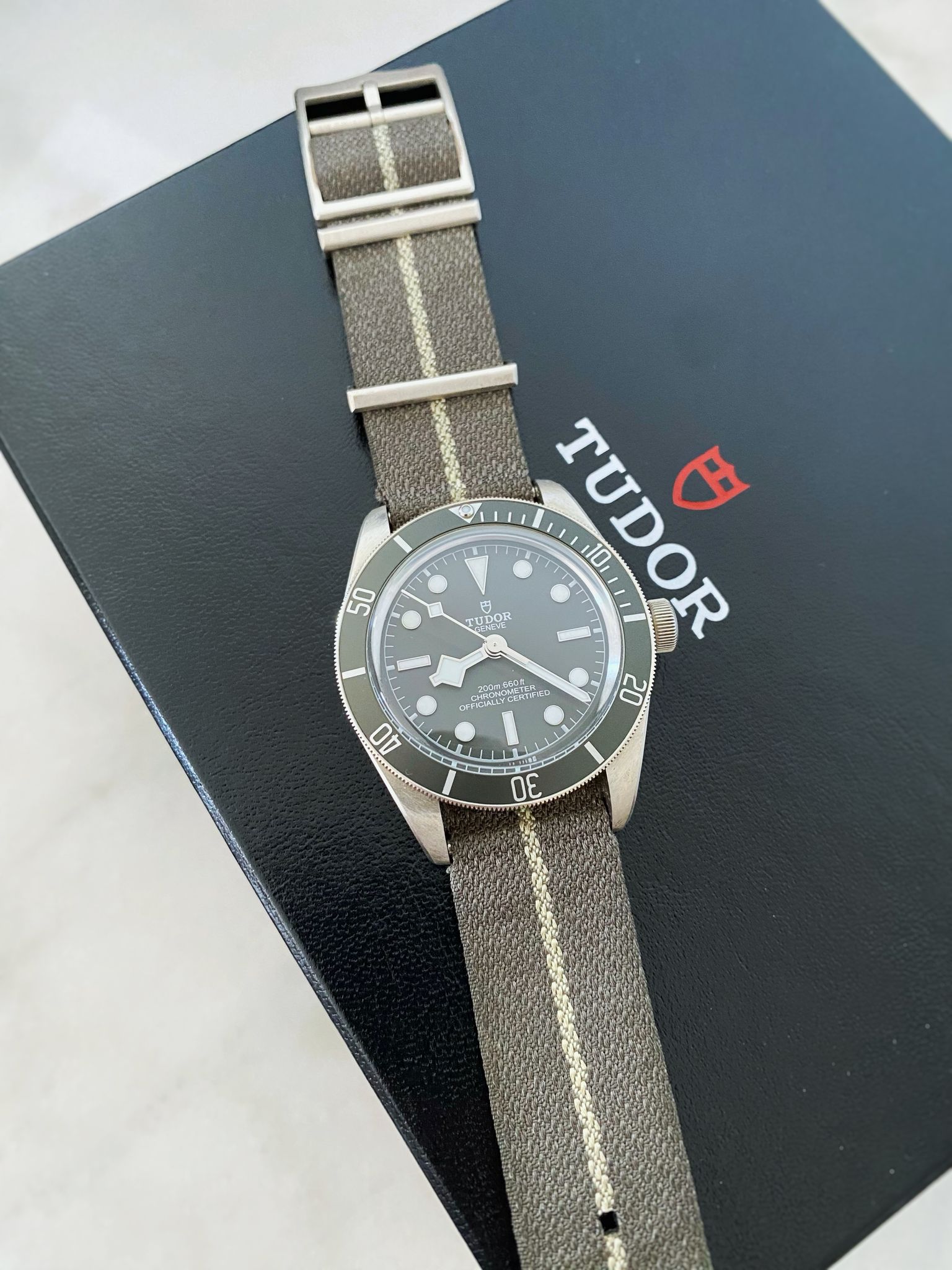 Note: Taupe dial & bezel, original taupe fabric strap with sterling silver hardware. Full-set.