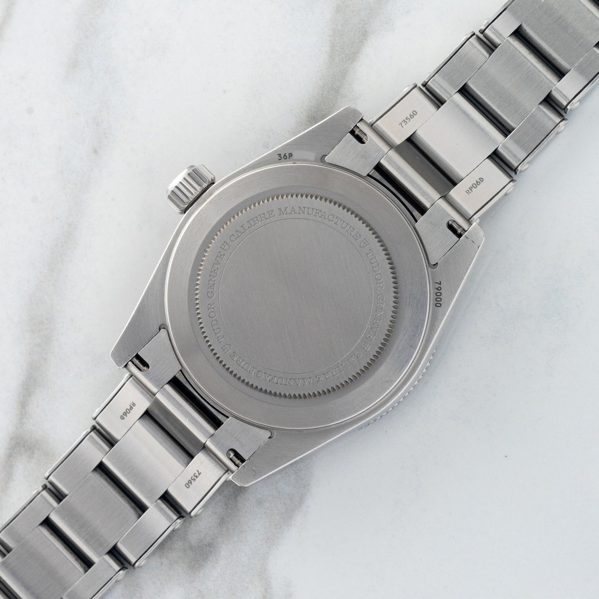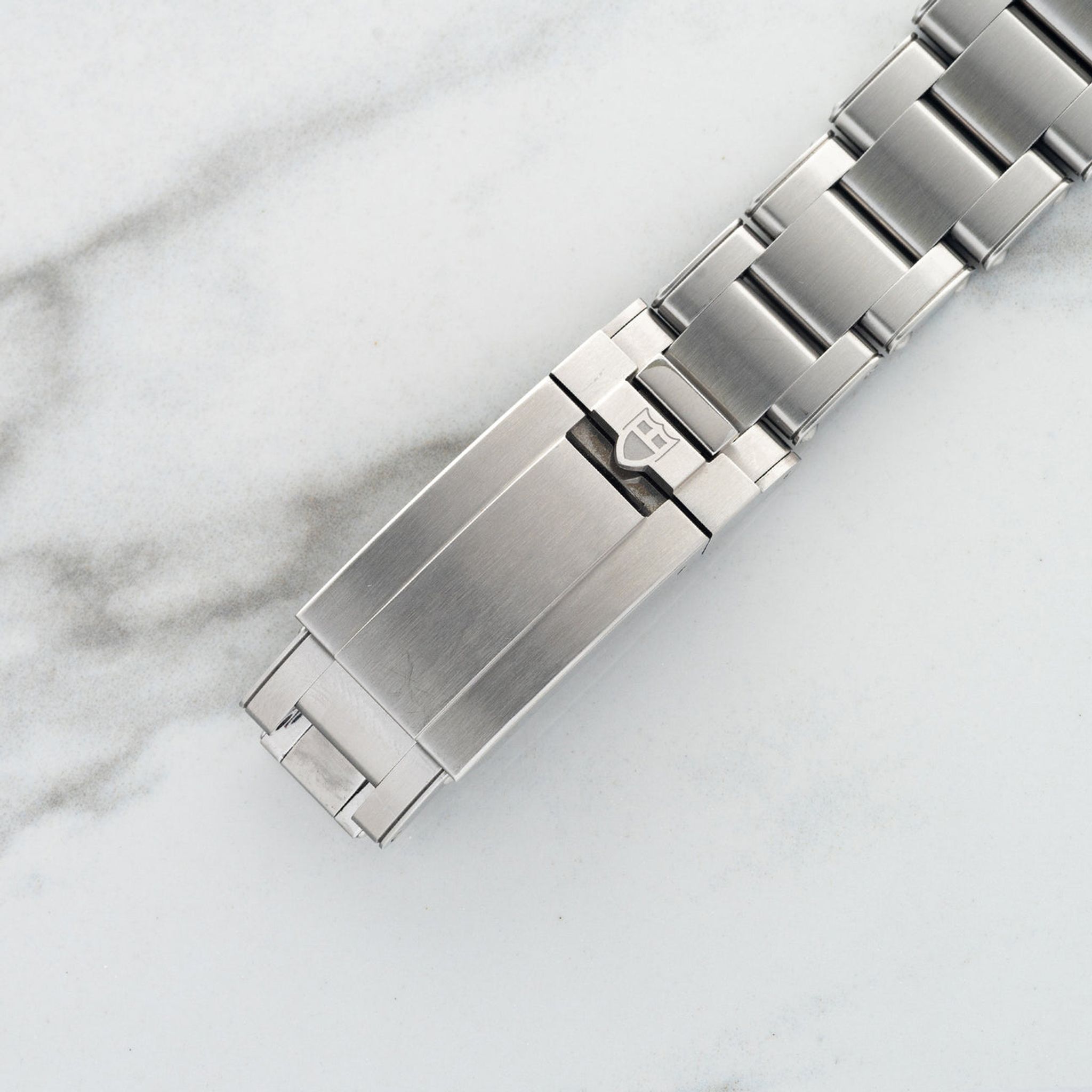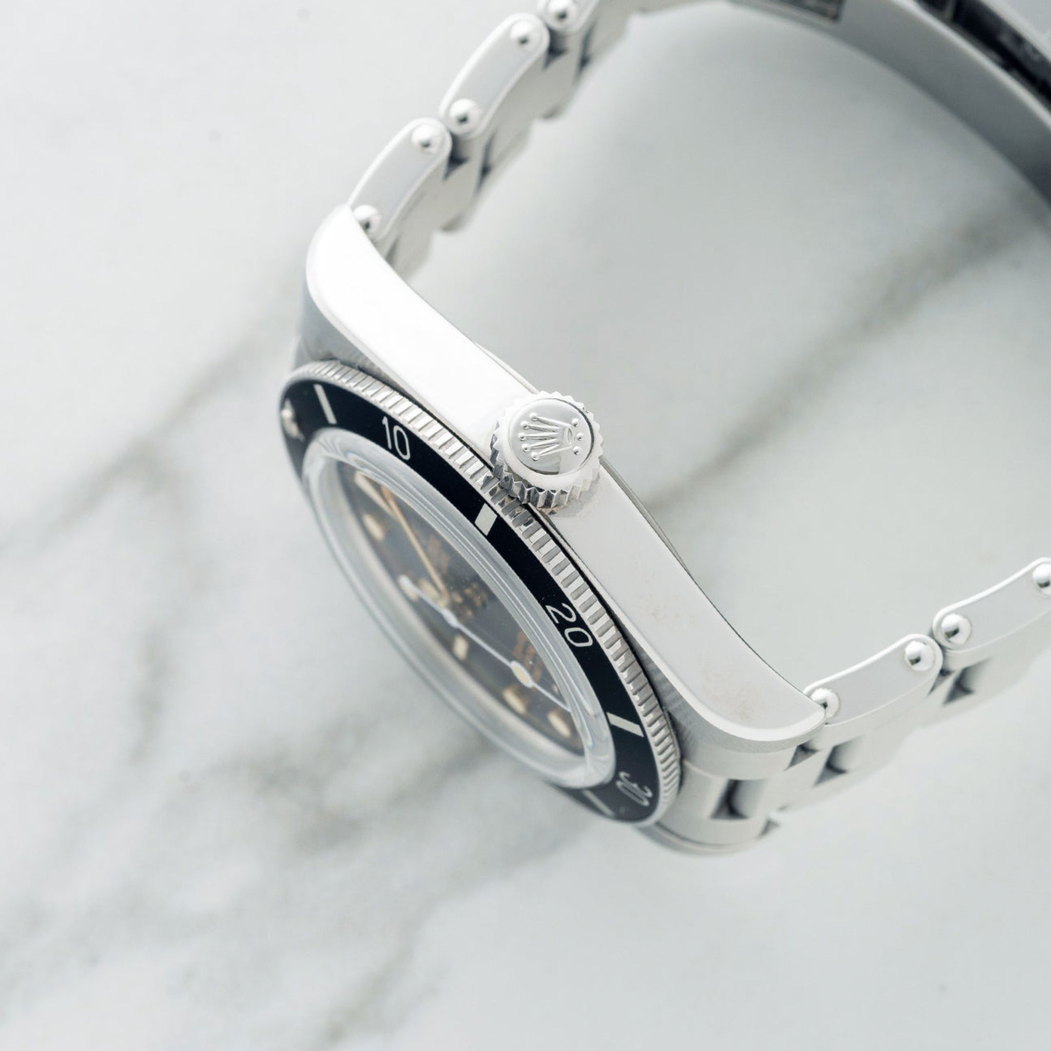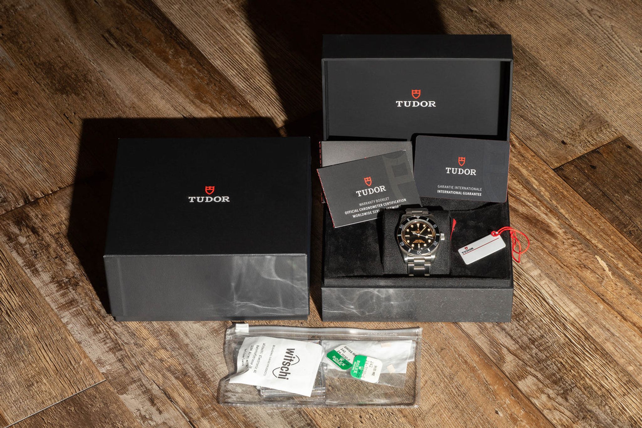 This particular piece has been modified by True Patina to resemble a "Big Crown" Submariner by the addition of gilt "Mercedes" hands and the addition of the larger crown the Sean Connery era Subs are so famous for. The addition of these creates a surprisingly strong combination of vintage aesthetic with modern practicality. Even the pop of the white "Lollipop" hand alone makes a huge difference to the overall look of this piece. More info on these mods and costs here as well as a YouTube video here. This piece comes complete with its, warranty card, boxes, booklets and hang tag as well as all of its original parts which are safely packaged with the set. We've priced this piece at a fair value considering the work done and if you're a vintage enthusiast looking for an elevated modern Tudor, this is the one to have.