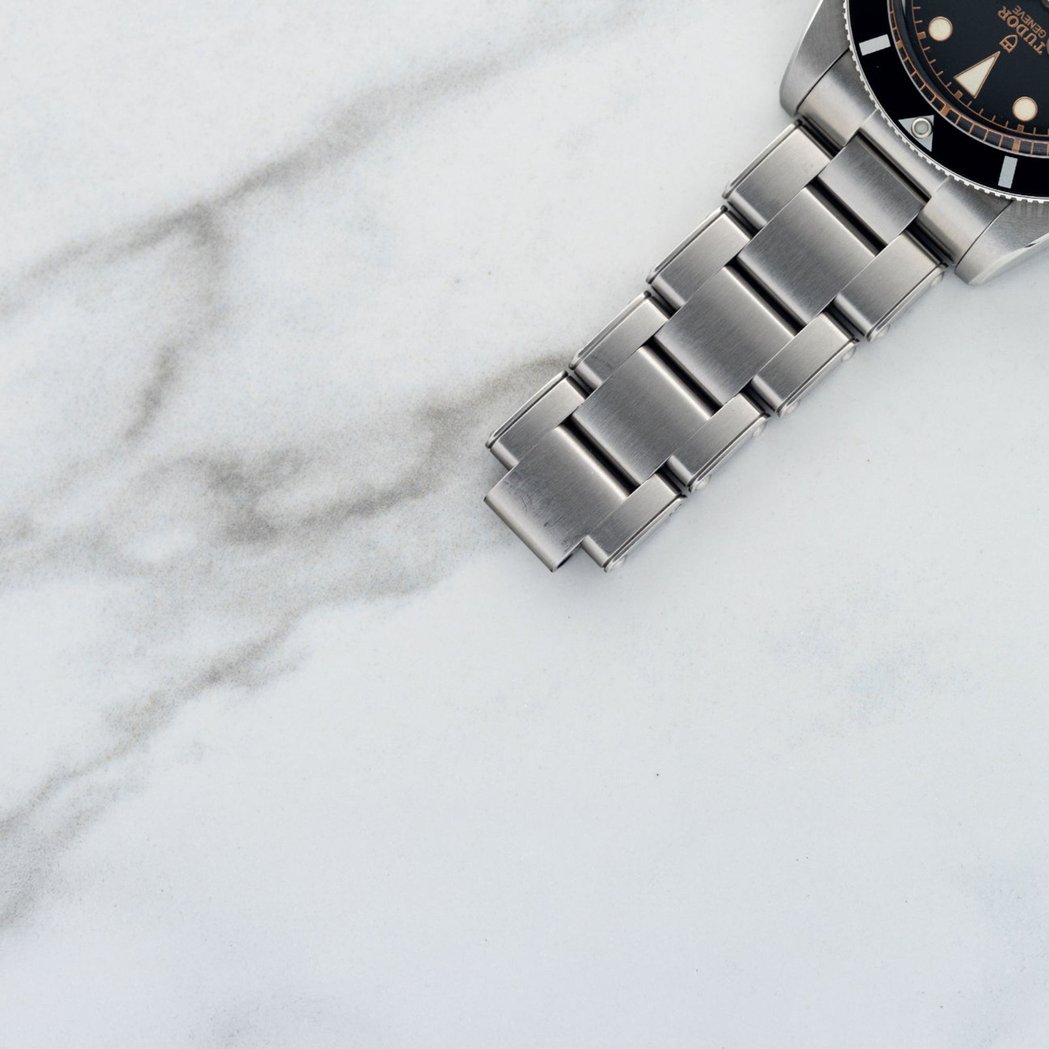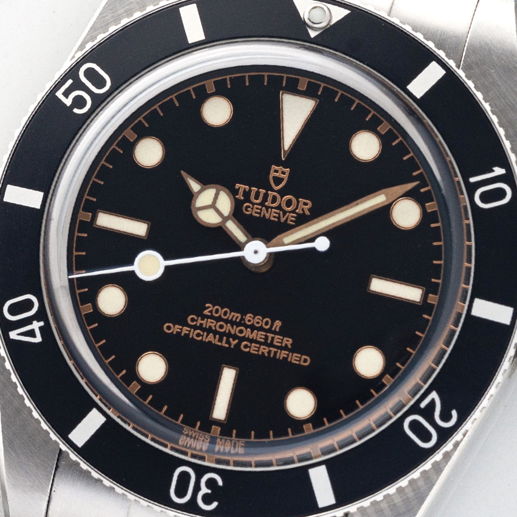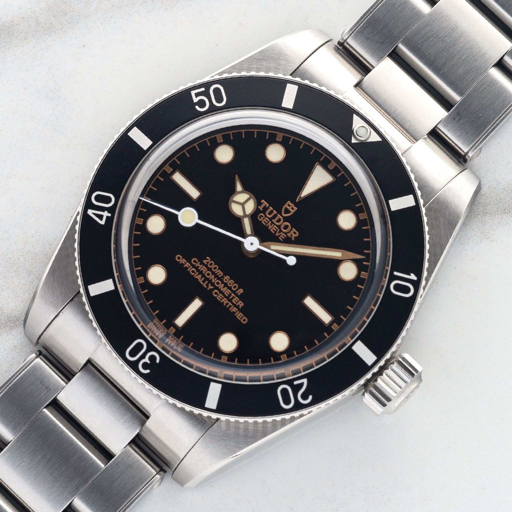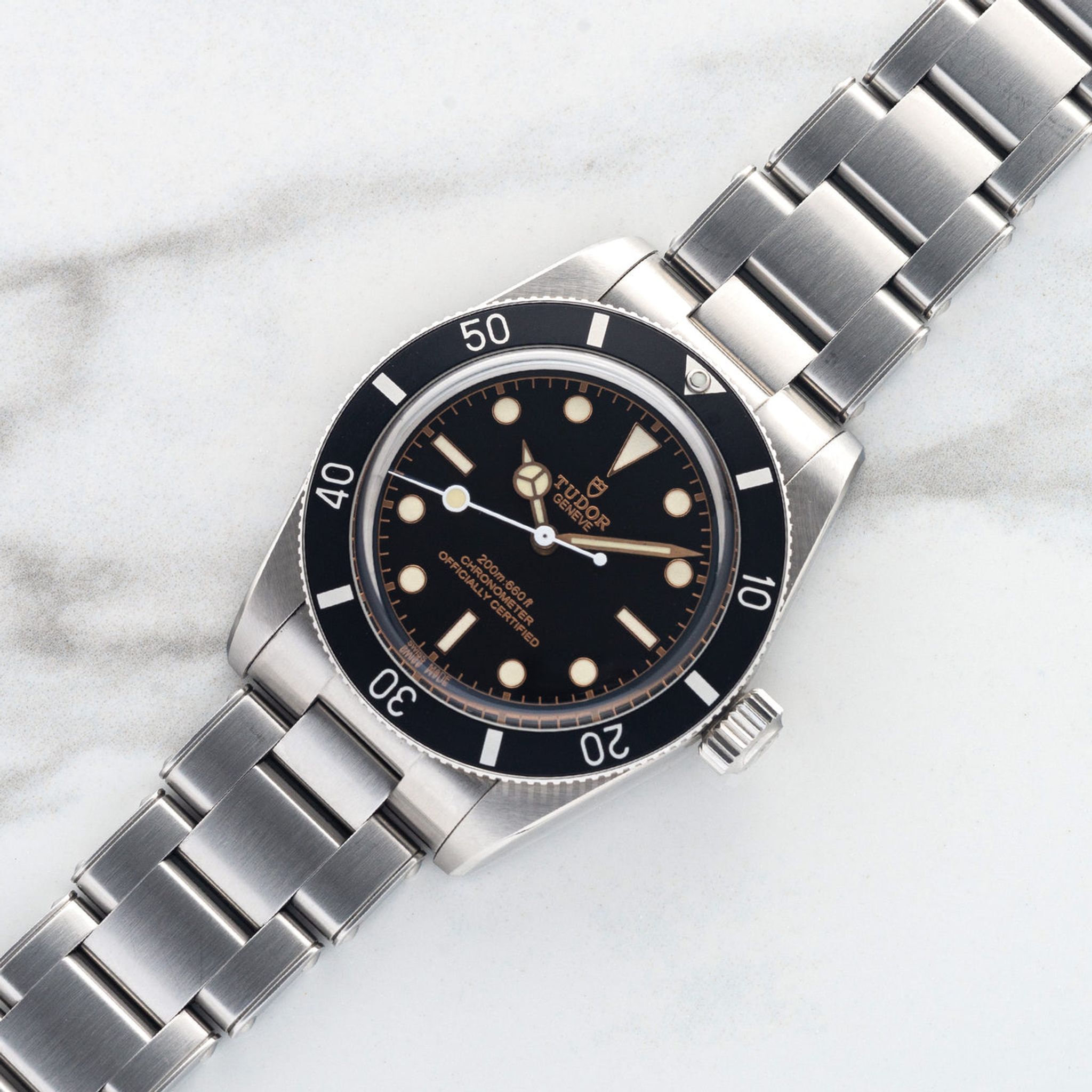 In 2023 Tudor's new Black Bay Fifty-Four release has easily been one of the highlights of the Swiss watch industry's novelties. Pulling from their earliest dive watch reference 7022, Tudor effectively re-released an iconic "small crown" Submariner from 1954. The updated 37.5mm case features slimmer all around proportions and an in house movement. This is a welcome change for anyone who prefers a more vintage aesthetic and for the purists, it's a package that's not only a joy to wear but immensely practical to own as a daily driver. The rose gold gilt indices and hands and off white lume add to its warmth, making it a great contender for a myriad of straps.