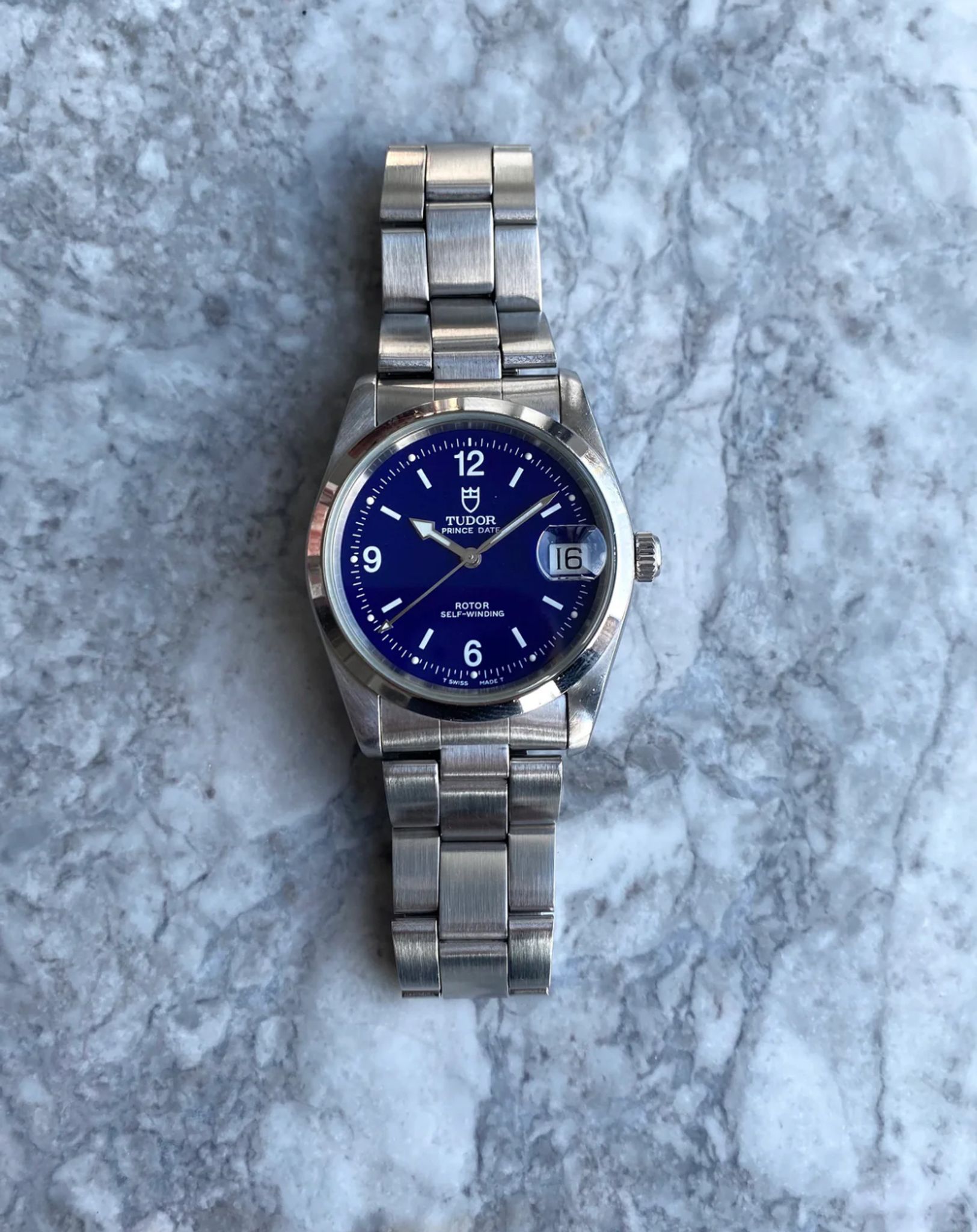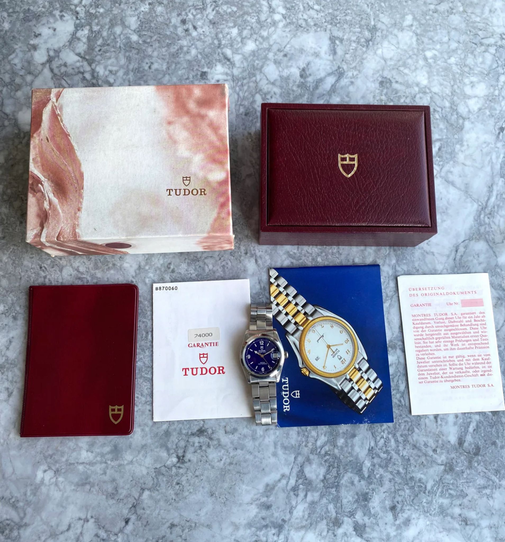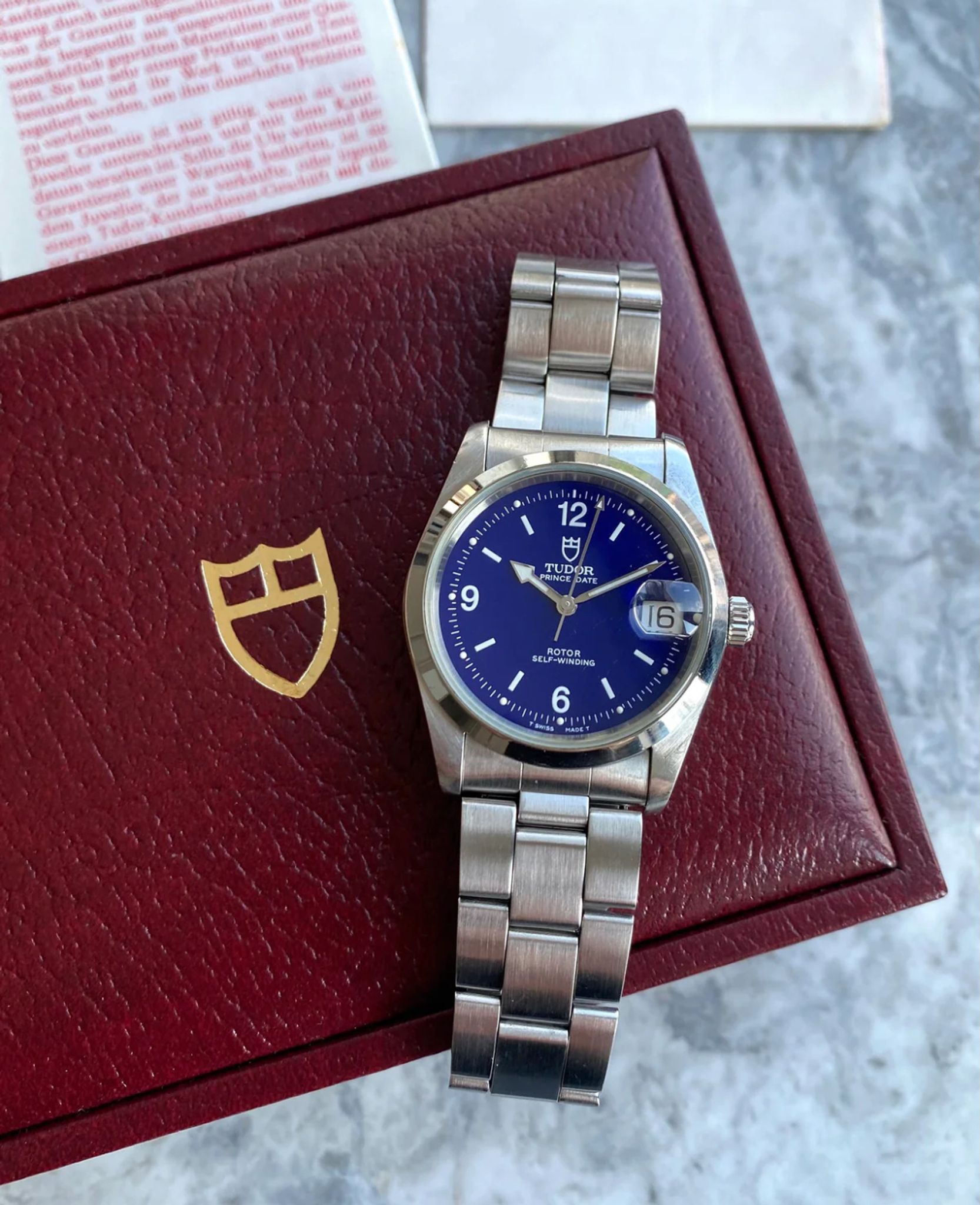Here's a vintage Tudor prince date automatic reference number 74000 with a rare dark blue arabic numeral dial from the 80s to 90s. Keeps great time and is fully functional. Measurements include a 34mm oyster case and 19mm lug width. It's on its original Tudor rivet bracelet that fits up to a 7.25inch wrist. Time and quickset date function at 3 a clock. Egg white dial. Smooth steel bezel. Caliber 2824-2 (ETA movement). Arabic numerals with white arrow hands. Lume in both the hands and lume plots are a matching crisp white. Steel case and caseback. It comes with its original box, papers, pamphlets, and outer box as seen in photos. All parts are original including the signed Rolex crown, caseback, dial, and movement. Both the dial and case are in great cosmetic, untouched condition.