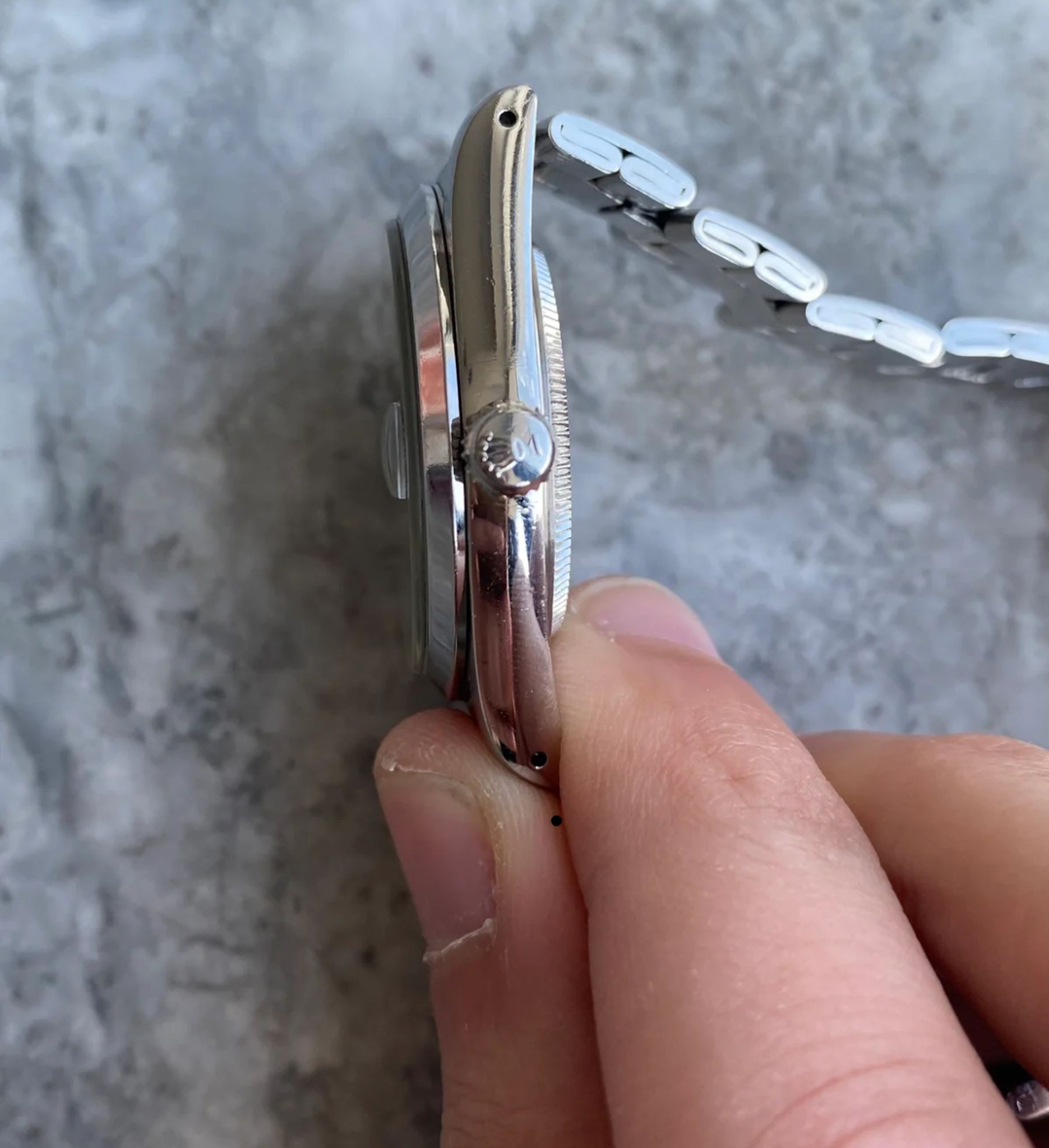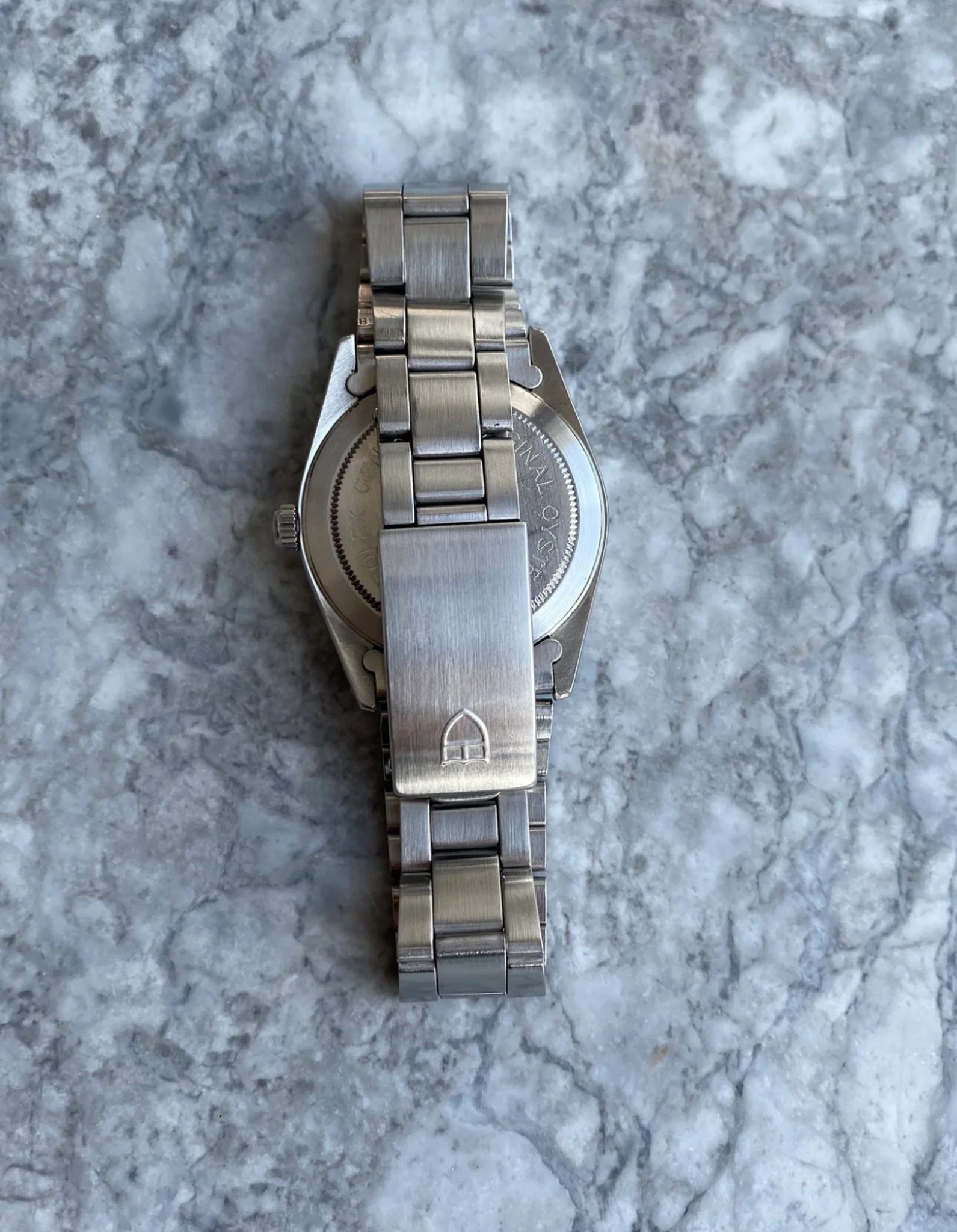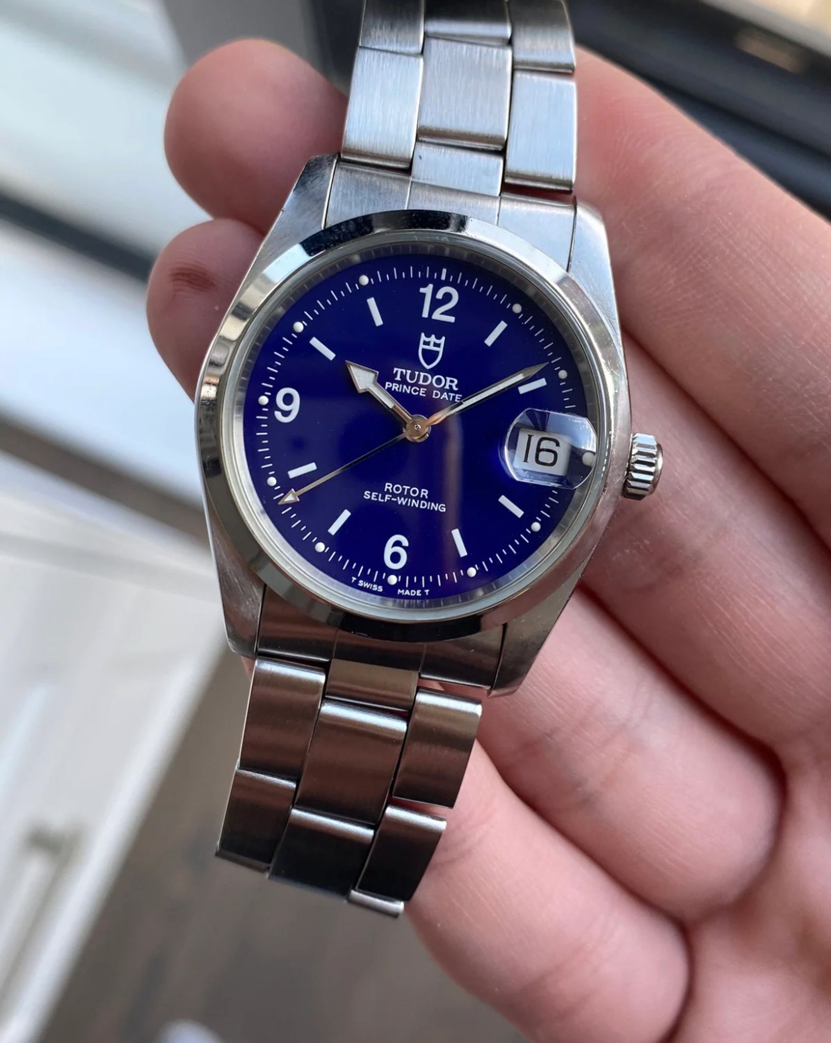 Here's a vintage Tudor prince date automatic reference number 74000 with a rare dark blue arabic numeral dial from the 80s to 90s. Keeps great time and is fully functional. Measurements include a 34mm oyster case and 19mm lug width. It's on its original Tudor rivet bracelet that fits up to a 7.25inch wrist. Time and quickset date function at 3 a clock. Egg white dial. Smooth steel bezel. Caliber 2824-2 (ETA movement). Arabic numerals with white arrow hands. Lume in both the hands and lume plots are a matching crisp white. Steel case and caseback. It comes with its original box, papers, pamphlets, and outer box as seen in photos. All parts are original including the signed Rolex crown, caseback, dial, and movement. Both the dial and case are in great cosmetic, untouched condition.