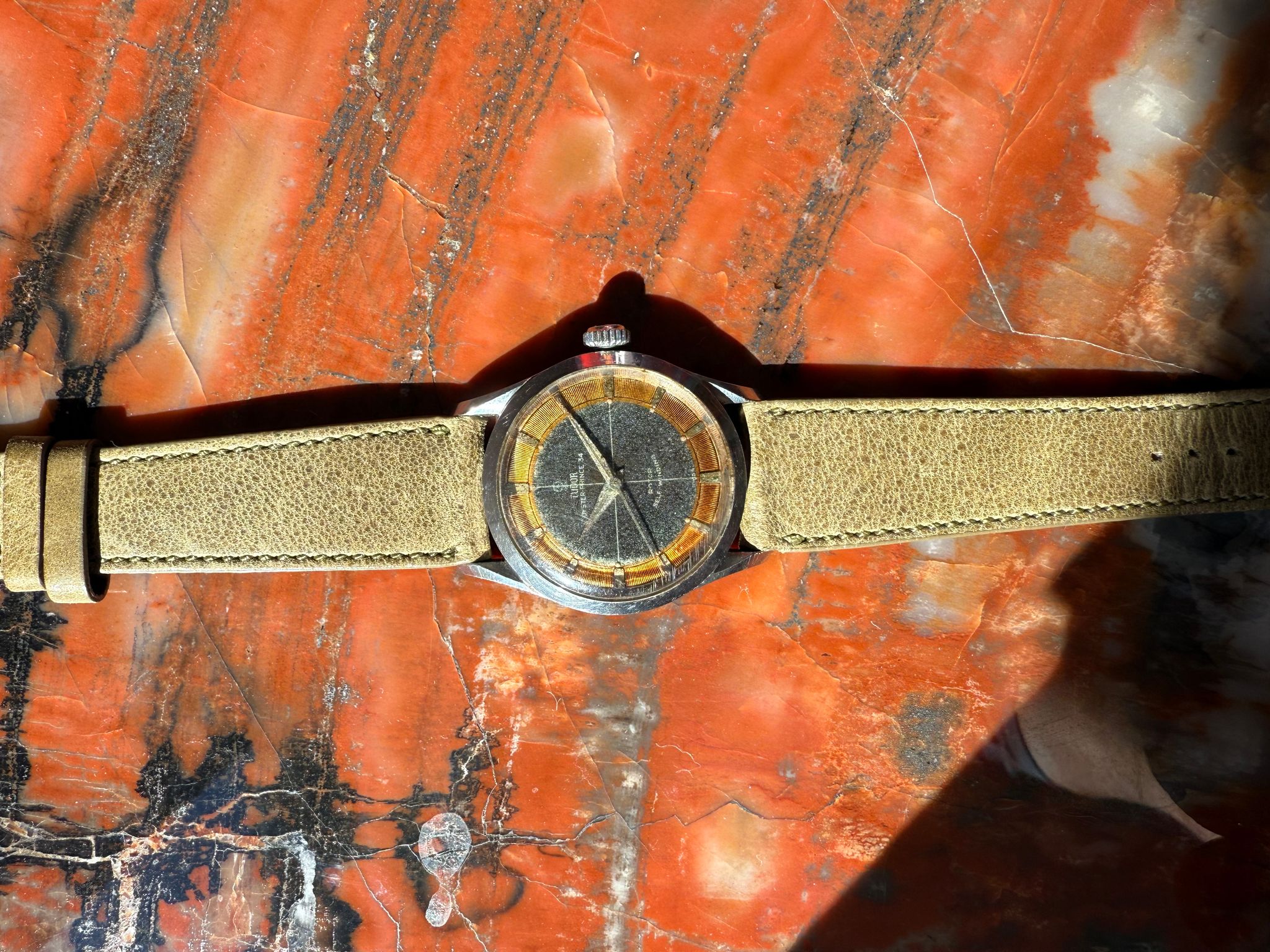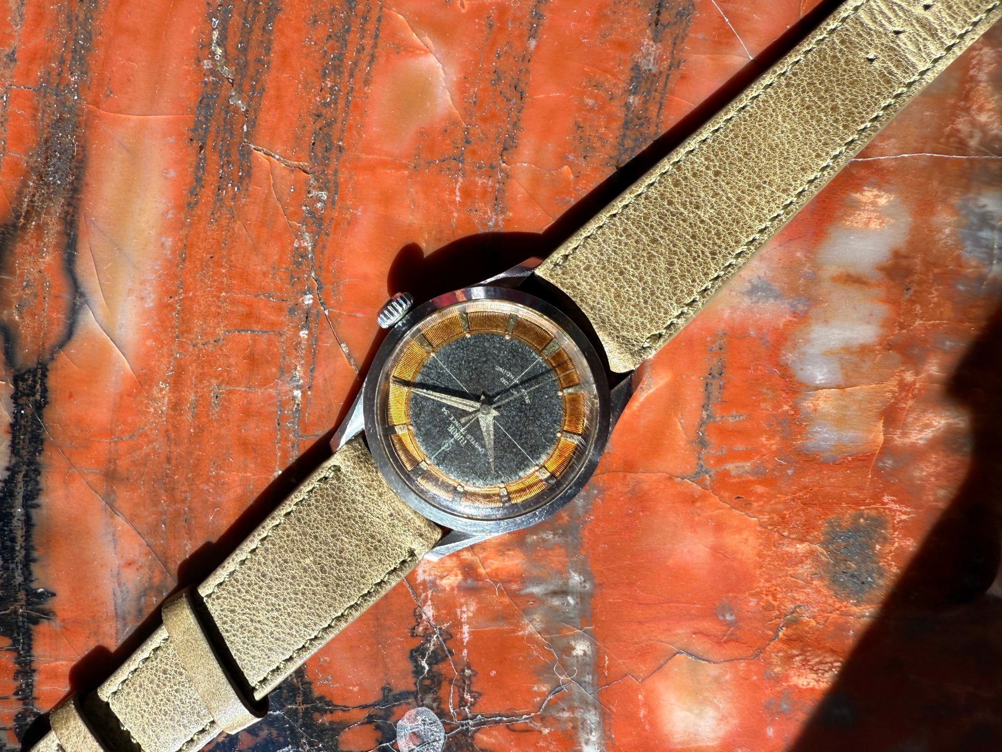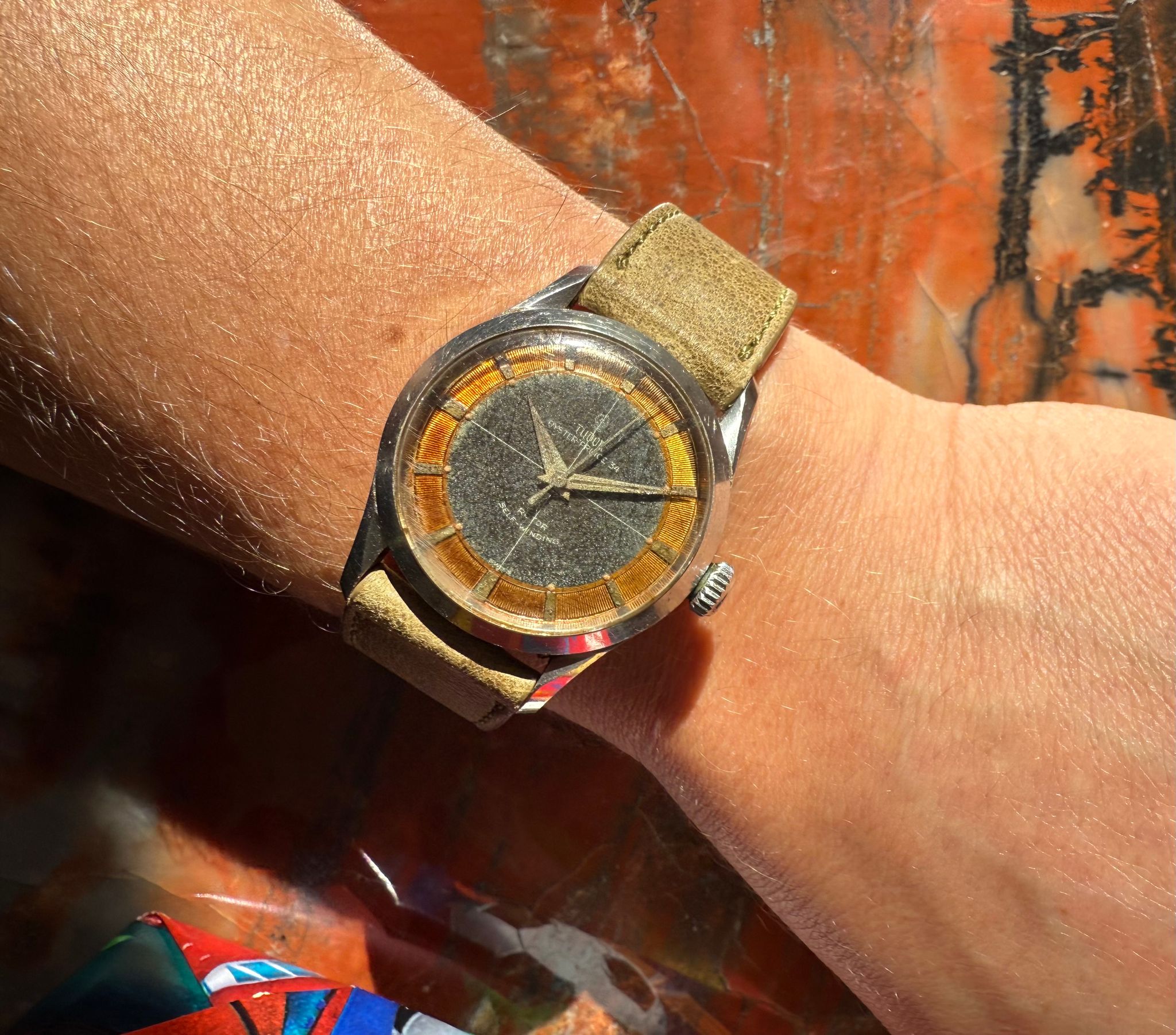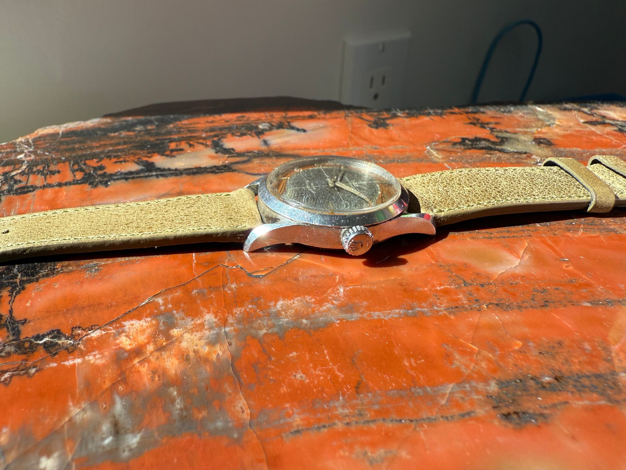 The Tudor stainless steel Oyster Prince is truly unique. The two-color decorated dial has turned a tropical orange color.. Perfect for all occasions. We love the patina on the dial and the stunning look. This watch measures 34mm with a stainless steel case and smooth stainless steel bezel. From the late 1950s, this Tudor vintage watch features an automatic movement and comes fitted on a green custom leather strap. Want to style it your own way? Please contact us for more information about the assorted straps we offer. The watch has not been serviced in our possession. The acrylic crystal shows wear and use.