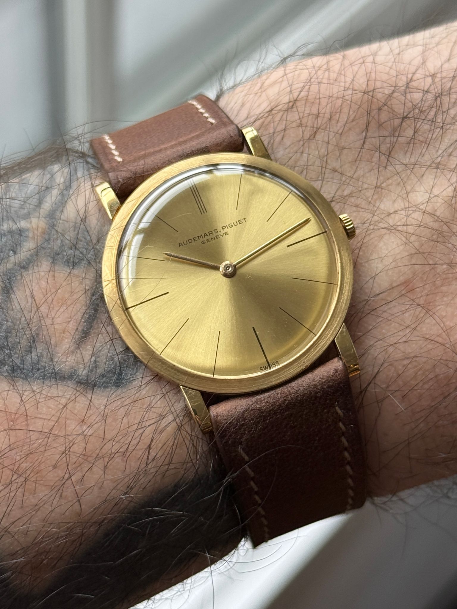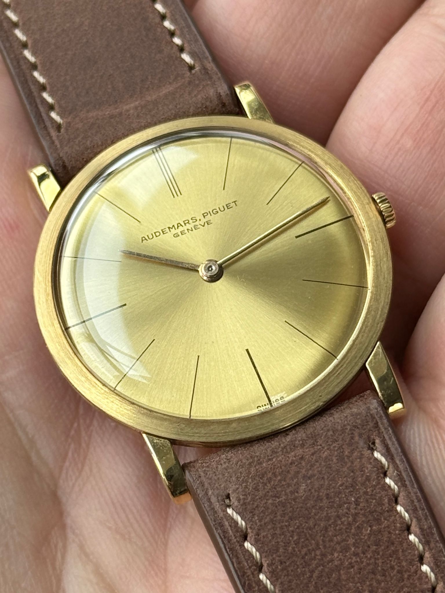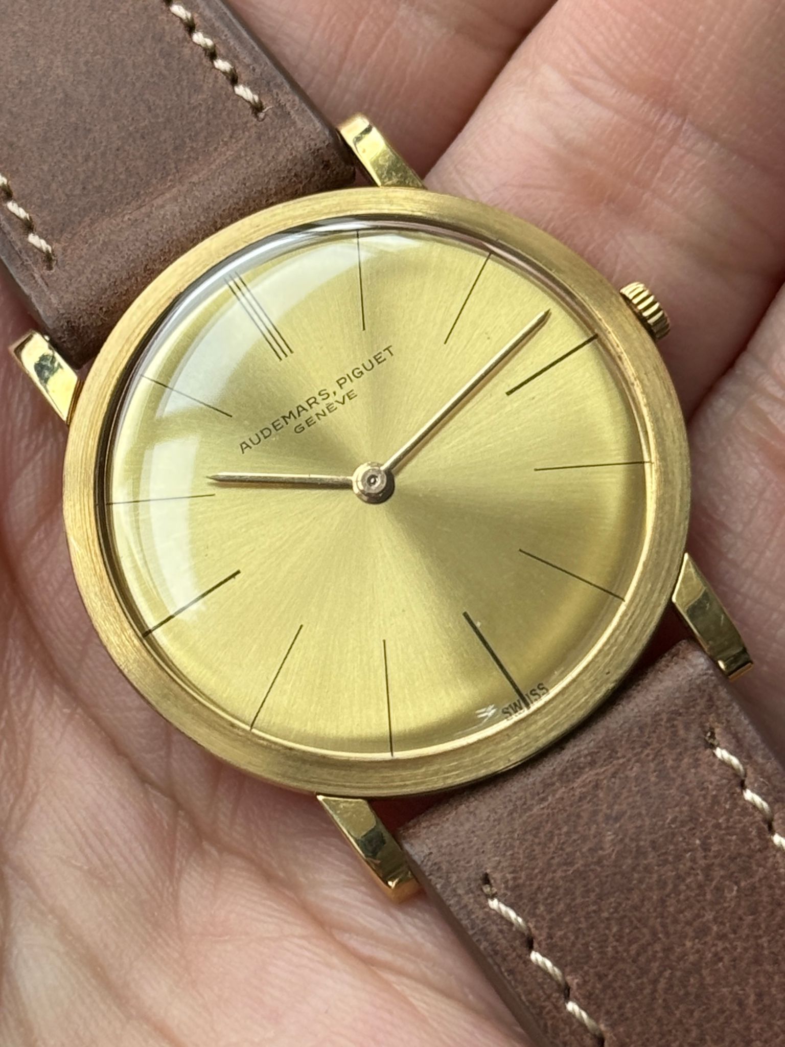 Audemars Piguet ultra thin dress watch in gorgeous condition from the 1960s. Manual wind caliber 2003. Measures 31.5mm in diameter and 35.5mm lug to lug. After market buckle. Please check out the photos to see how this shines at different angles.