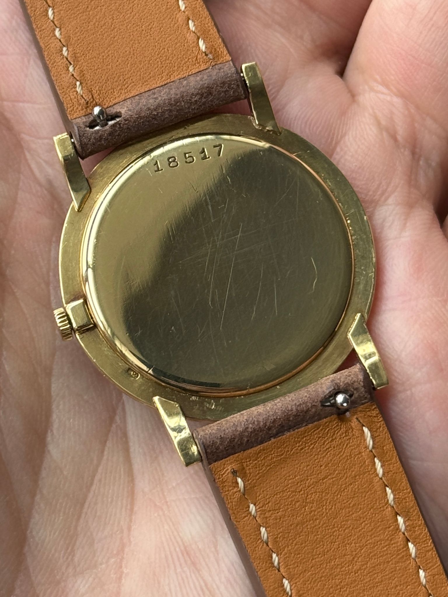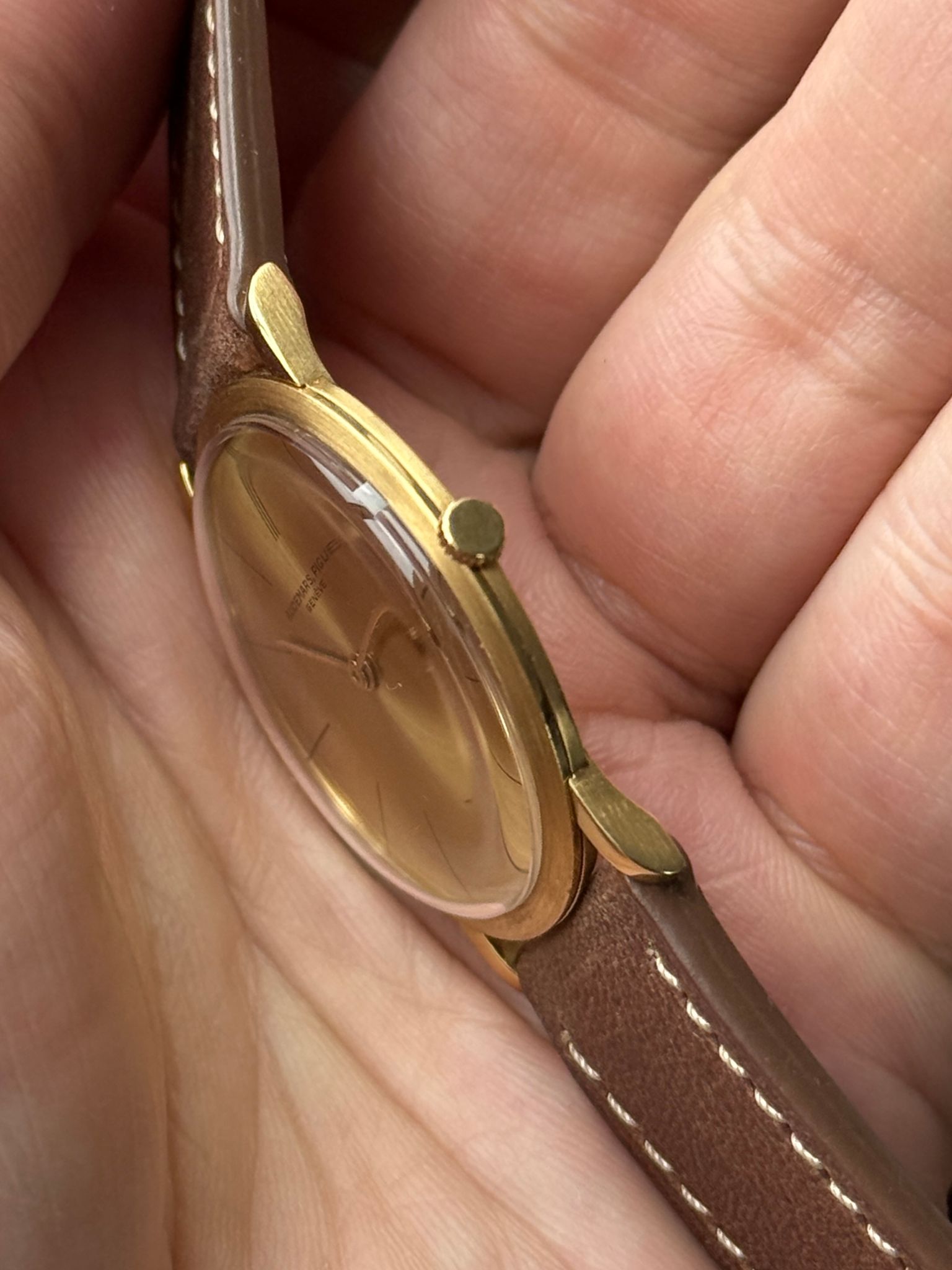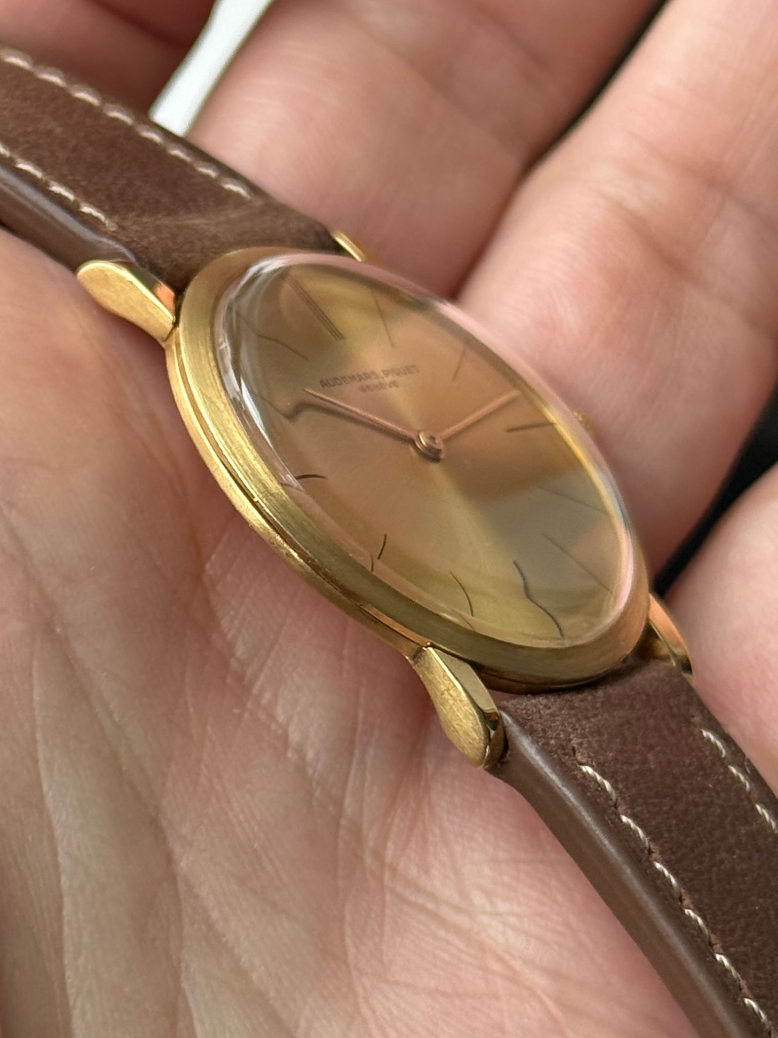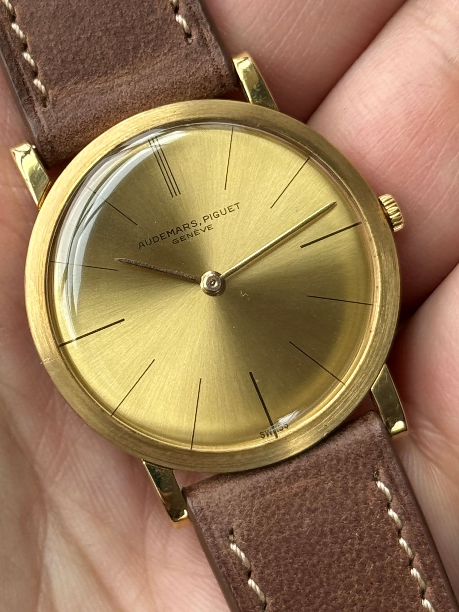 Audemars Piguet ultra thin dress watch in gorgeous condition from the 1960s. Manual wind caliber 2003. Measures 31.5mm in diameter and 35.5mm lug to lug. After market buckle. Please check out the photos to see how this shines at different angles.