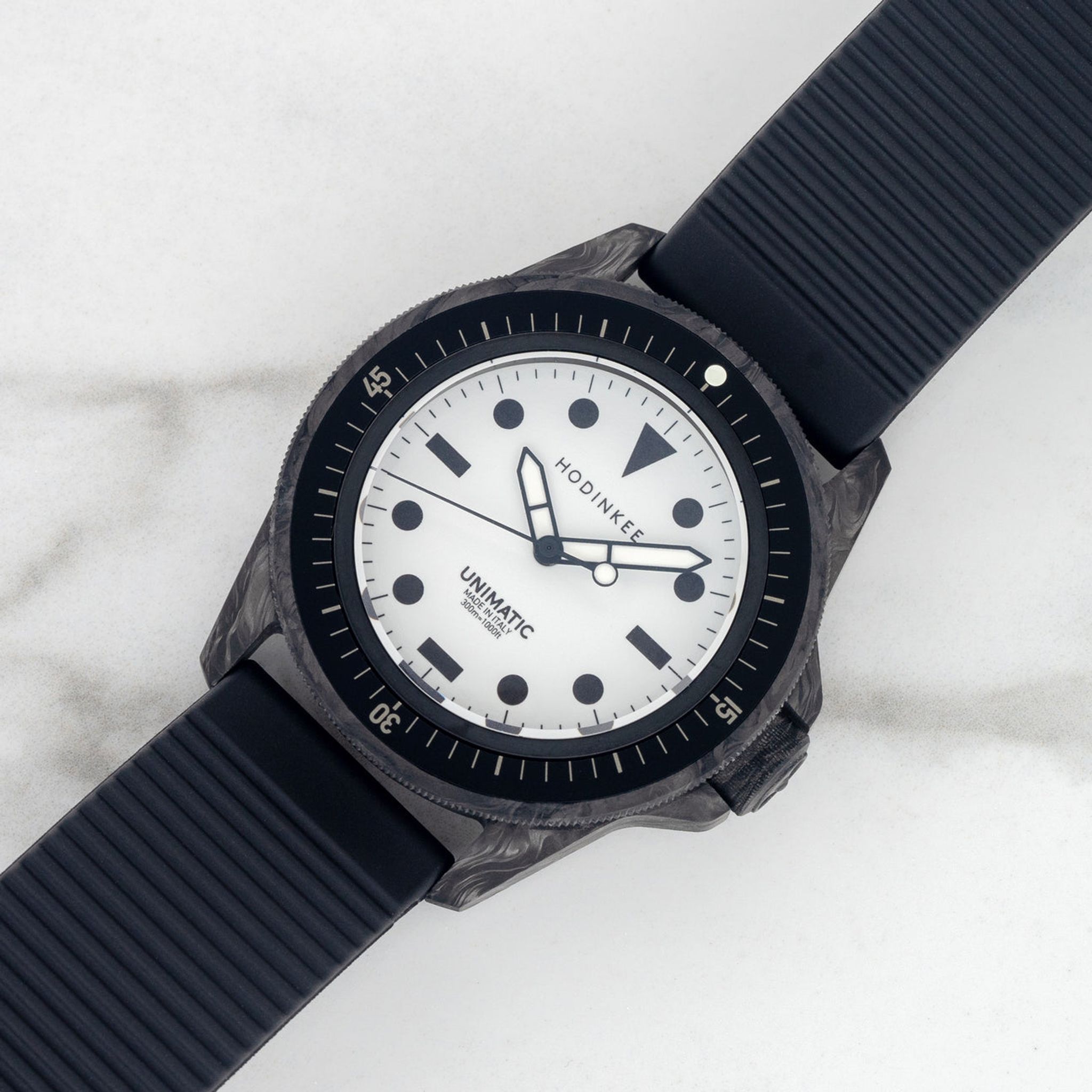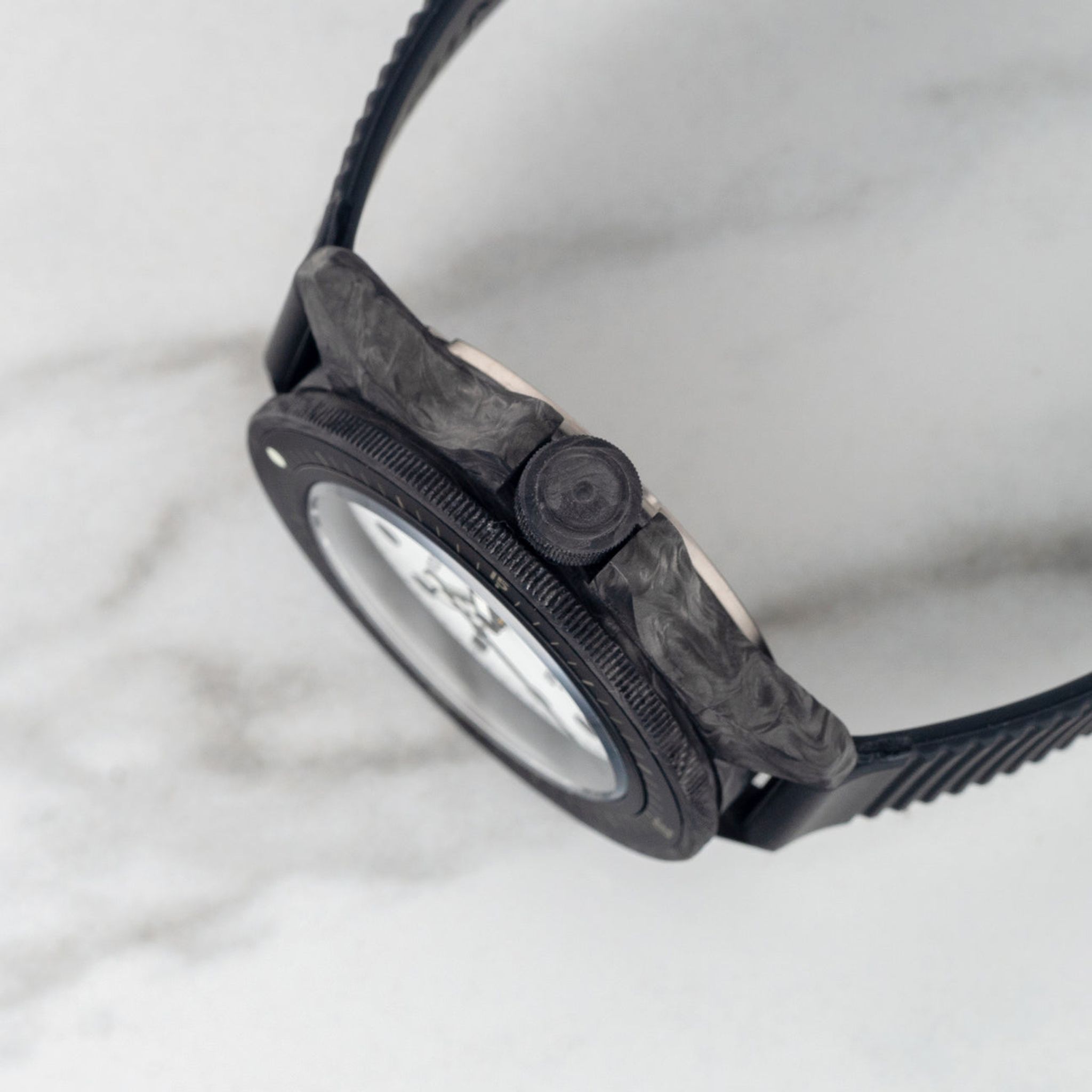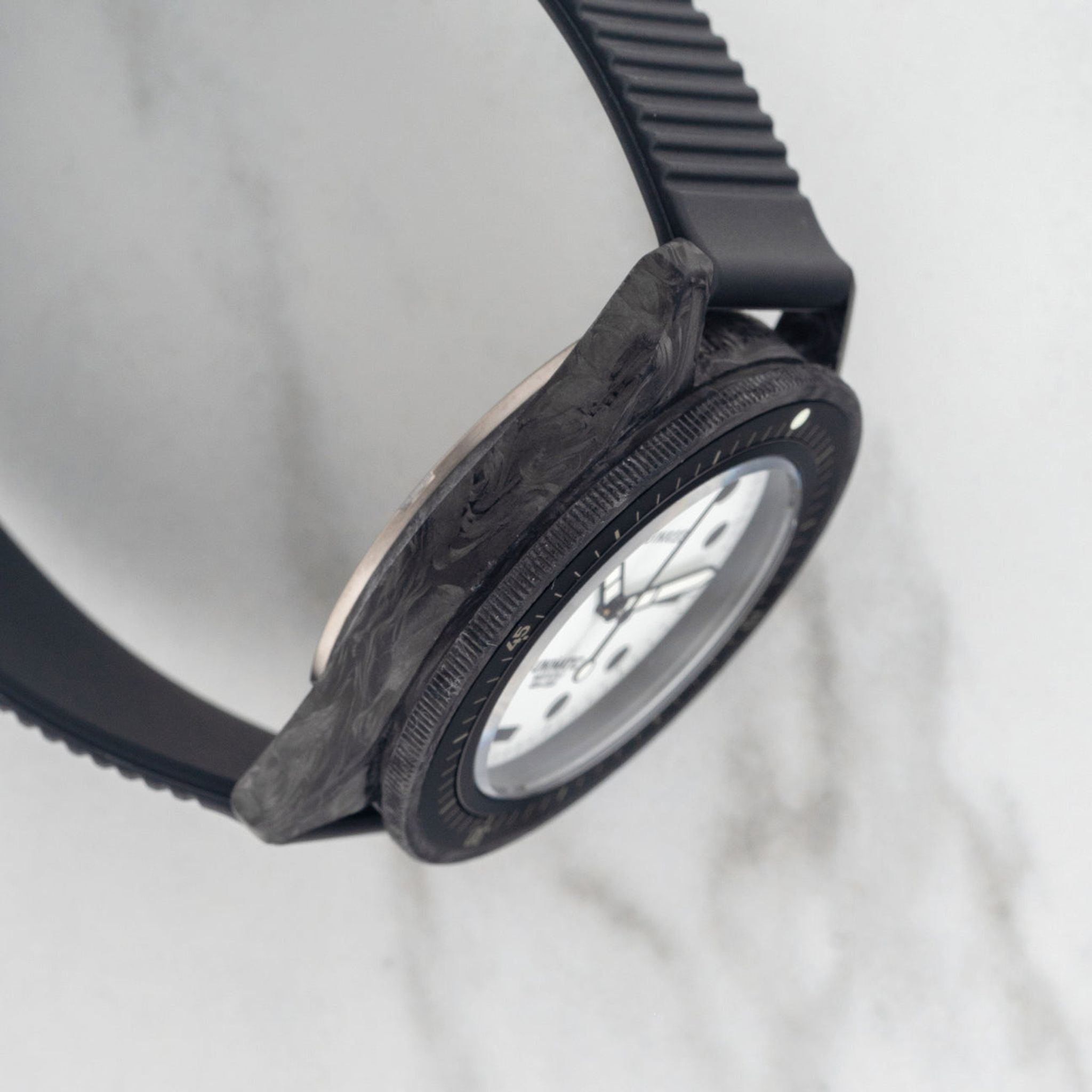 Up for grabs is this carbon Limited Edition for Hodinkee. This piece has a white dial which pops well agains the black monochrome appearance of the rest of the watch. The dial and hands are luminescent and the ultra-light 40mm case has a screw down crown for 300m of water resistance. This is a highly practical daily driver coming as a complete set from new.