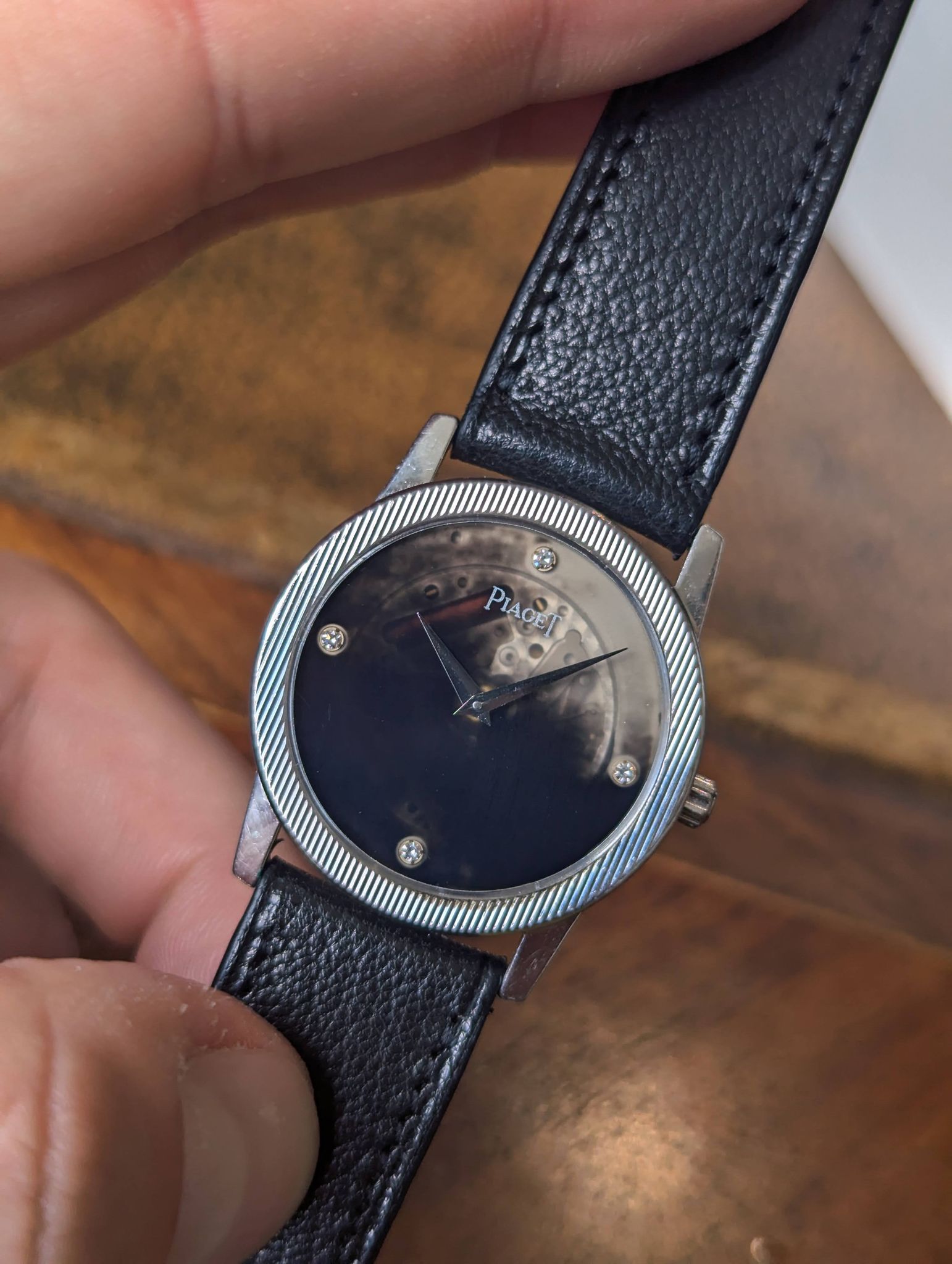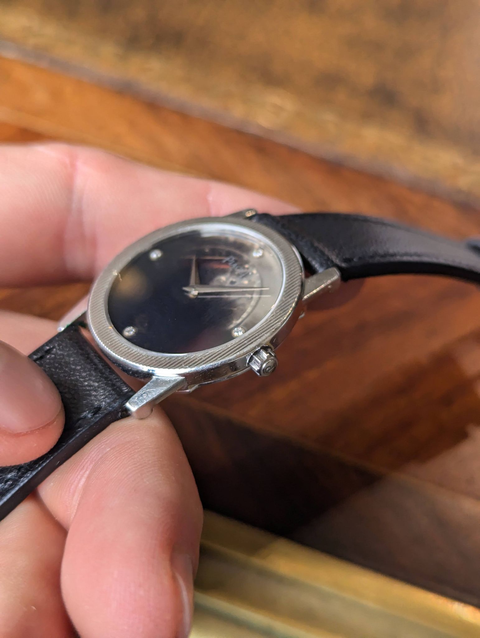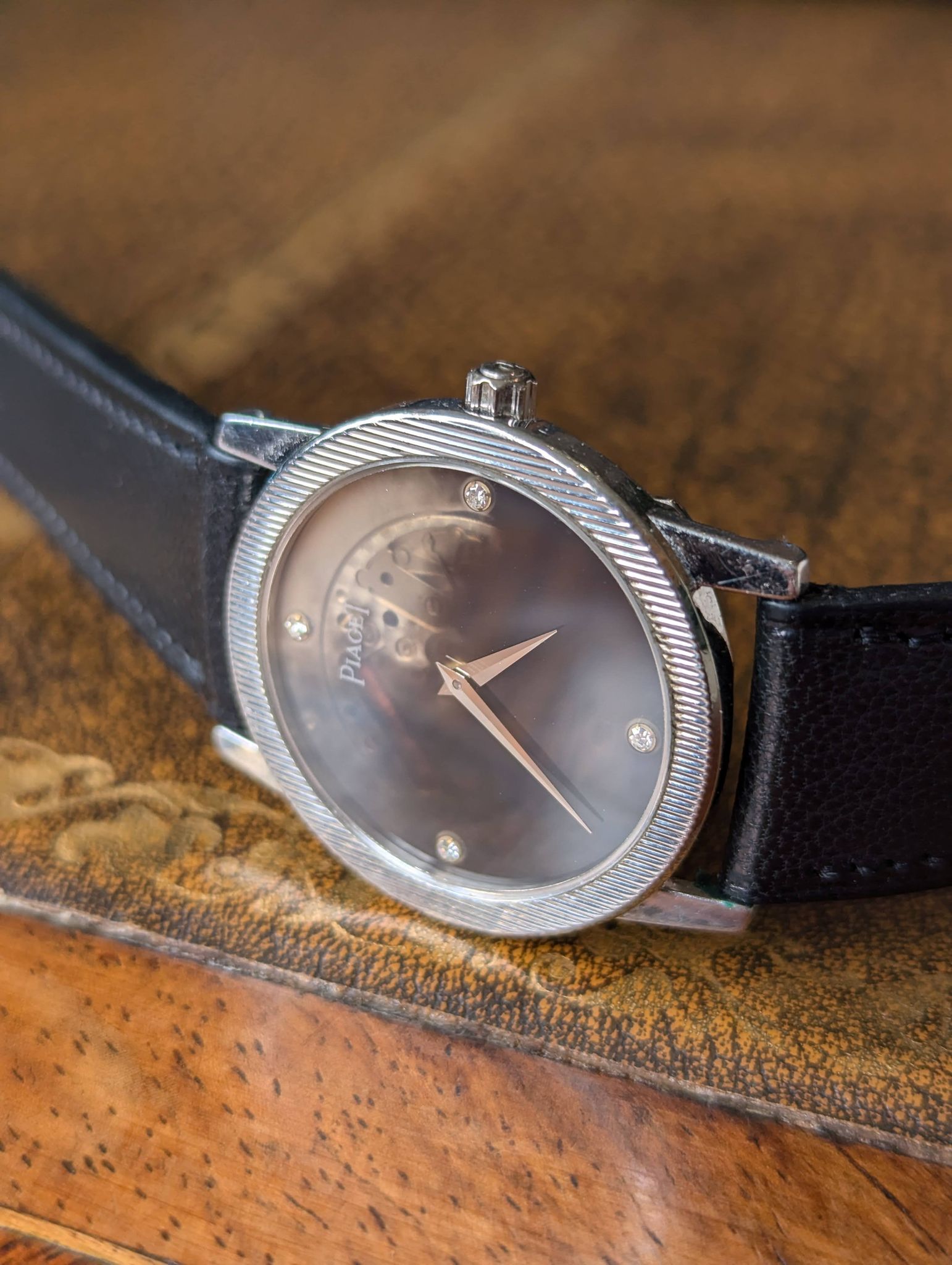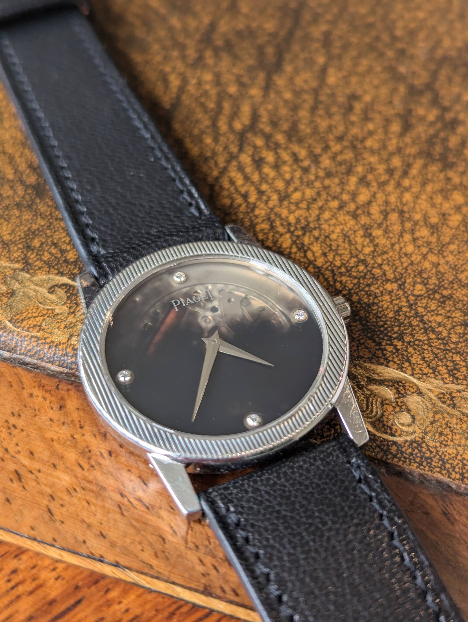 The good thing with black dials is the infinity of patterns and aging. In this case, the dial turned translucent and unveils a part of the movement.