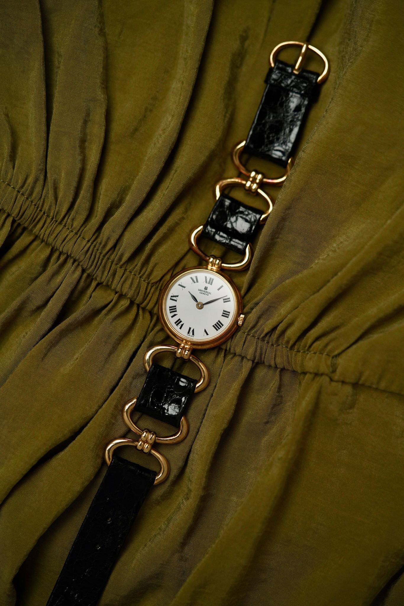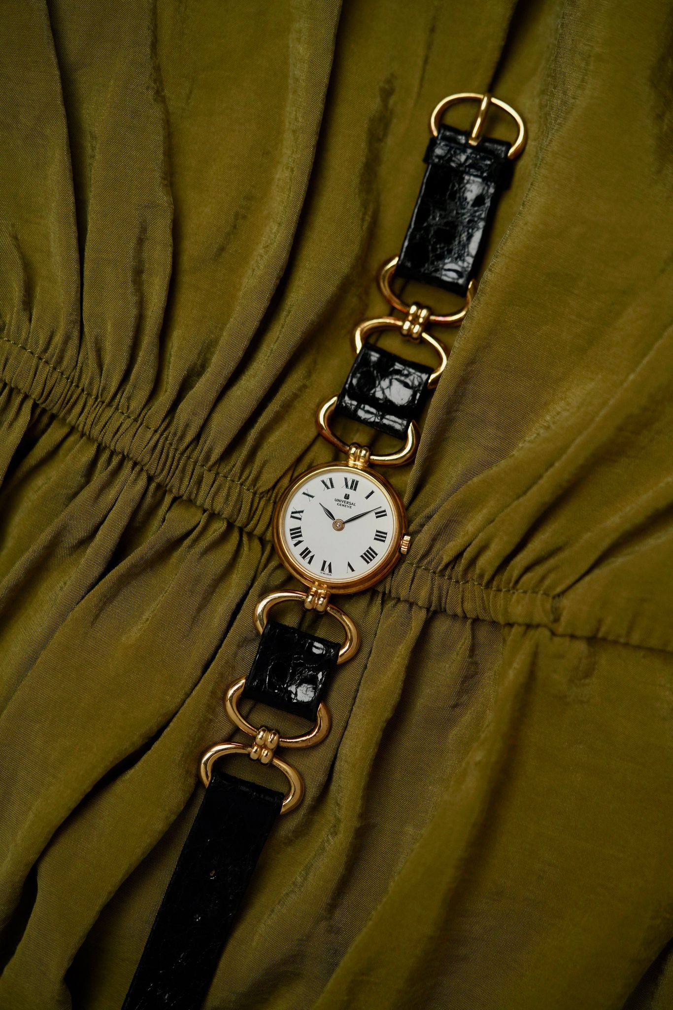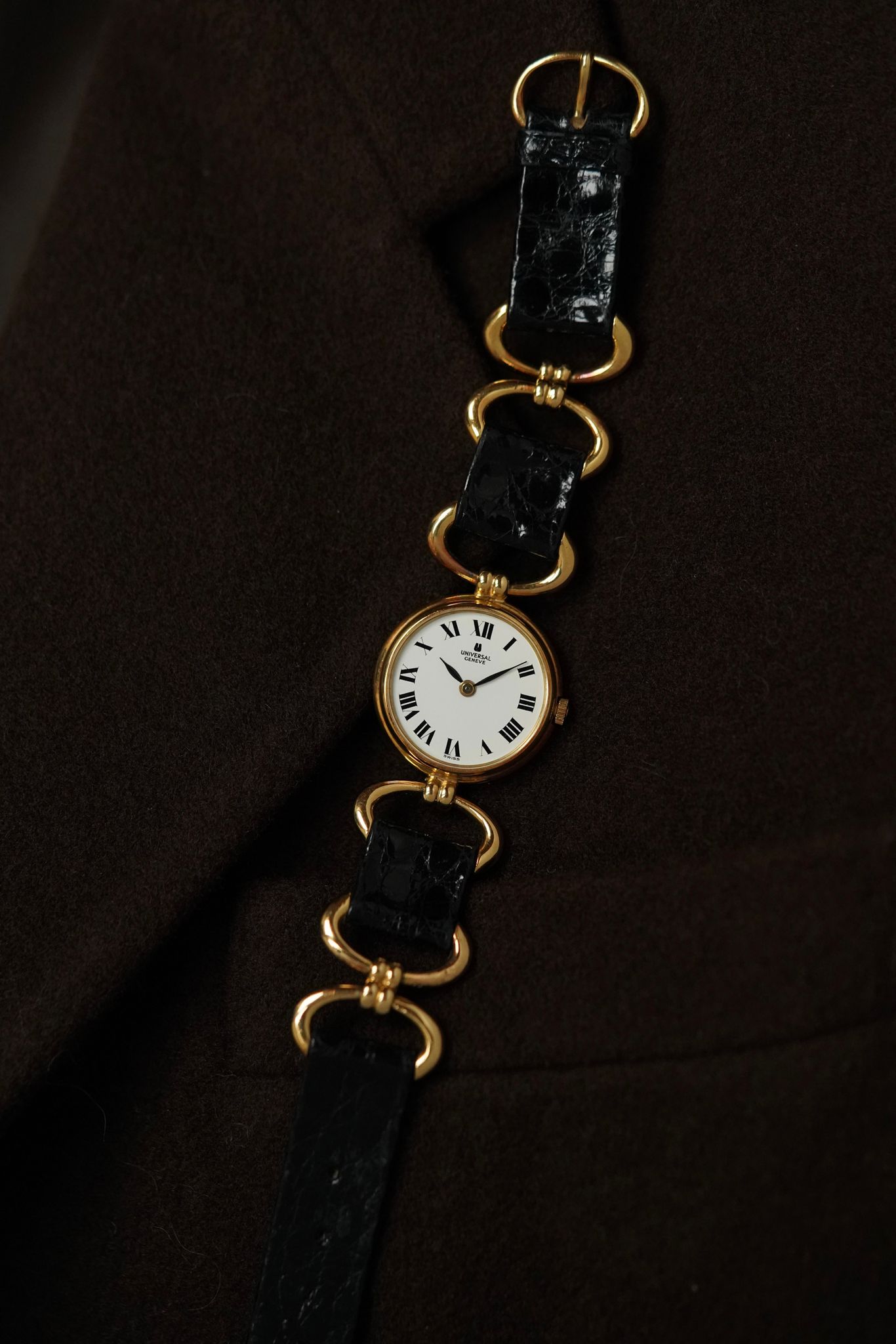 An incredible mechanical wound 18k yellow gold ladder watch with white roman numeral porcelain dial.