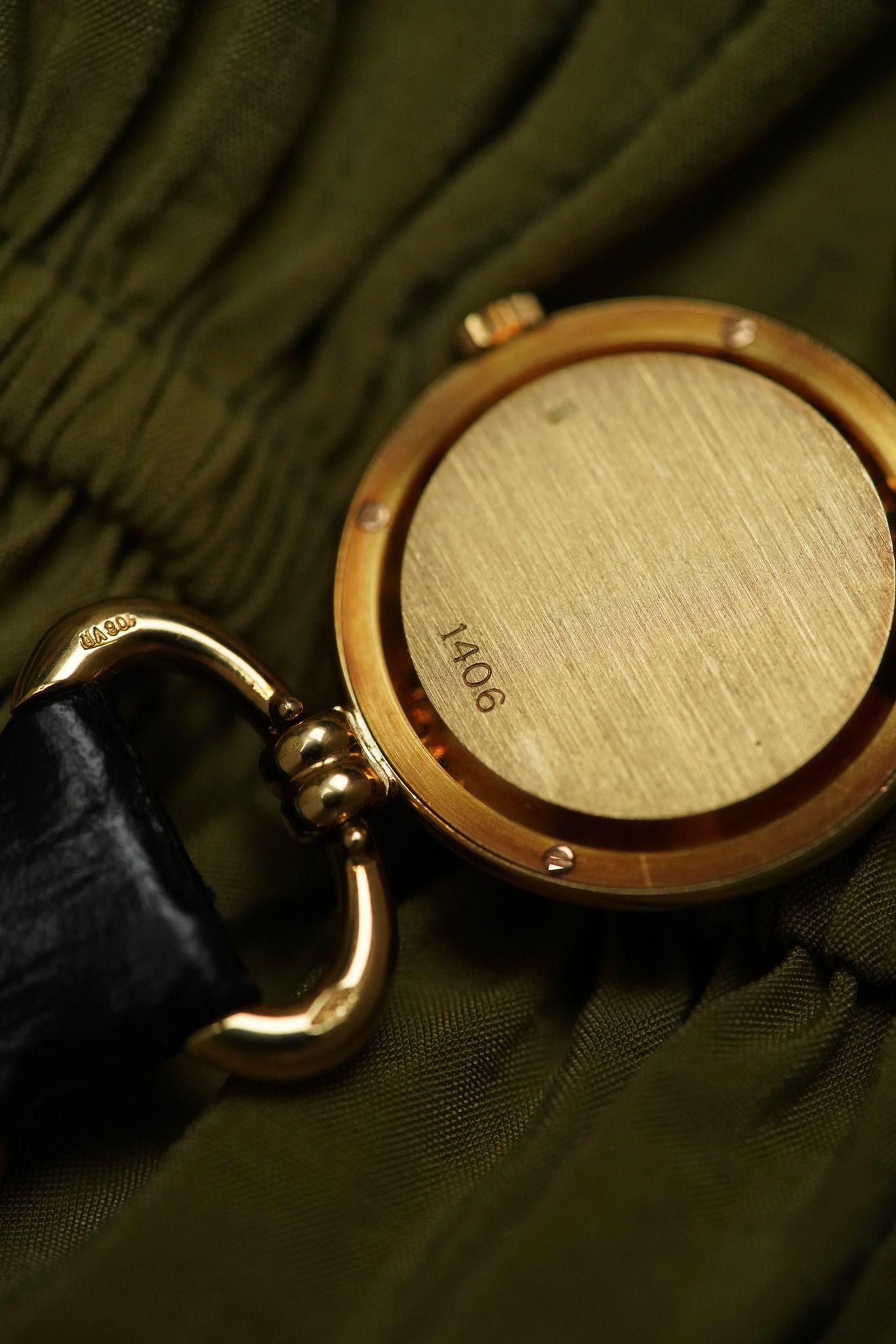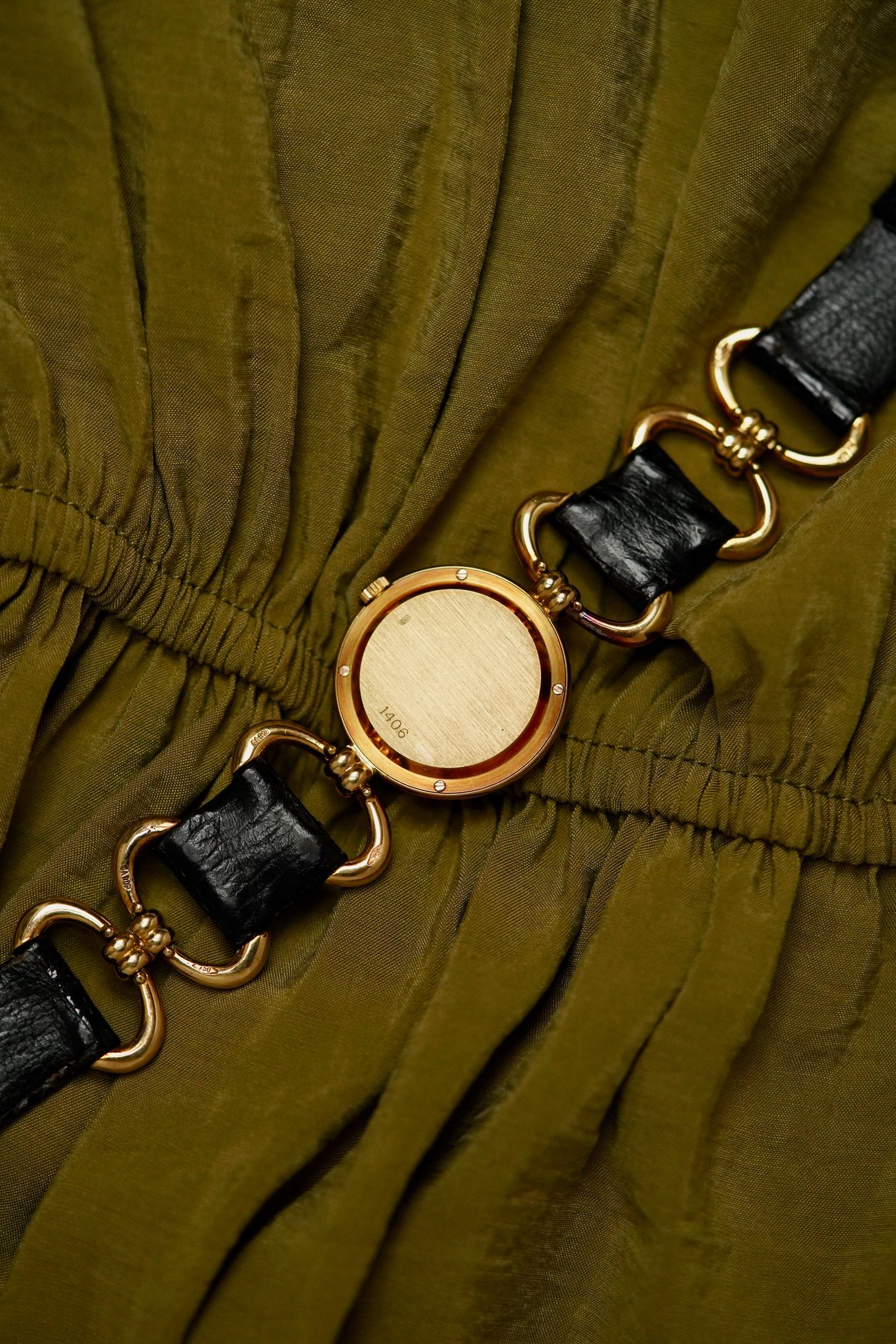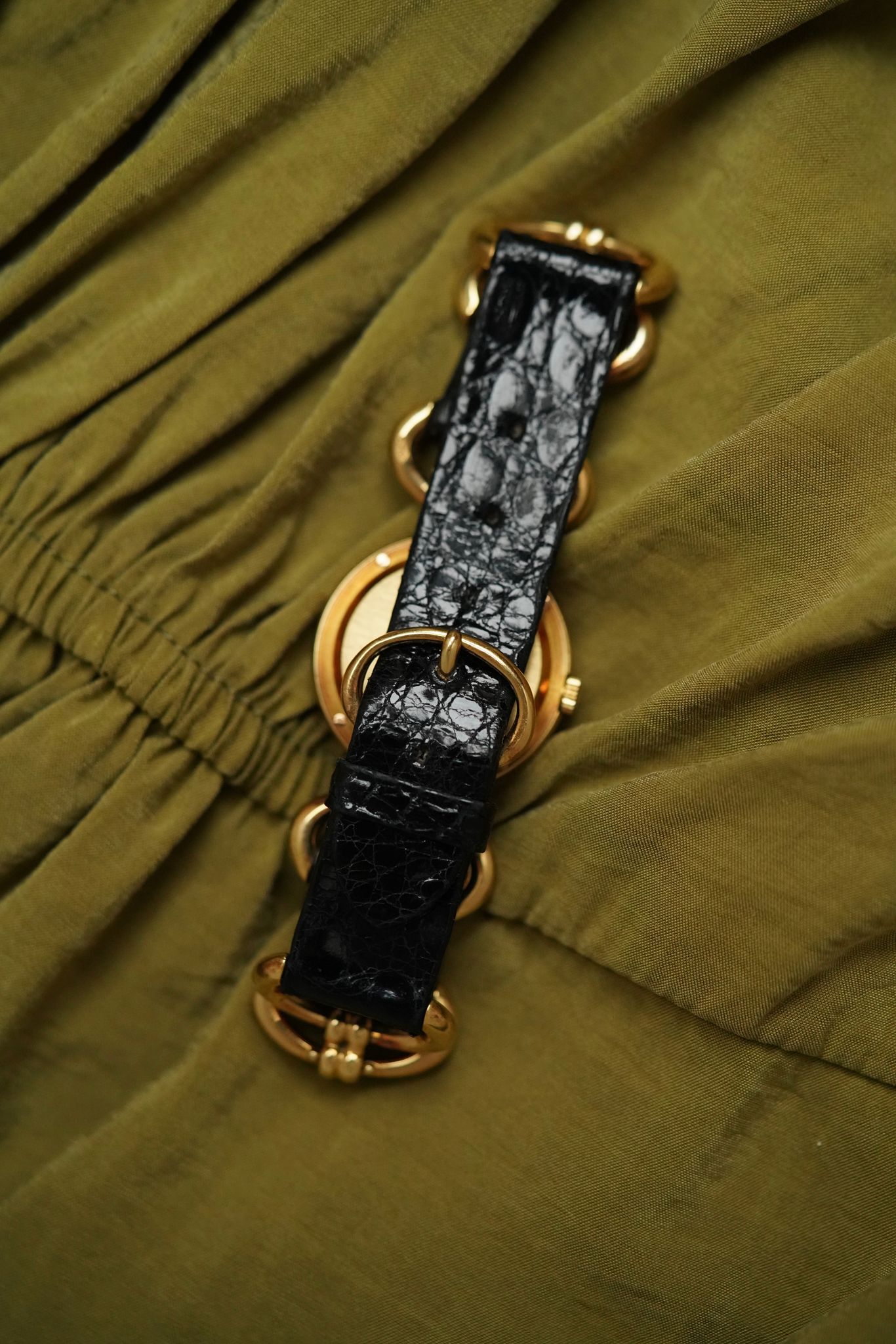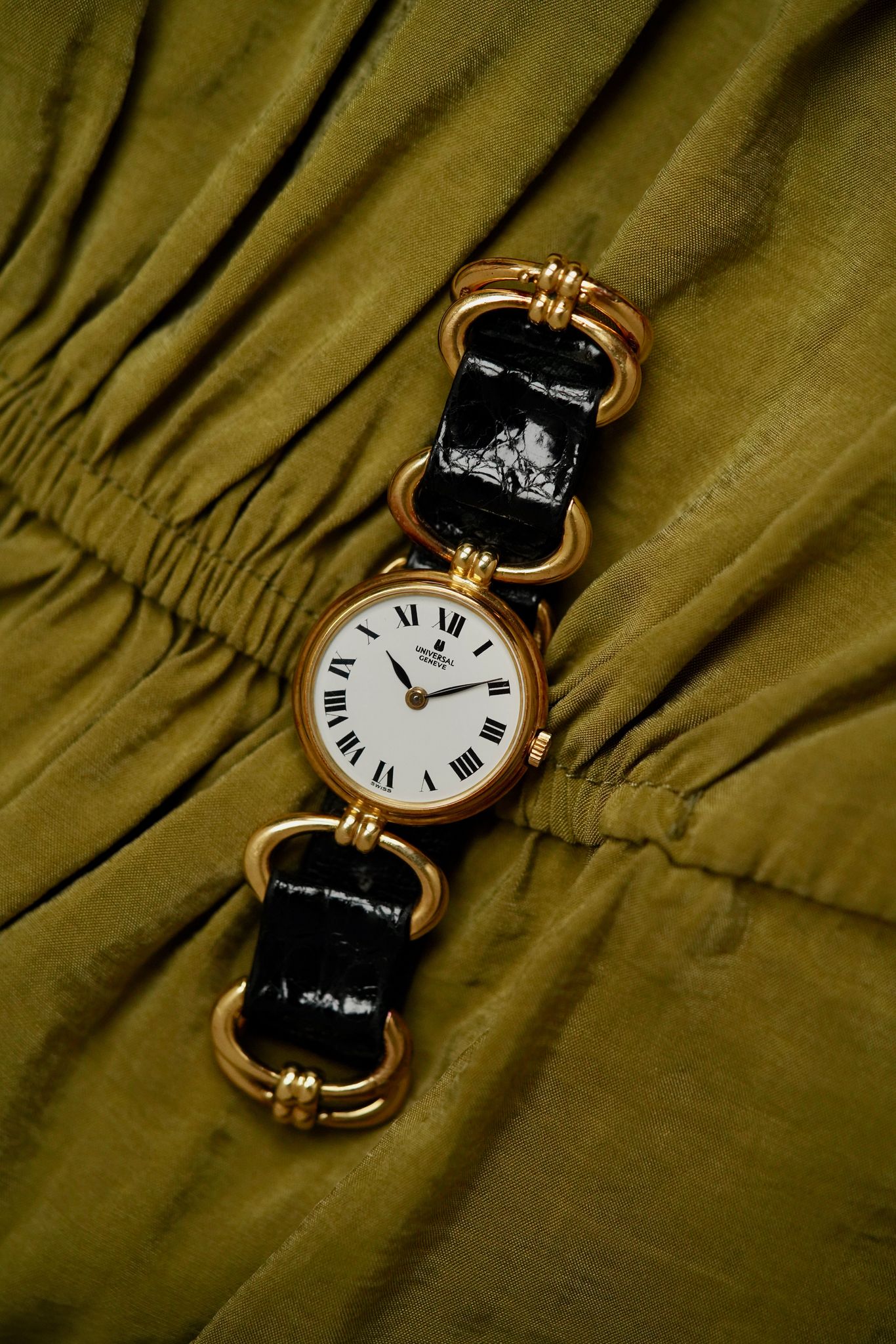 An incredible mechanical wound 18k yellow gold ladder watch with white roman numeral porcelain dial.
