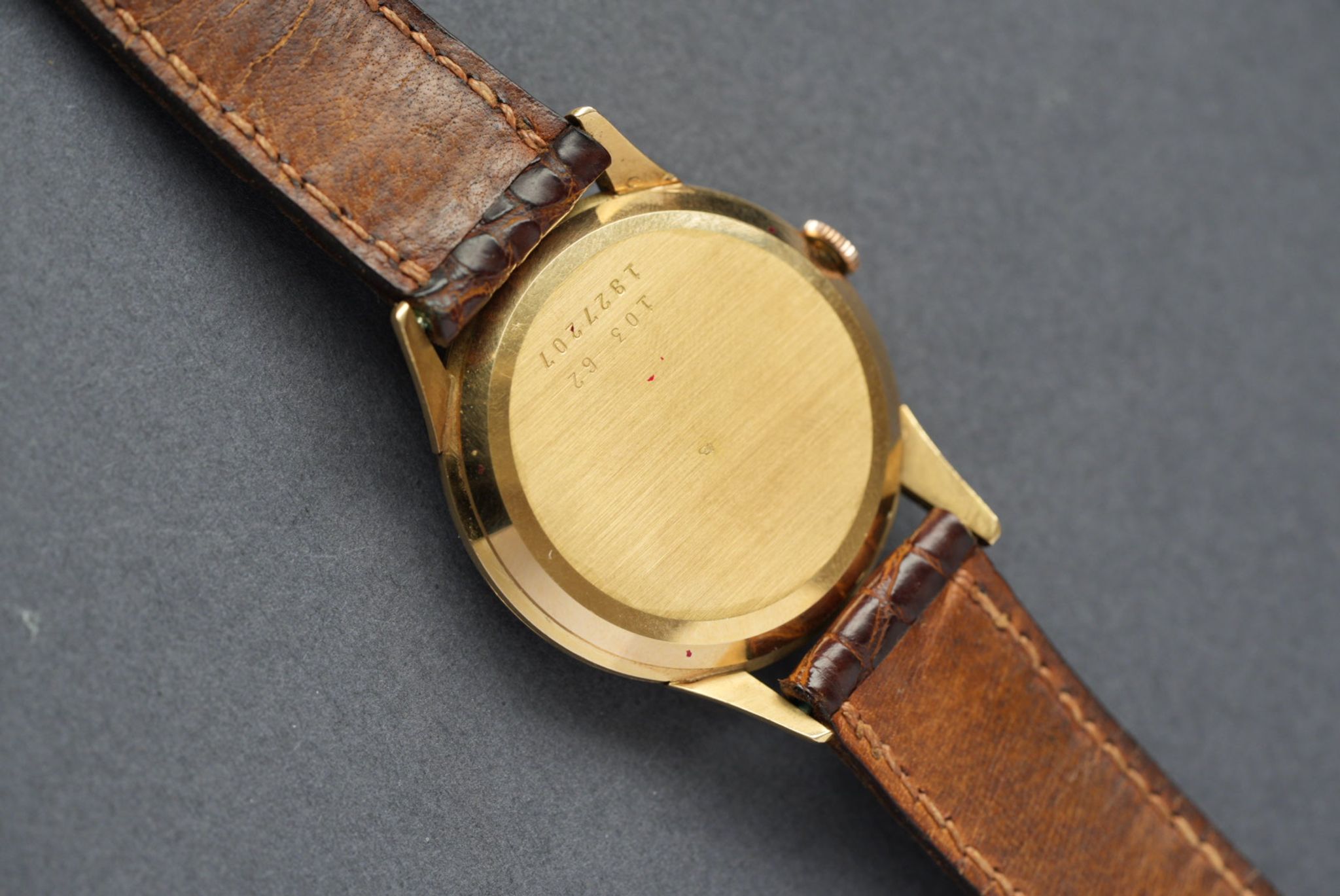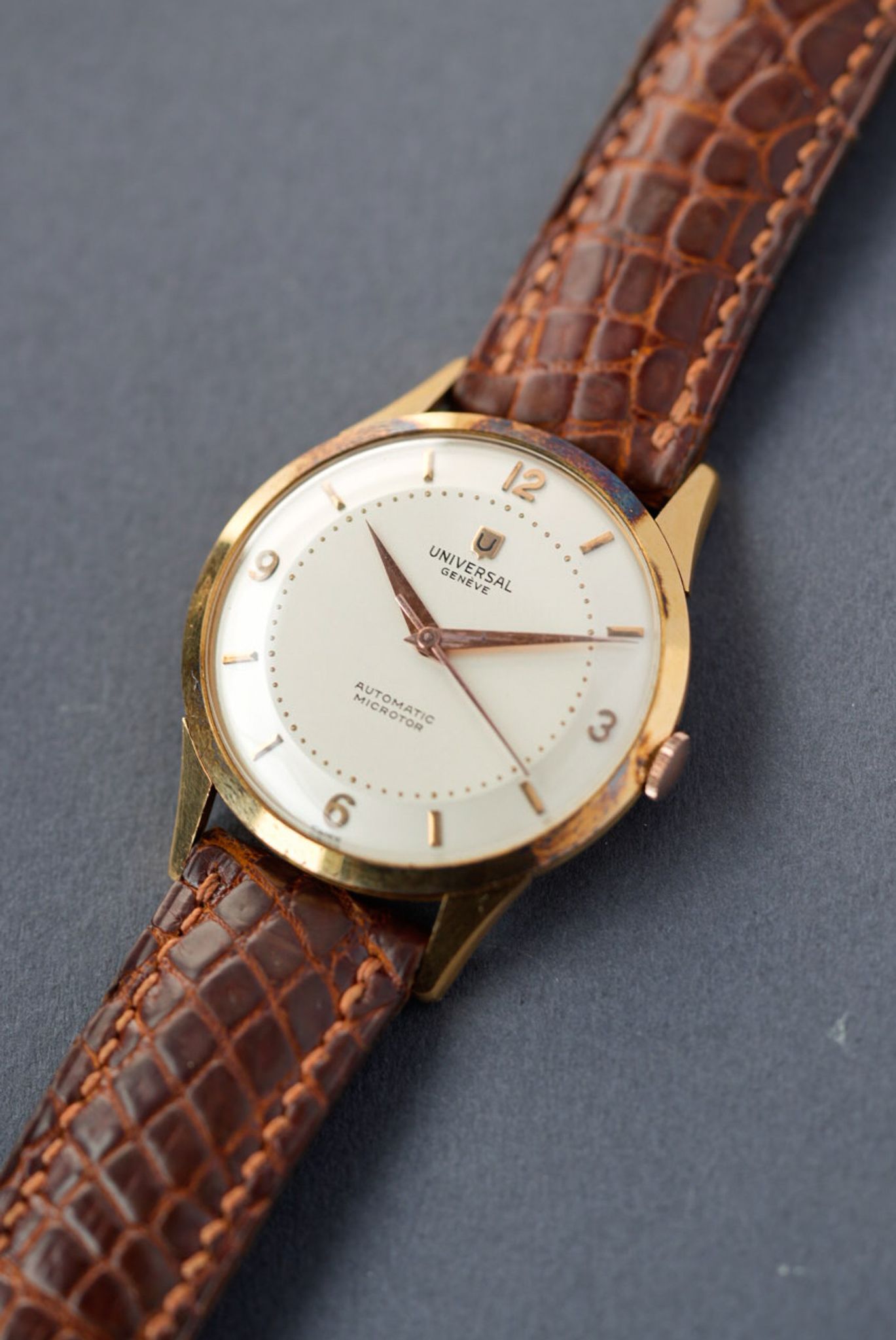 Mint Universal Geneve, ref. 103.62, circa 1957, crafted in 18k yellow gold, featuring an oxidized round case measuring 34 mm in diameter, with a fluted crown and a numbered snap-on back. The cream “pie-pan” dial presents applied indexes, a pearl minute track, dauphine hands, central seconds, and an applied logo. It houses the automatic micro-rotor movement Universal Genève Caliber 215 and is fitted with a leather strap and an 18k yellow gold pin buckle signed “MU.”