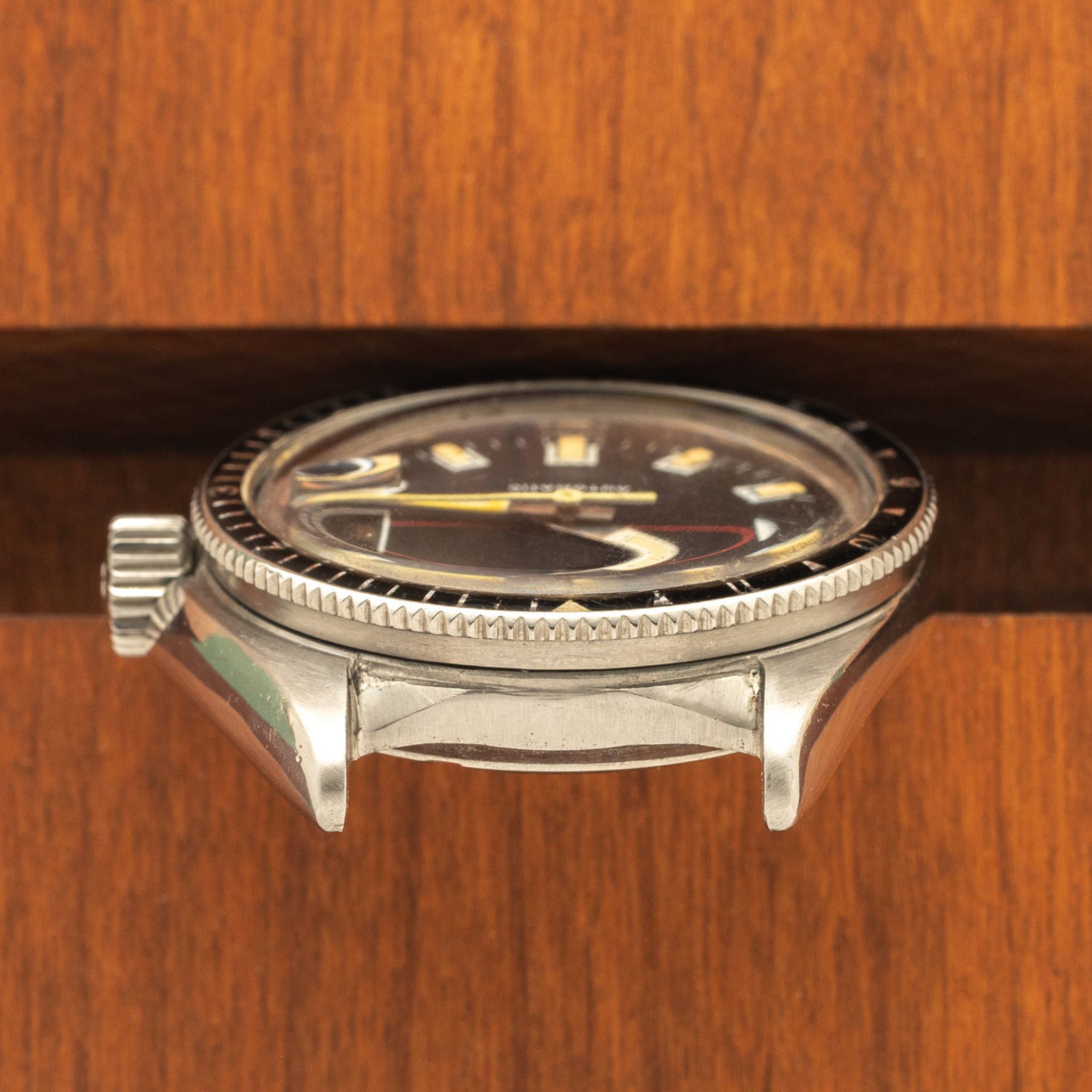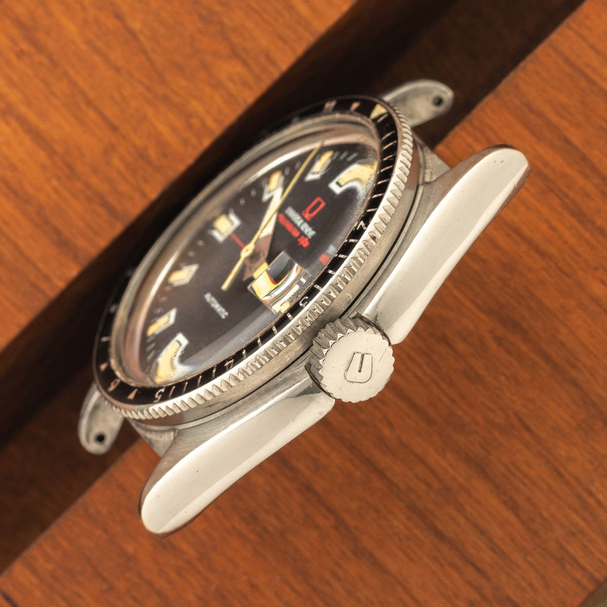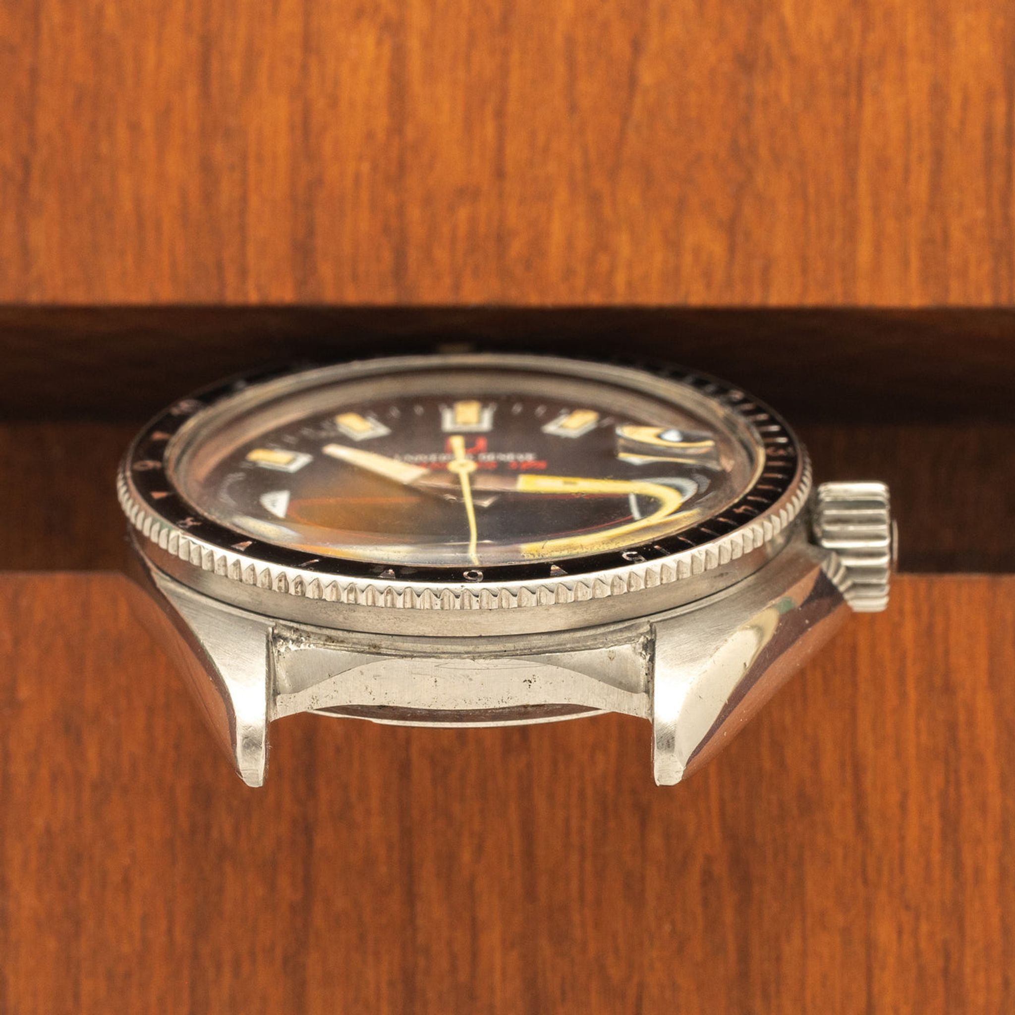 This particular Polerouter Sub, circa '69 is a rare mk2 variant which are known for their asymmetrical cases and unique design language. Between the funky layout, dial text and trapezoidal date magnifier, this piece really represents what UG collectors appreciate about the brand so much today. The dial and bezel insert are both clean and the case is strong with thick and even lugs. It even displays the serial and reference number clearly, of which most were polished off over the past 60 years. This really is a beautiful and charming UG that we're thrilled to offer to its next custodian.
