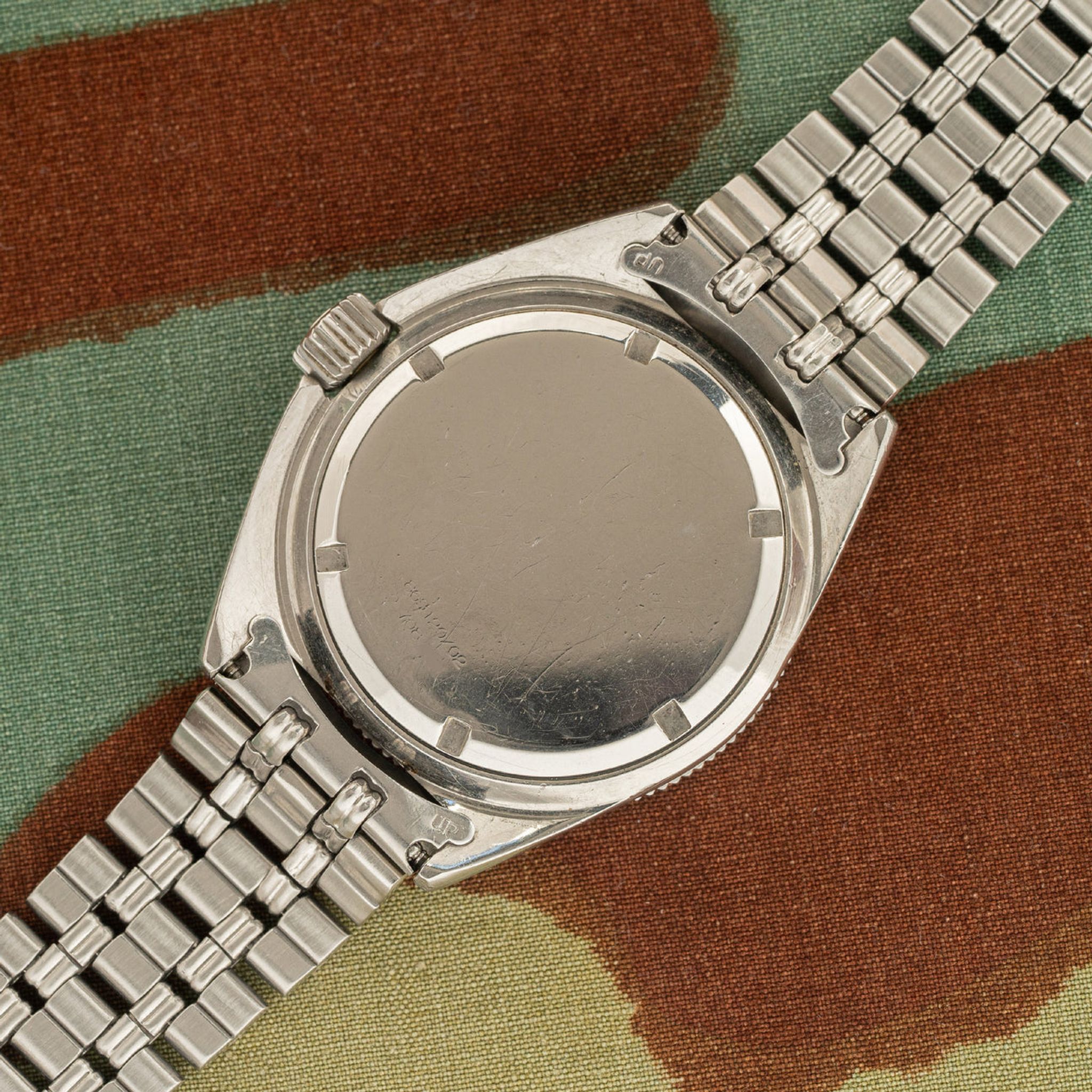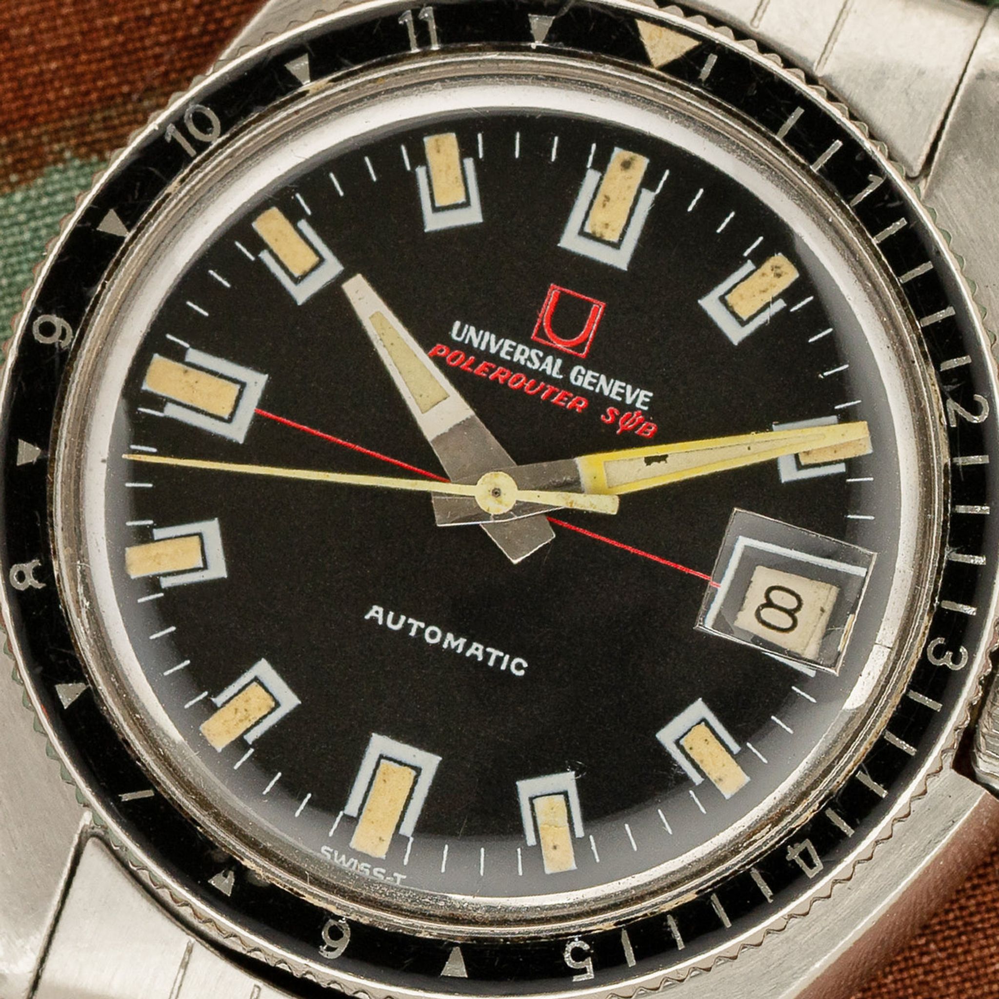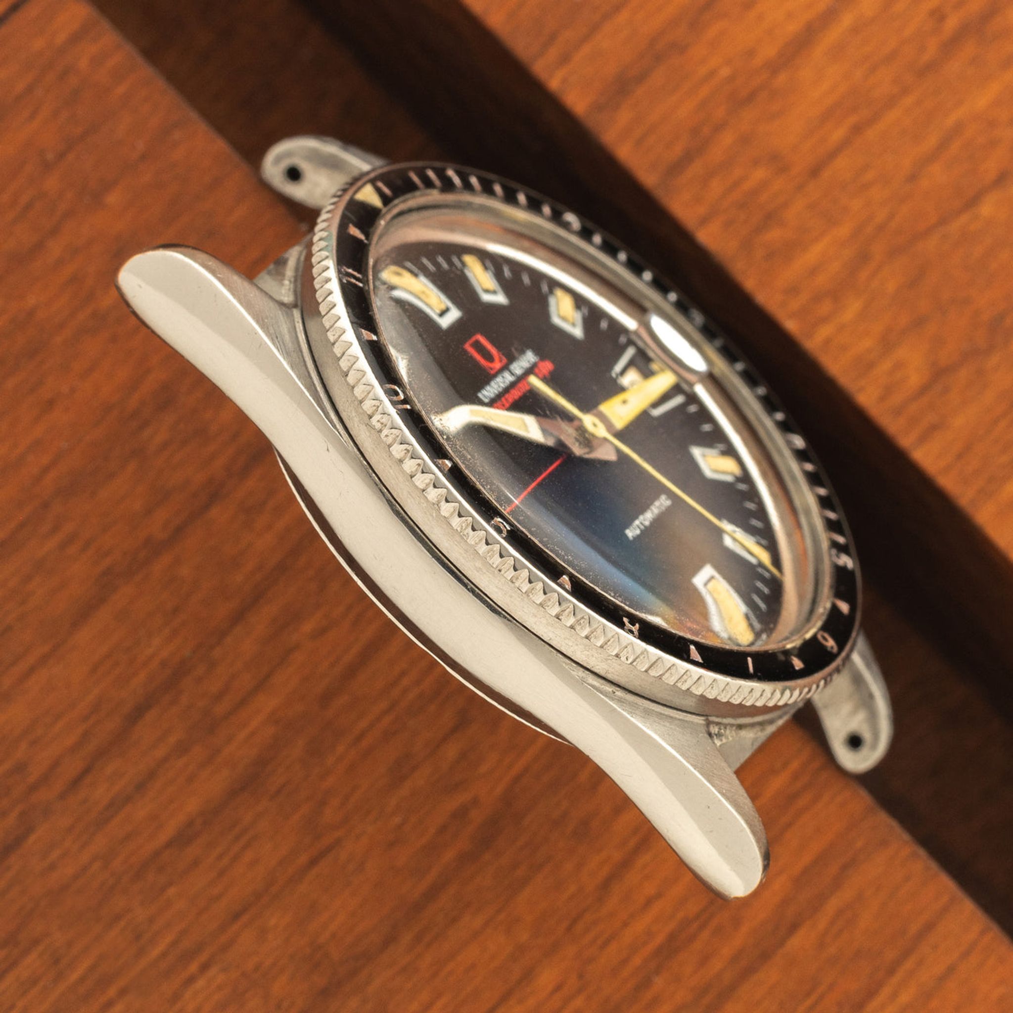 This particular Polerouter Sub, circa '69 is a rare mk2 variant which are known for their asymmetrical cases and unique design language. Between the funky layout, dial text and trapezoidal date magnifier, this piece really represents what UG collectors appreciate about the brand so much today. The dial and bezel insert are both clean and the case is strong with thick and even lugs. It even displays the serial and reference number clearly, of which most were polished off over the past 60 years. This really is a beautiful and charming UG that we're thrilled to offer to its next custodian.