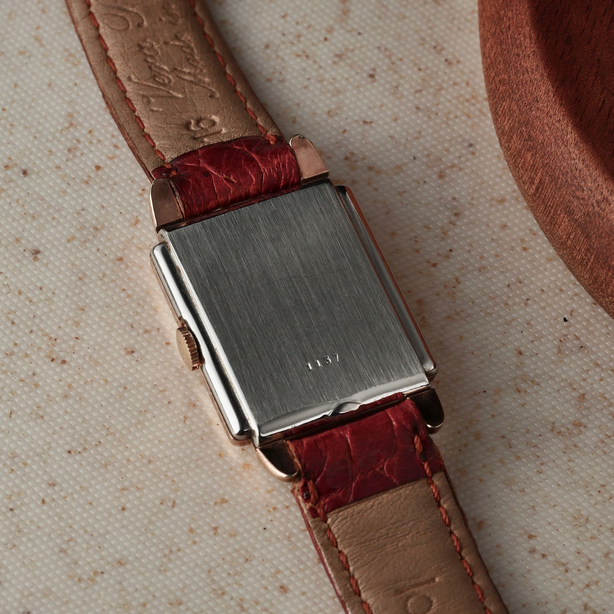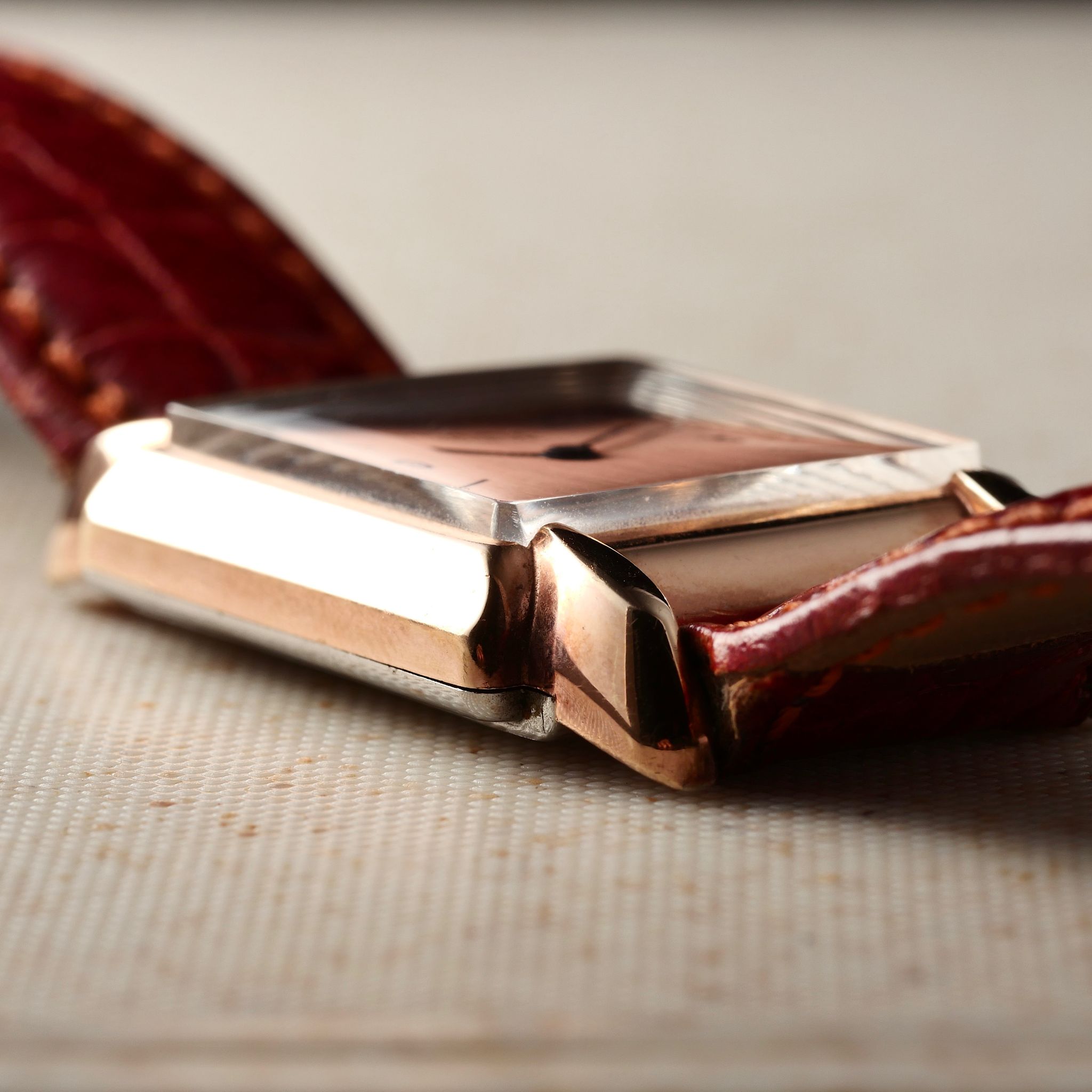 SPECIFICATIONS: Rose Gold capped Steel, Hand finished Mellerio Style French case with Cornes de Vache Lugs, Original Rose Gold Spun Dial, Leather Strap, non OEM buckle, Limited Production