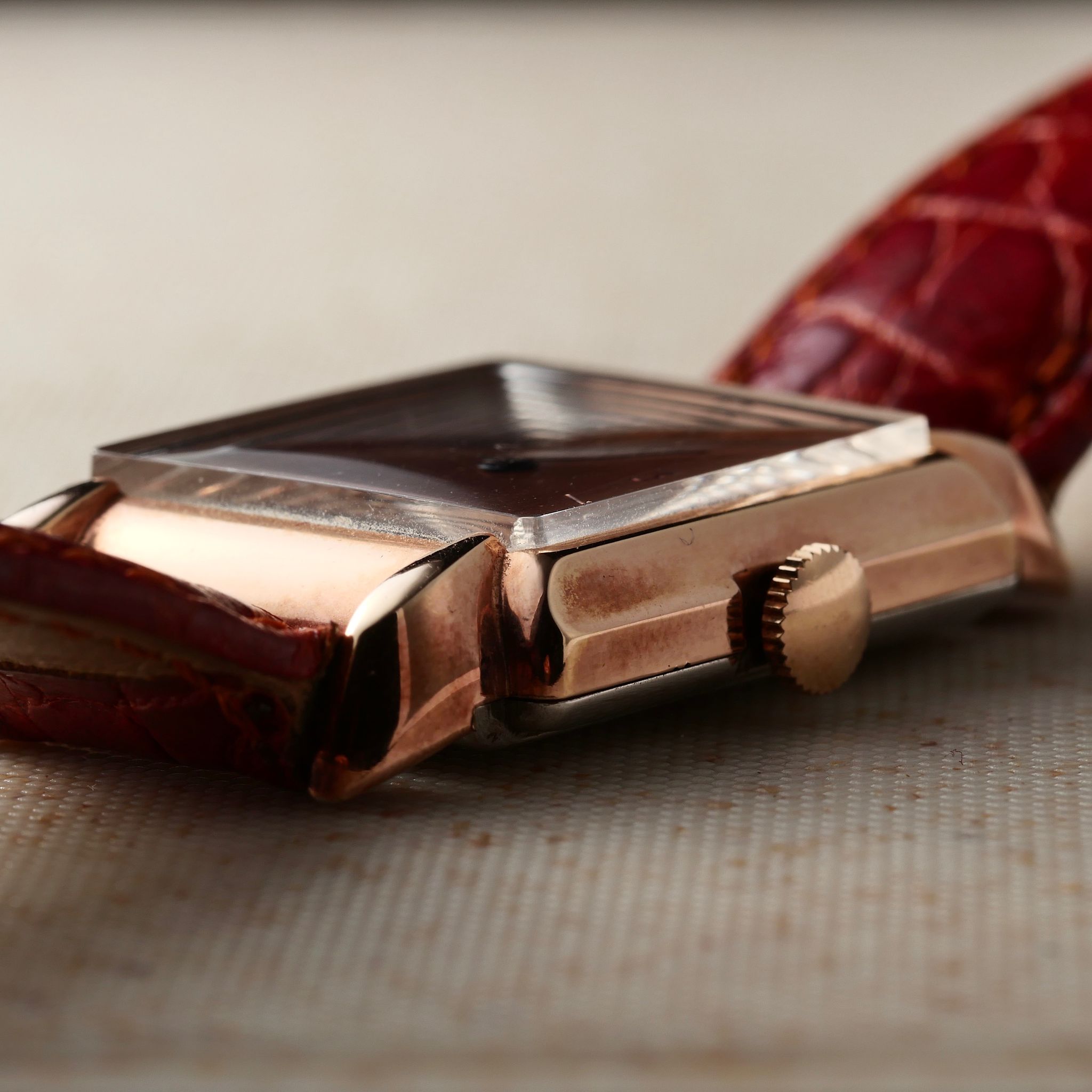 The horned lugs are sharp and sculptural, transforming the rectangular tank silhouette into something almost celestial. Showcased in excellent condition with the rare rose gold spun dial this capped Mellerio-style cased icon is super rare and very investable given UG’s resurgence.