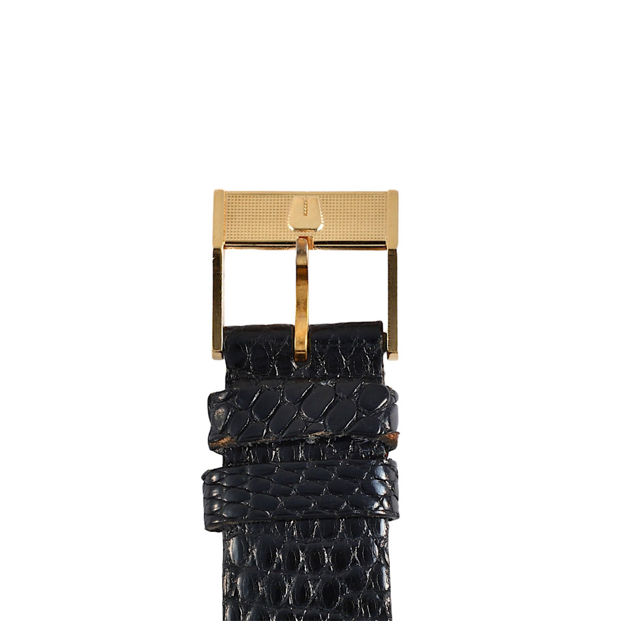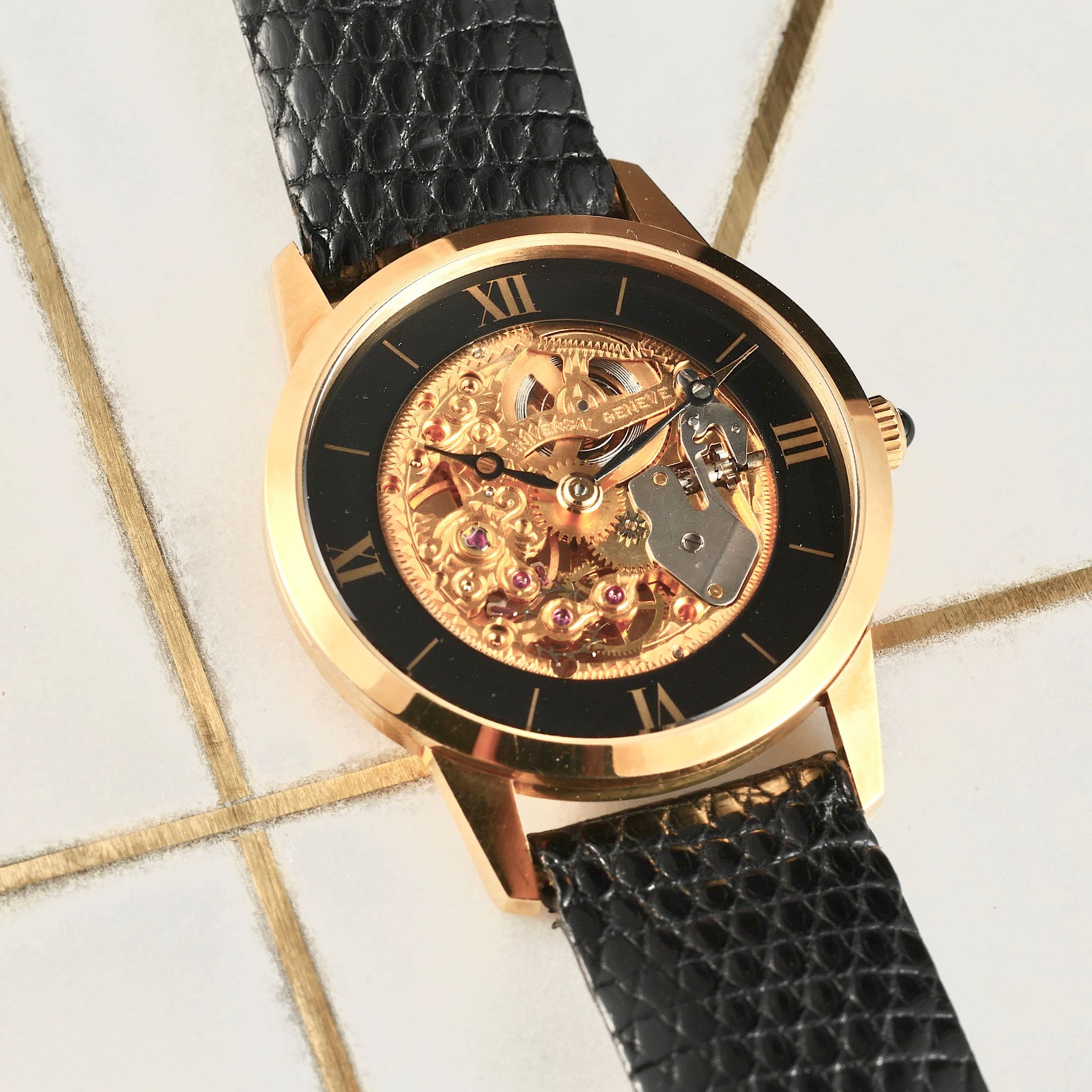 FEATURES: 18k gold, black leather strap, original 18k tang buckle, mineral crystal, openwork movement