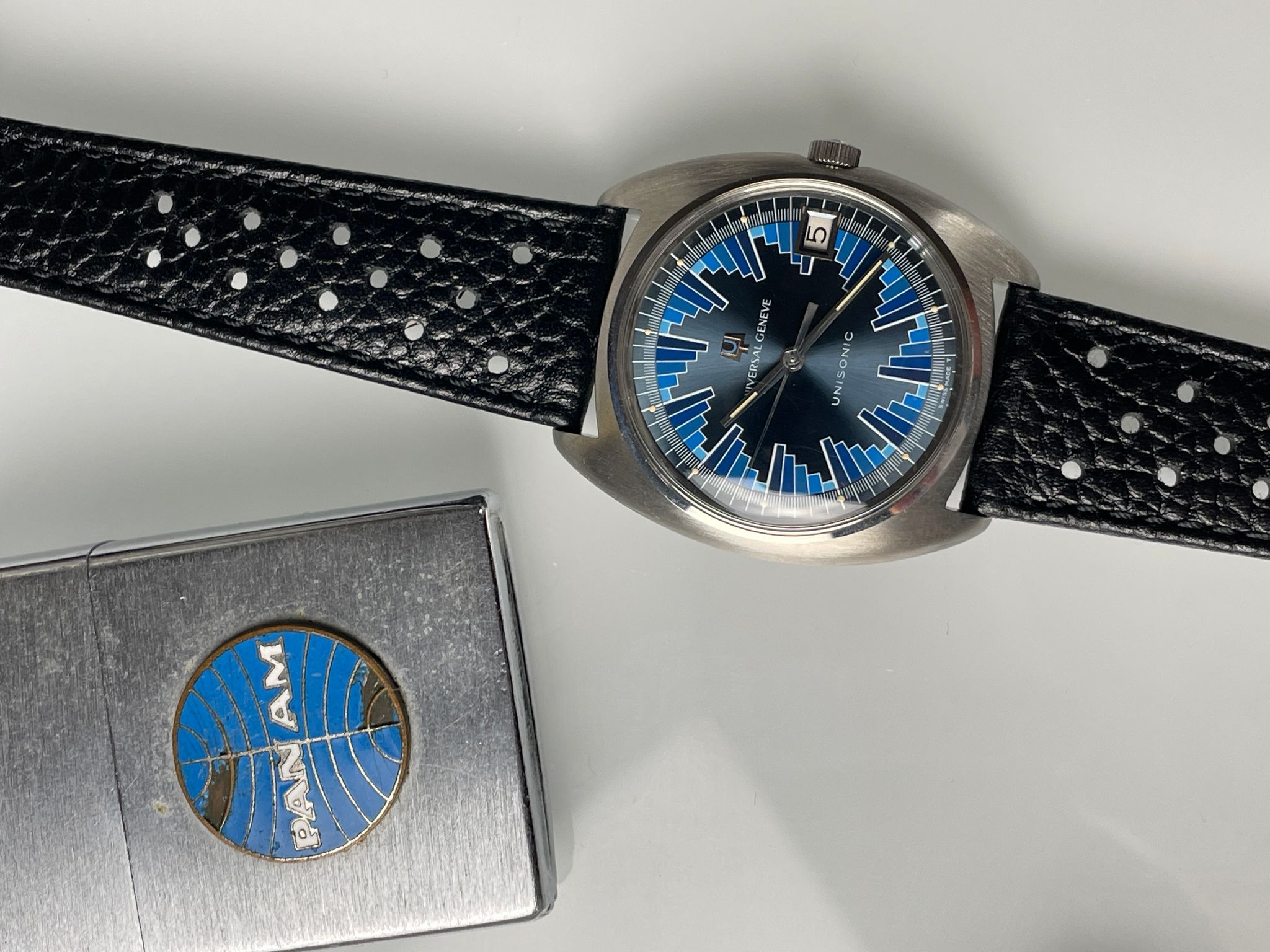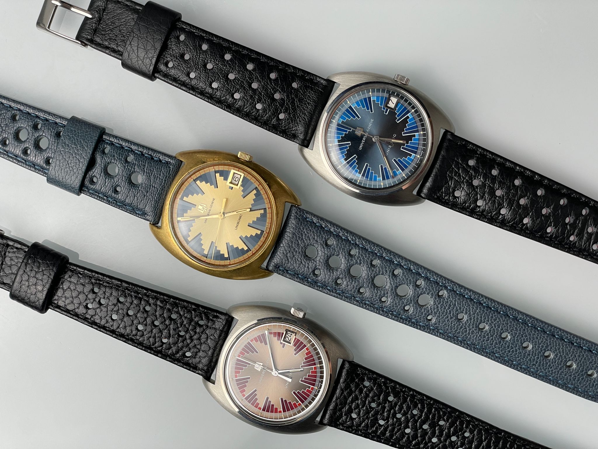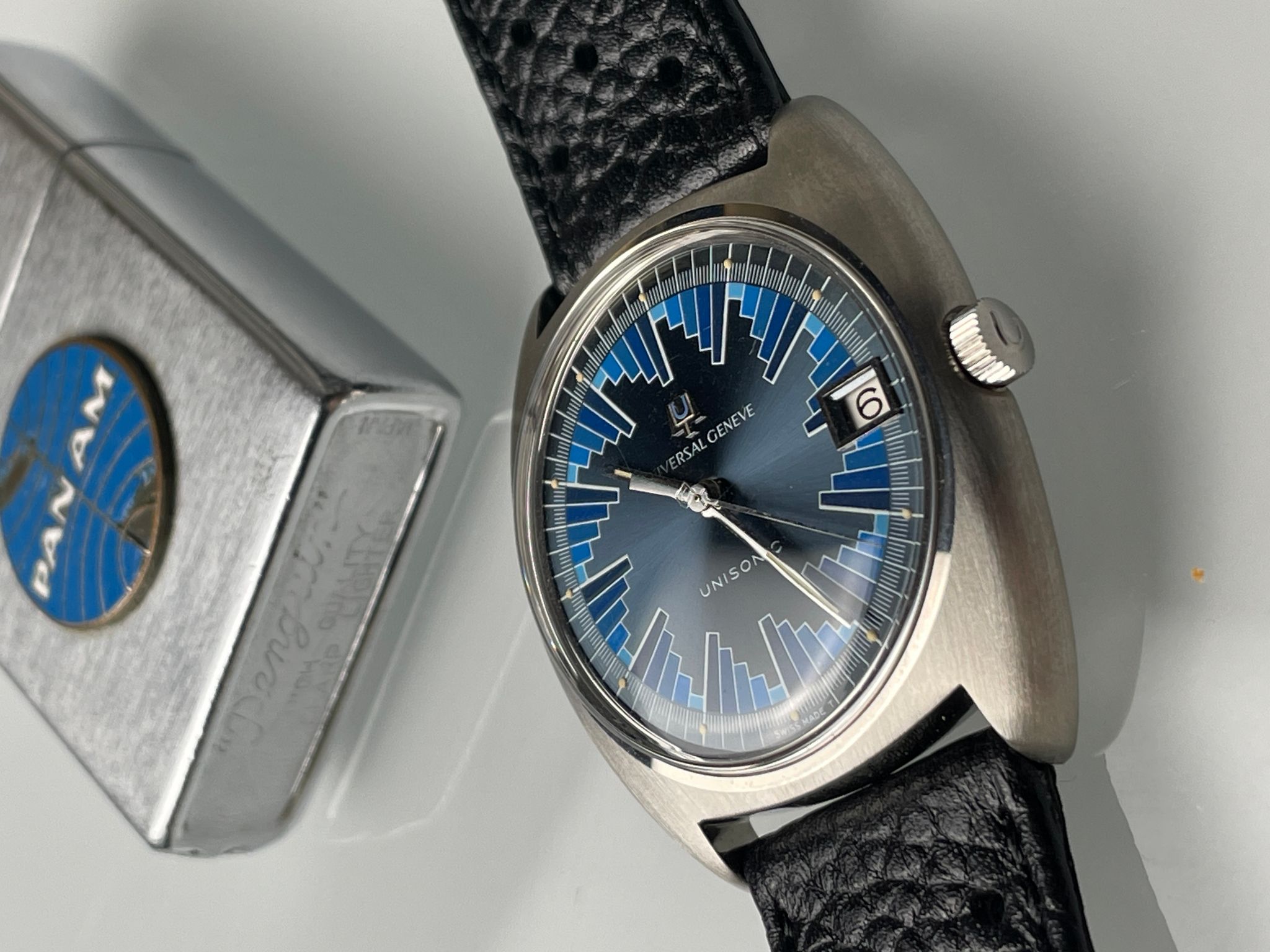 In the early 70s, UG launched the Unisonic range using the Bulova’s revolutionary tuning forks technology. Among them, a small series were doted with a funky dial reminiscent of Vasarely’s kinetic art. A Unisonic with a Kinetic dial. The legend of the « Buzzsaw » was born. Iterated into several variations, this slate colored dial with blue pattern is one of them. Probably the most iconic with the brown sun dial with red pattern, they are as rare as they are coveted by collectors, and not only of electric watches.
