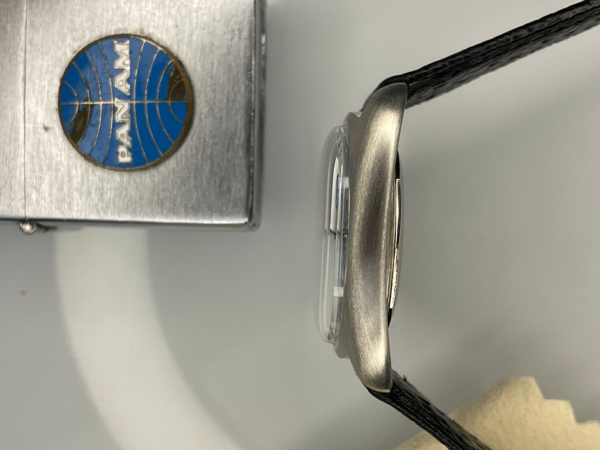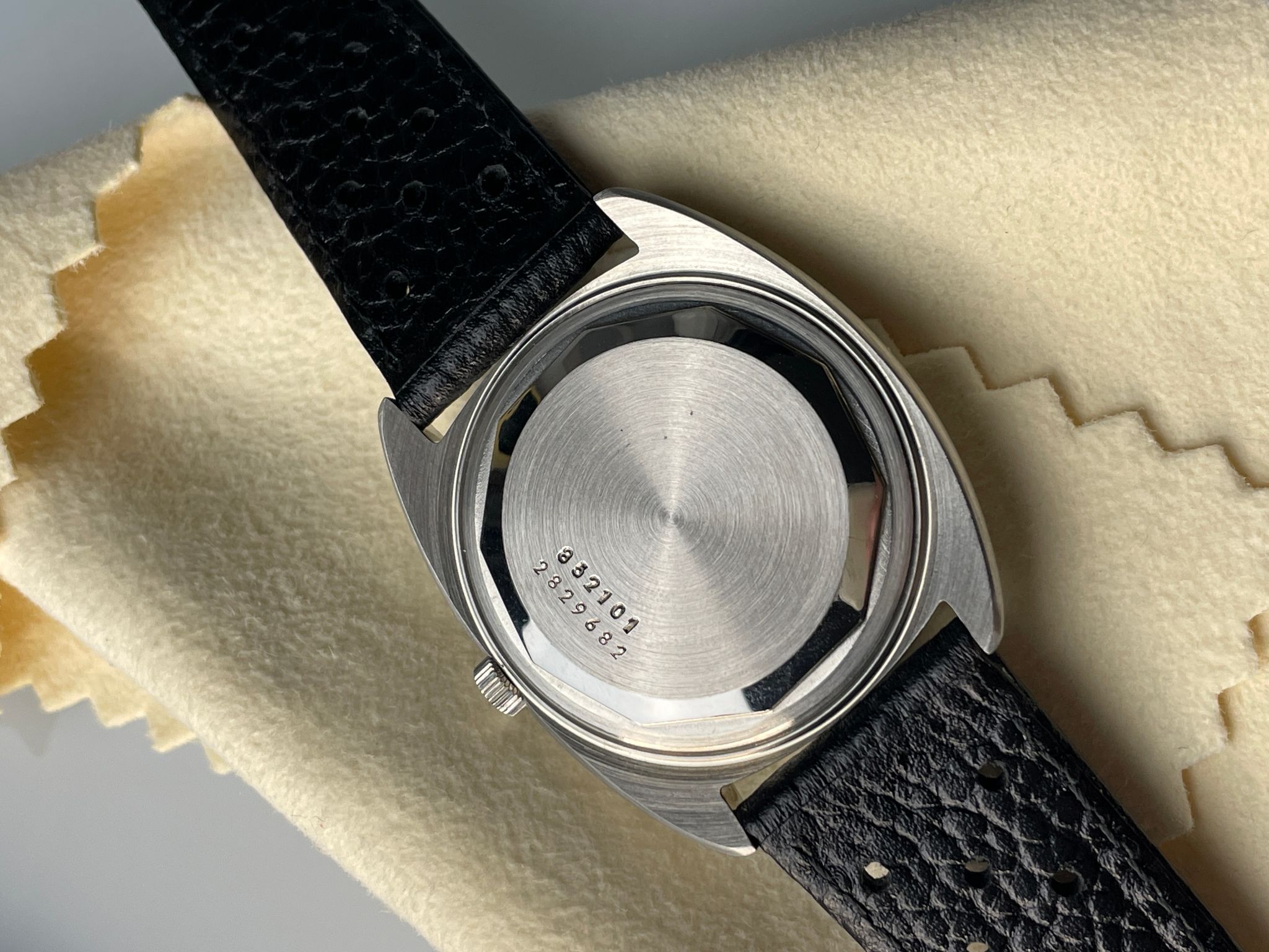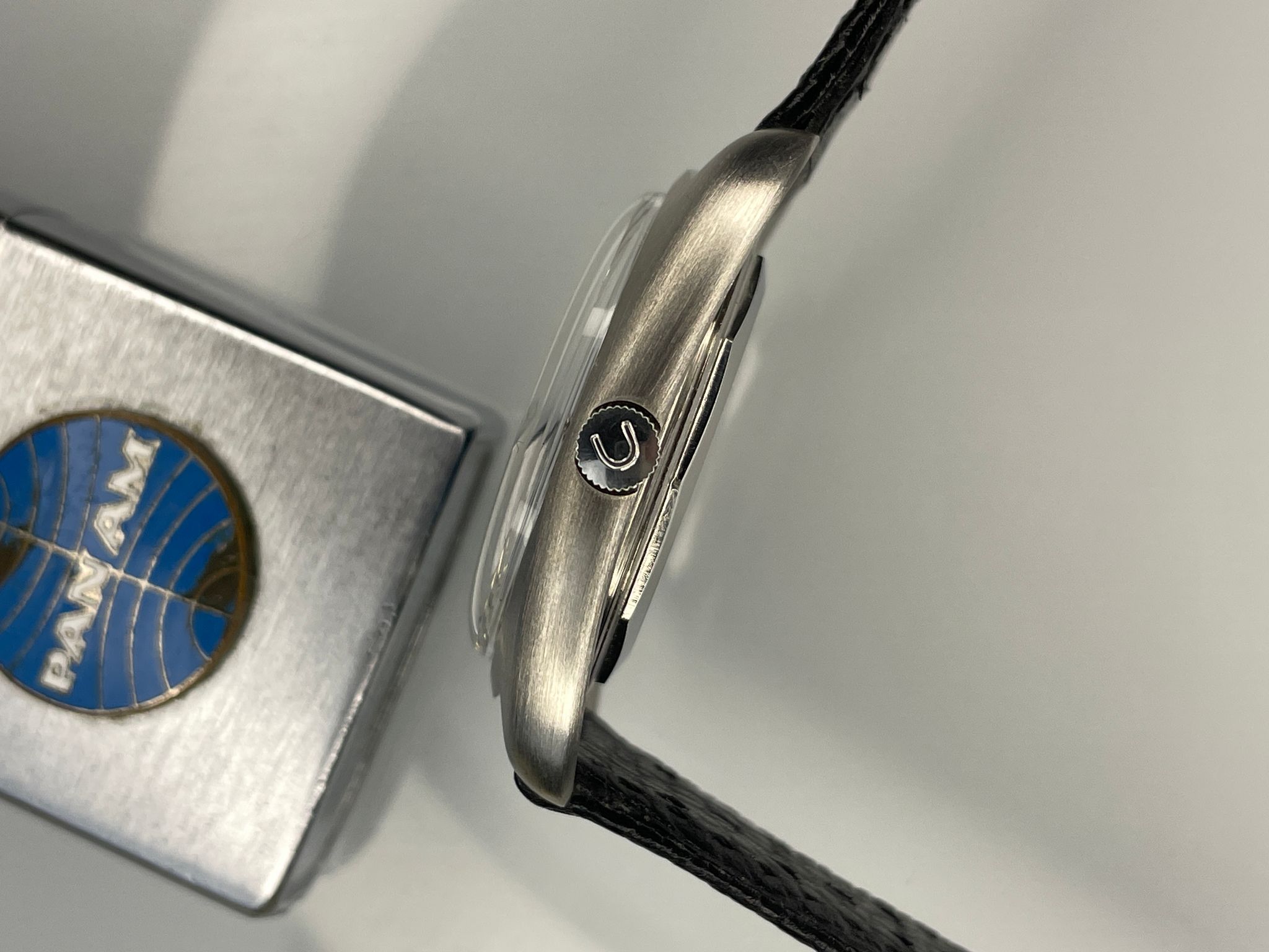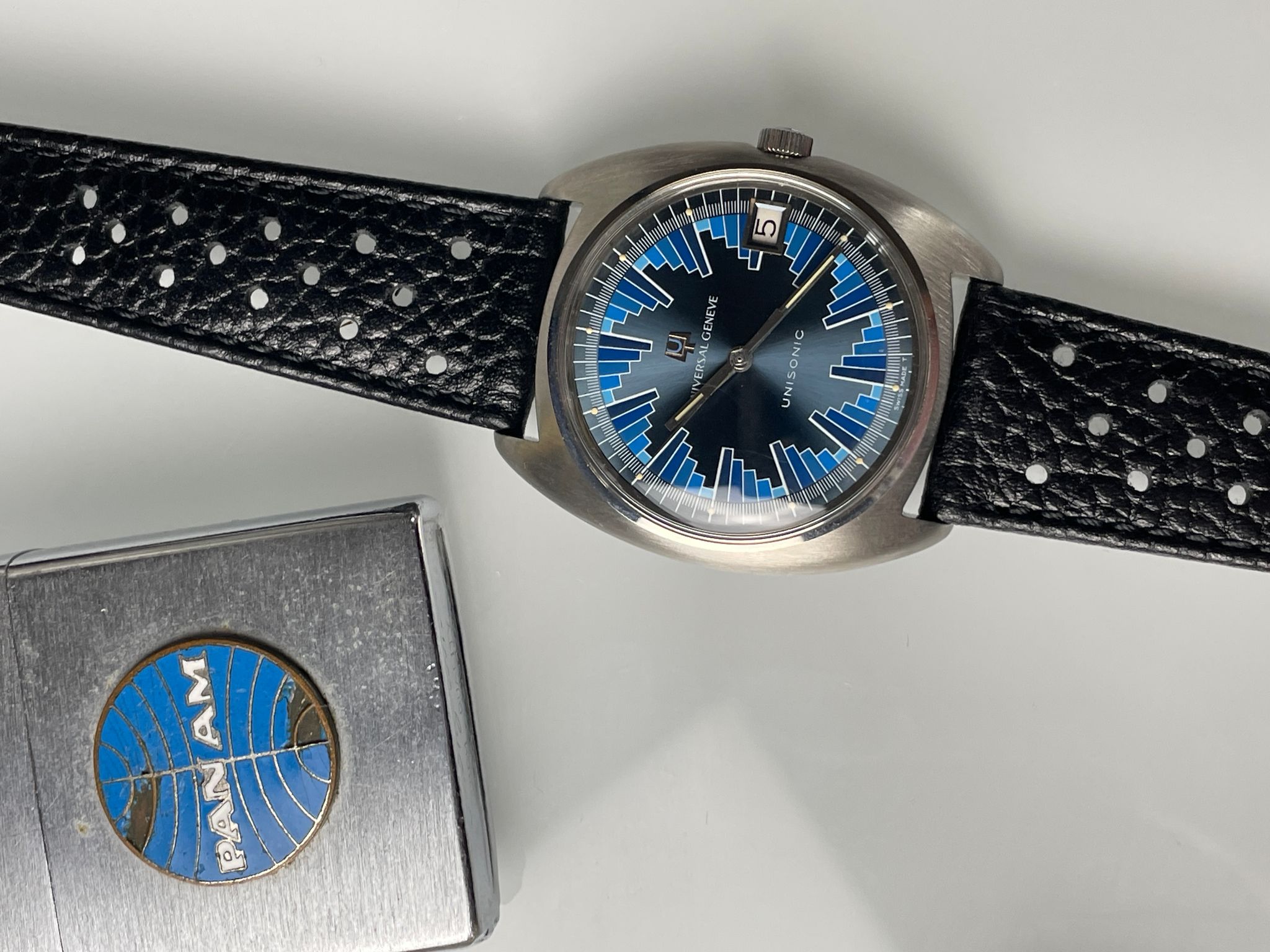 In the early 70s, UG launched the Unisonic range using the Bulova’s revolutionary tuning forks technology. Among them, a small series were doted with a funky dial reminiscent of Vasarely’s kinetic art. A Unisonic with a Kinetic dial. The legend of the « Buzzsaw » was born. Iterated into several variations, this slate colored dial with blue pattern is one of them. Probably the most iconic with the brown sun dial with red pattern, they are as rare as they are coveted by collectors, and not only of electric watches.