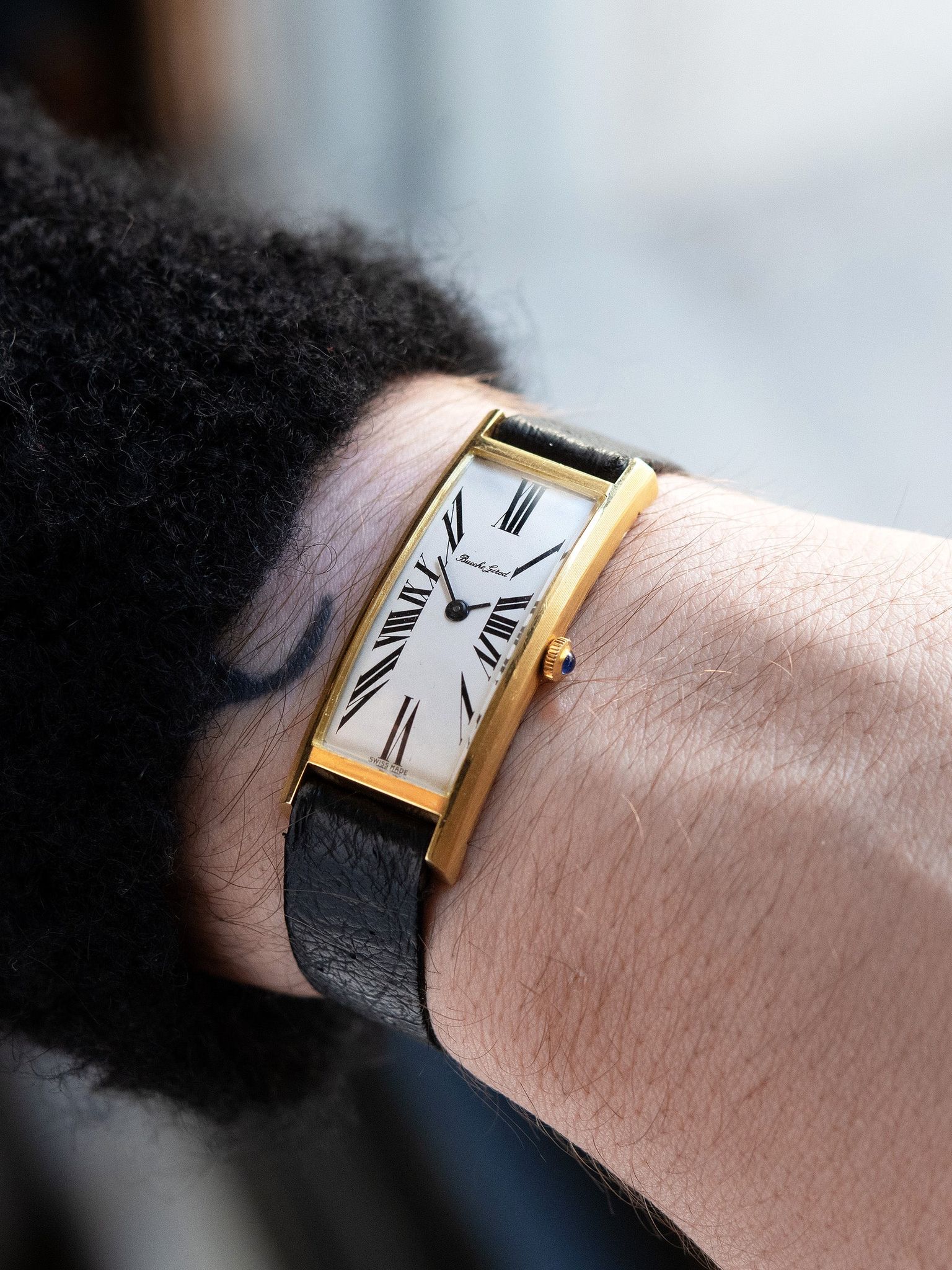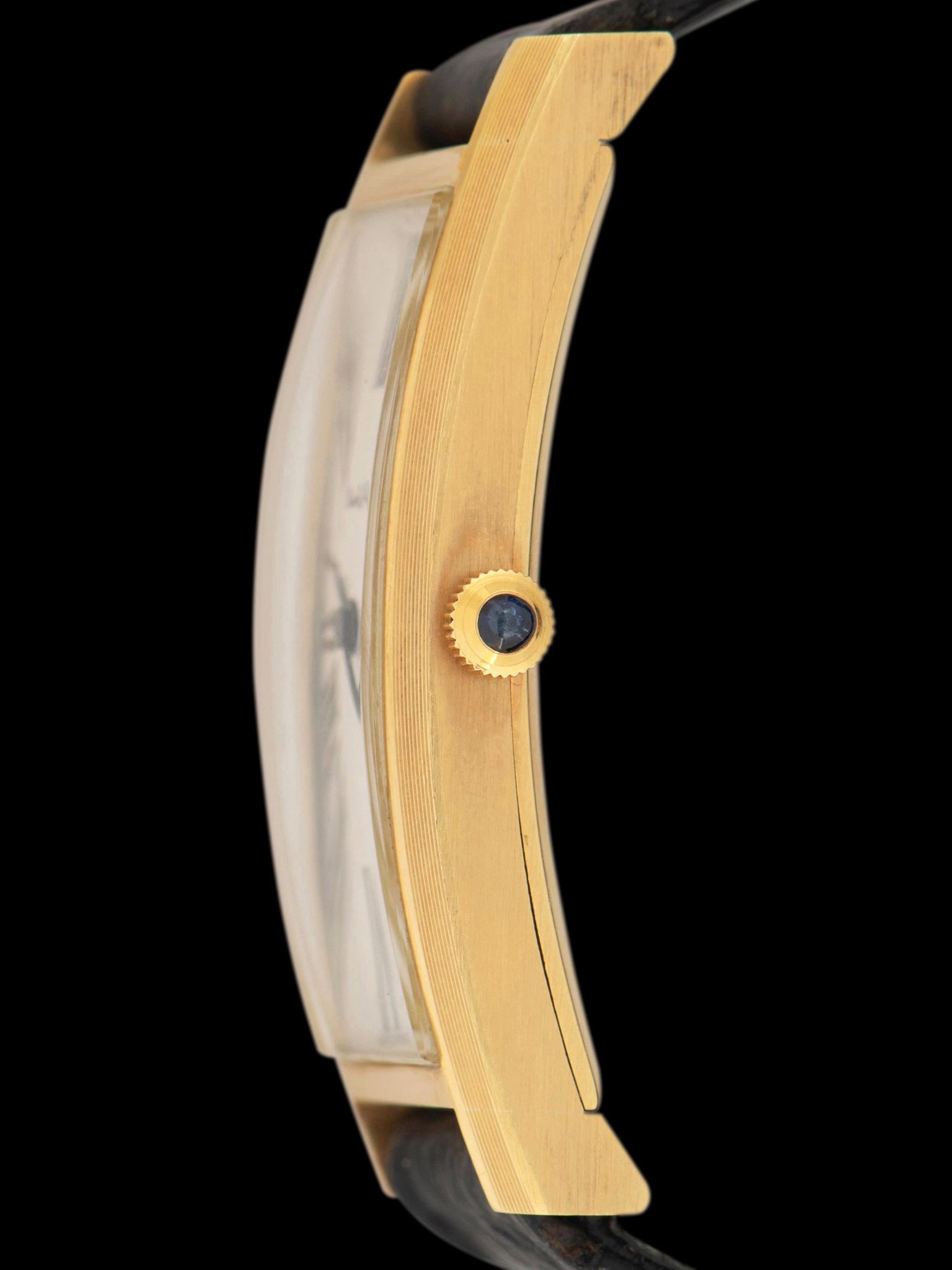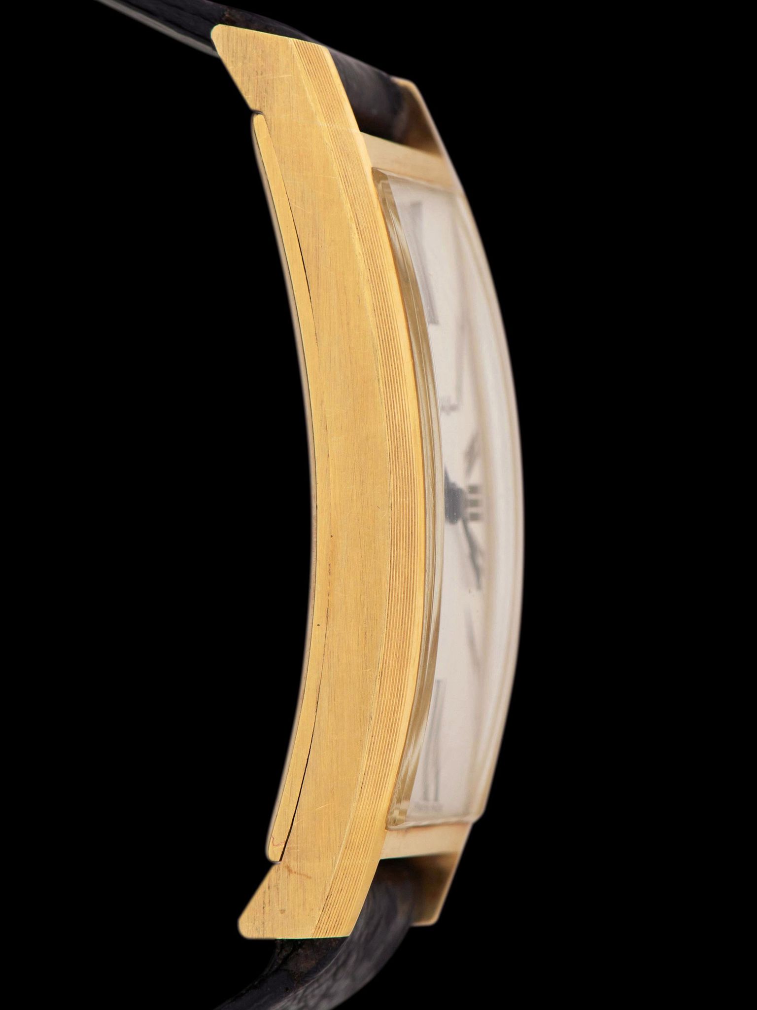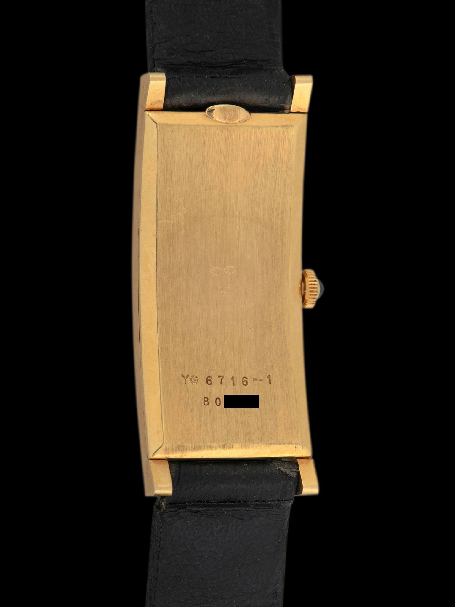 Executed in a similar fashion to the Tank Alongee created for Cartier, though with slightly reduced proportions, this 18K yellow gold "Cintree-style" Cuvex model features an elongated and slim rectangular shape with a dramatic curve that comfortably forms around the wrist. This particular example is especially special as it remains in exceptionally well-preserved condition, featuring an unpolished case, near-perfect dial, and its original strap and buckle.