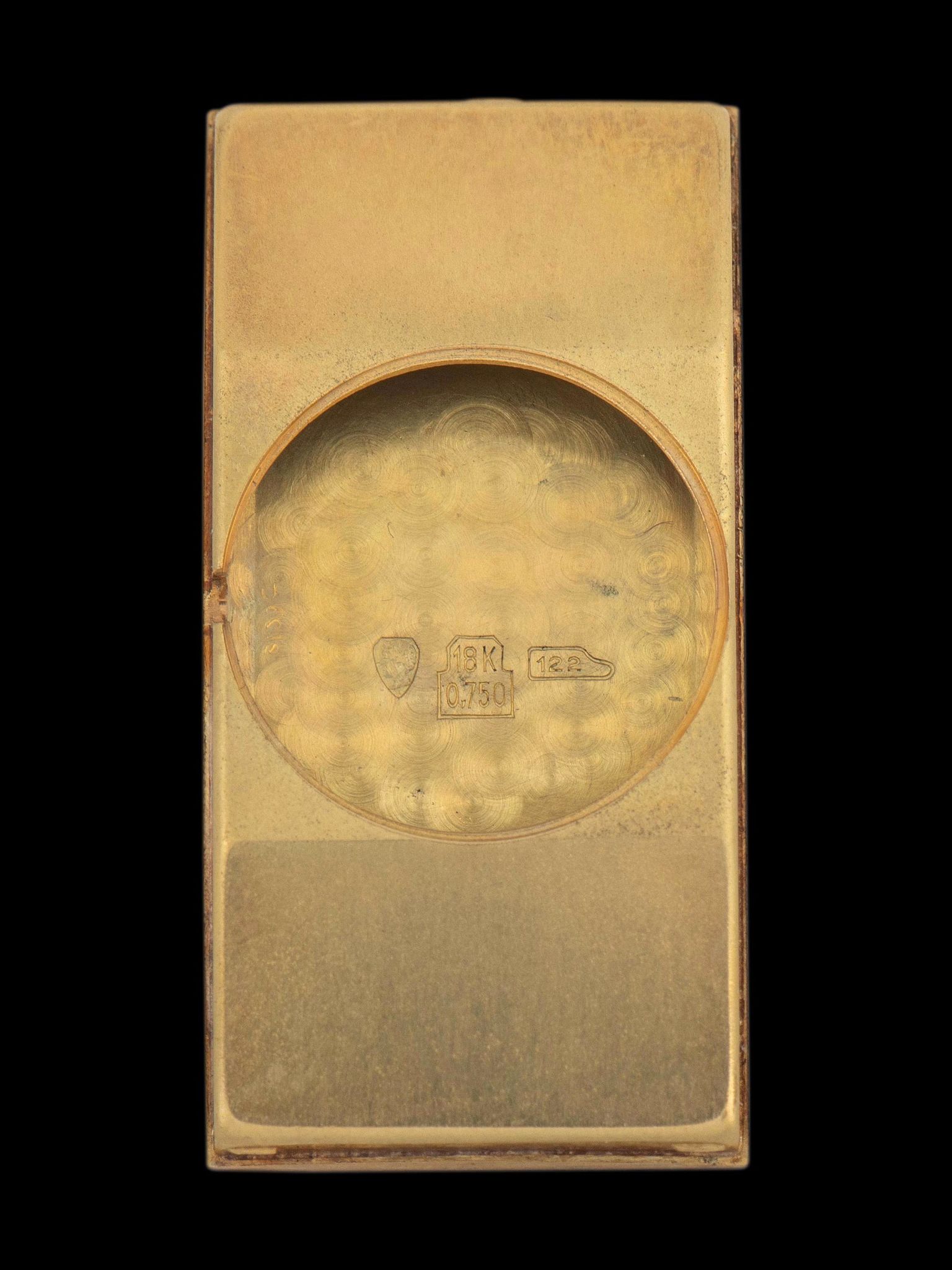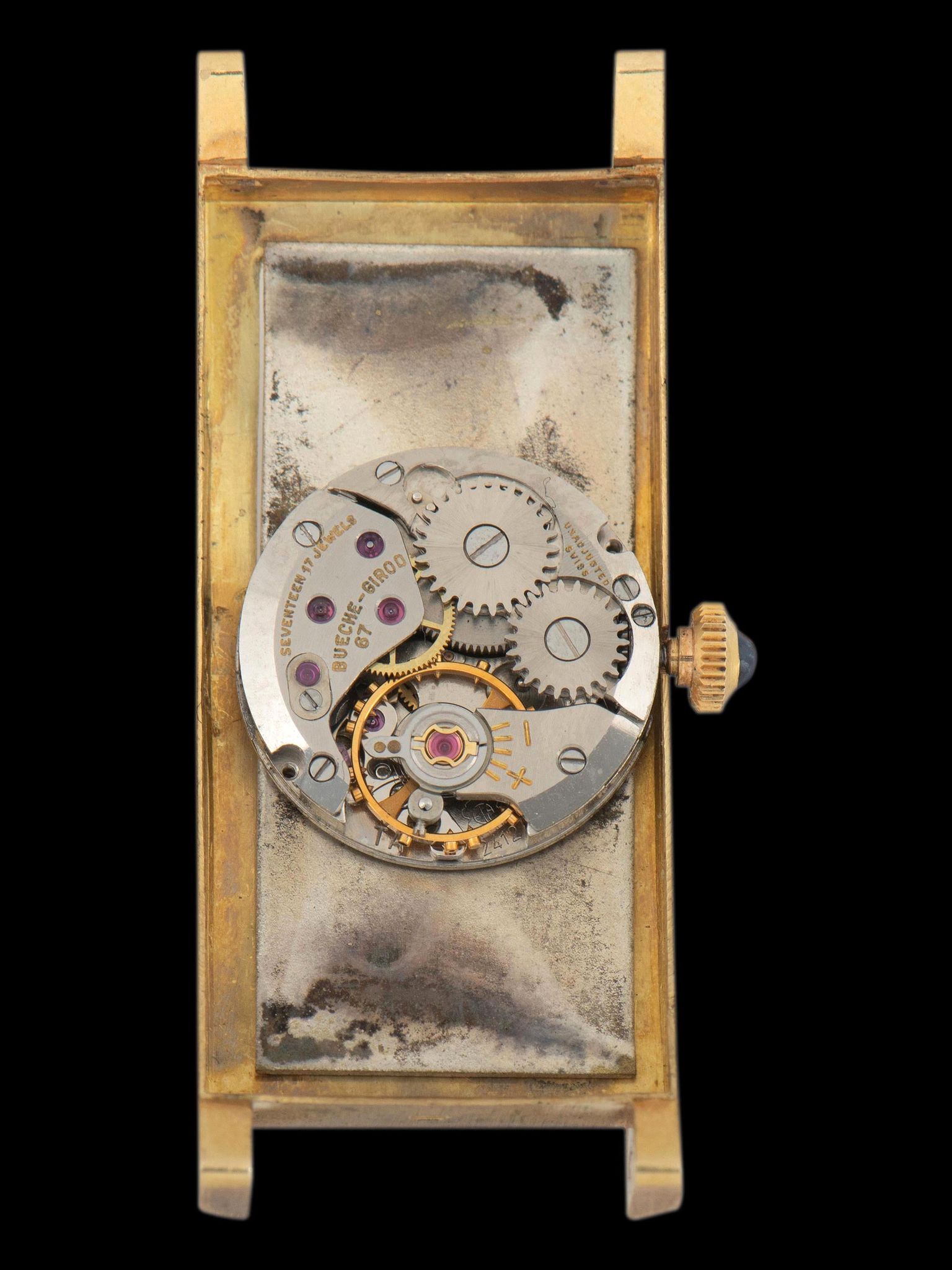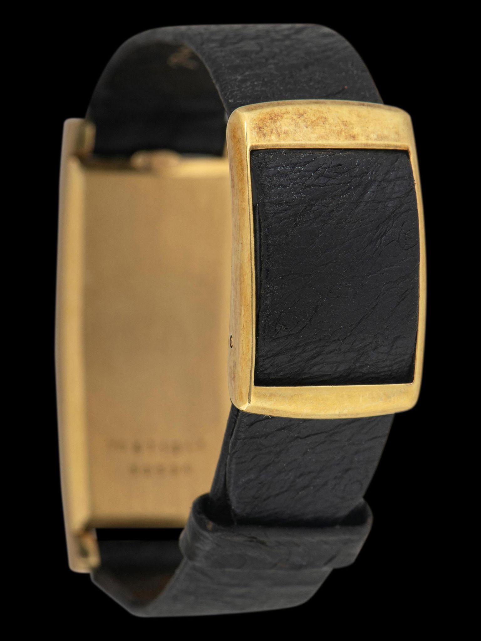 The unpolished 18K yellow gold Curvex case is absolutely stunning, showing nominal signs of previous use with the original factory finishing and details on full display and in extremely crisp condition. The case retains its original sapphire cabochon crown. The curved case back retains the original hallmarks and factory engravings in deep and crisp condition. The watch comes supplied on its original 2pb black Bueche Girod strap and original gold plaque buckle system.