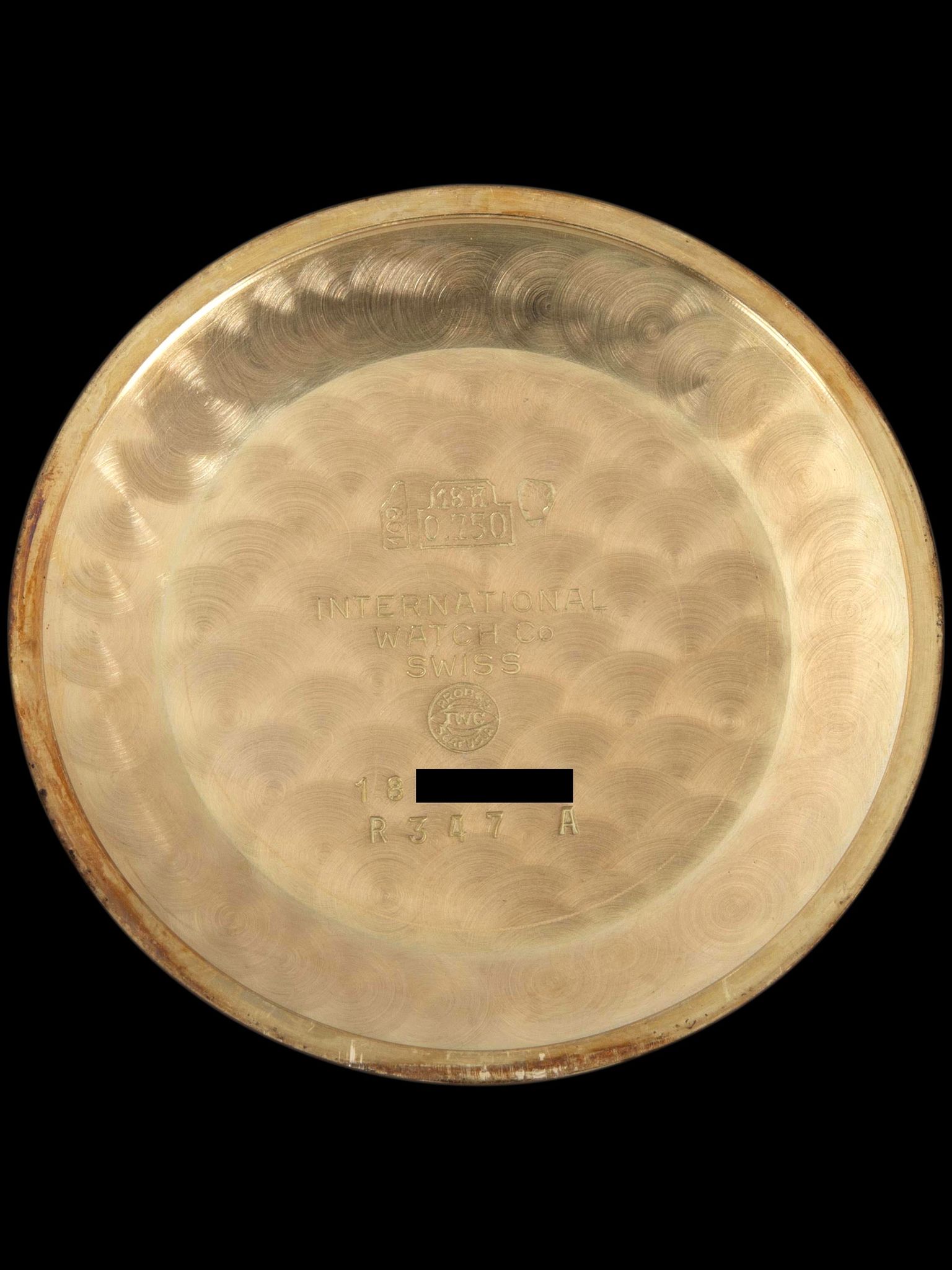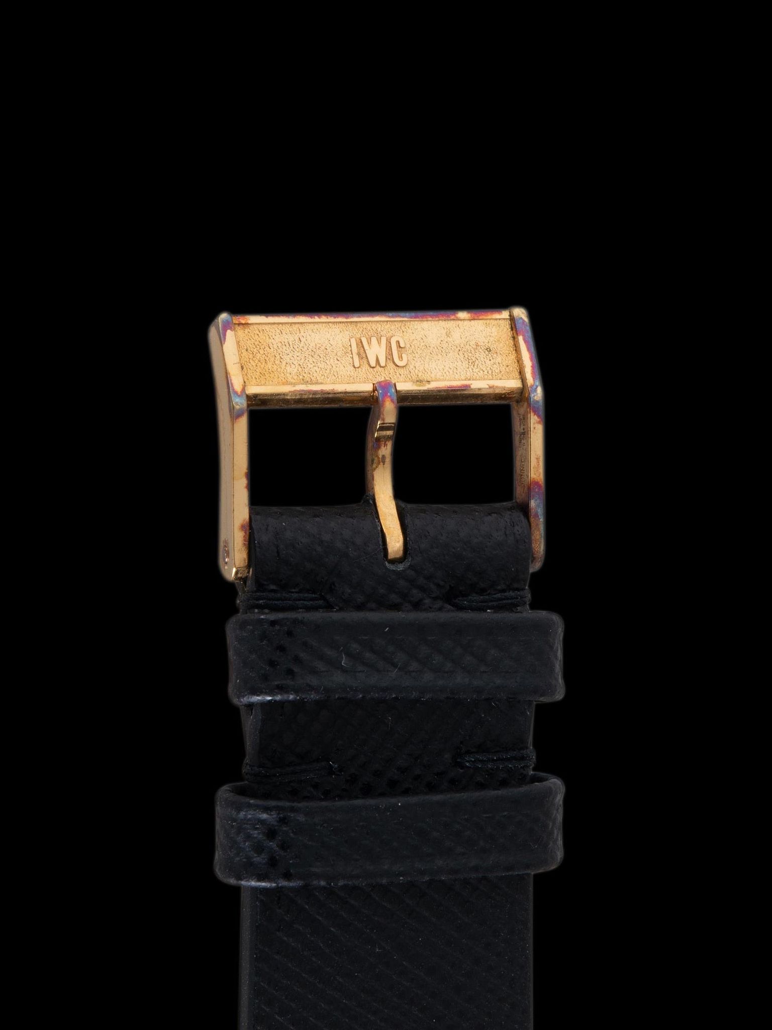 The crisp and unpolished 18K yellow gold case boasts a stunning patina with colors that range from deep reds, blue, to dark purple throughout the case sides and case back. The case retains strong factroy finishing and dimensions throughout with nominal evidence of previous use present. The unsigned crown is potentially a very early service replacement. The snap-on case back continued the colorful case patina and is in excellent condition. The watch comes supplied on a 2pc handmade leather strap with an original gold plaque IWC tang buckle.