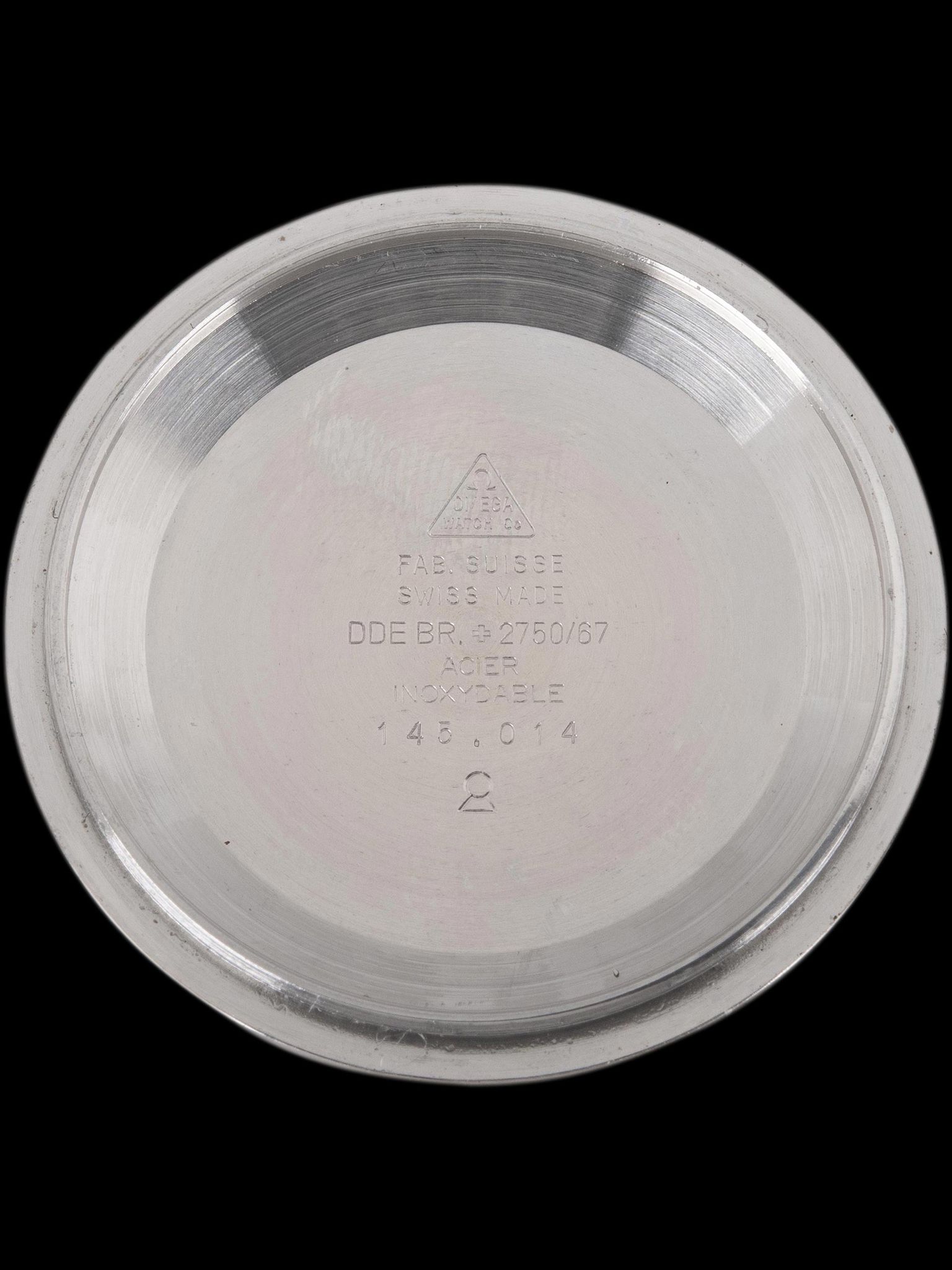 The original matte black dial is in virtually flawless condition, showing no damage or notable elements of age. The tritium markers have achieved a charming eggshell patina with no degradation present under UV light inspection. The original tritium hands have aged to a dark grey patina which is common in this era for Speedmaster, under UV light inspection the hands show no degradation.