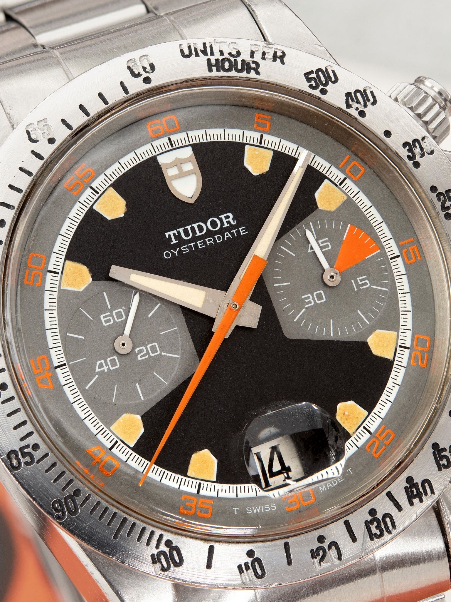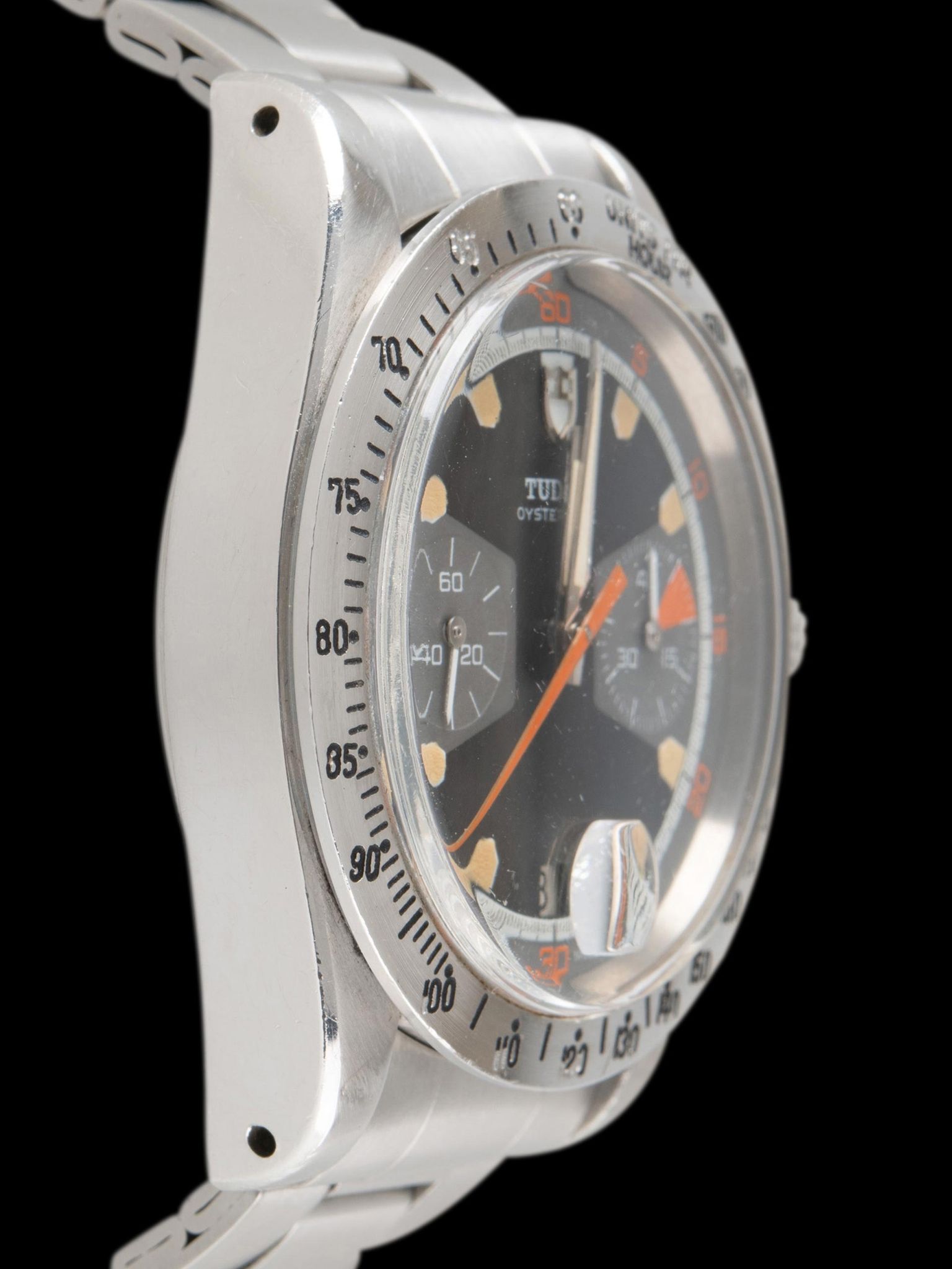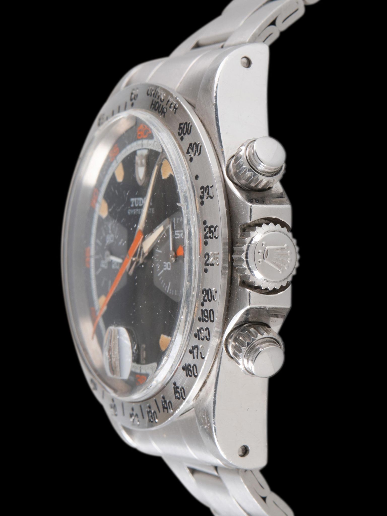 The exceptionally well-preserved and robust case maintains its original case finishing and chamfer details from the factory and is believed to remain in unpolished condition. The case shows honest signs of use throughout. The original fixed stainless steel "Units Per Hour" bezel shows gentle signs of use but is in excellent overall condition and retains most of its original black enamel. The screw-down pushers and Rolex-signed trip lock crown are later Rolex service units. The Rolex 9315 folded-link Oyster bracelet with 380 end pieces was sourced on the watch and features a replacement Tudor outer clasp. The bracelet retains 12 links that show almost no stretch and will fit up to a 7 3/4-inch wrist.